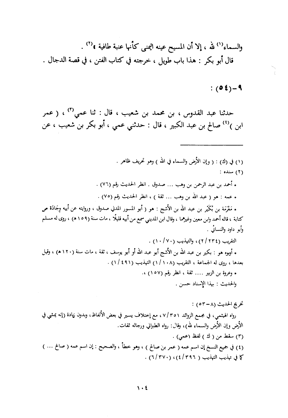 حَدَّثَنَا عَبْدُ الْقُدُّوسِ بْنُ مُحَمَّدِ بْنِ شُعَيْبٍ، قَالَ: ثنا عَمِّي عُمَرُ بْنُ صَالِحِ بْنِ عَبْدِ الْكَبِيرِ، قَالَ: حَدَّثَنِي عَمِّي أَبُو بَكْرِ بْنُ شُعَيْبٍ، عَنْ -[105]- أَبِيهِ، عَنْ أَنَسِ بْنِ مَالِكٍ، قَالَ: قَالَ رَسُولُ اللَّهِ صَلَّى اللهُ عَلَيْهِ وَسَلَّمَ: " §أُنْذِرُكُمُ الدَّجَّالَ، أَمَا إِنَّهُ أَعْوَرُ عَيْنِ الْيُمْنَى، وَإِنَّ رَبَّكُمْ لَيْسَ بِأَعْوَرَ، مَكْتُوبٌ بَيْنَ عَيْنَيْهِ: ك ف ر يَقْرَؤُهُ كُلُّ مُؤْمِنٍ يَقْرَأُ، وَكُلُّ مُؤْمِنٍ لَا يَقْرَأُ "
