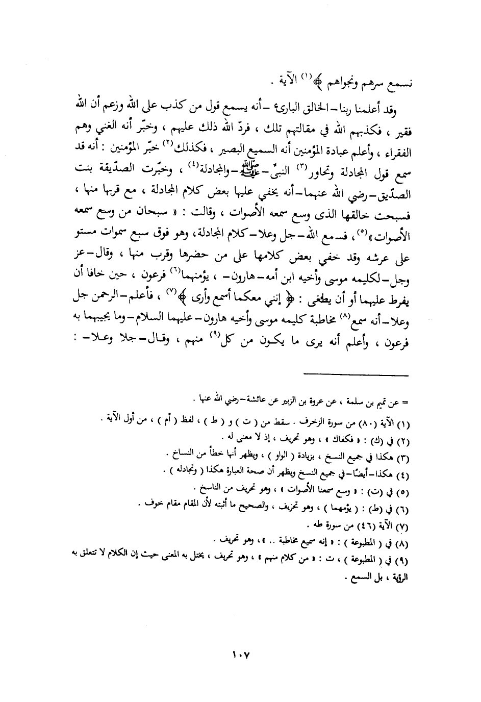 نَسْمَعُ سِرَّهُمْ وَنَجْوَاهُمْ} [الزخرف: 80] الْآيَةُ، وَقَدْ أَعْلَمَنَا رَبُّنَا الْخَالِقُ الْبَارِئُ أَنَّهُ يَسْمَعُ قَوْلَ مَنْ كَذَبَ عَلَى اللَّهِ وَزَعَمَ أَنَّ اللَّهَ فَقِيرٌ، فَكَذَّبَهُمُ اللَّهُ فِي مَقَالَتِهِمْ تِلْكَ، فَرَدَّ اللَّهُ ذَلِكَ عَلَيْهِمْ، وَخَبَّرَ أَنَّهُ الْغَنِيُّ وَهُمُ الْفُقَرَاءُ، وَأَعْلَمَ عِبَادَهُ الْمُؤْمِنِينَ أَنَّهُ السَّمِيعُ الْبَصِيرُ، فَكَذَلِكَ خَبَّرَ الْمُؤْمِنِينَ: أَنَّهُ قَدْ سَمِعَ قَوْلَ الْمُجَادِلَةِ وَتَحَاوُّرَ النَّبِيِّ صَلَّى اللهُ عَلَيْهِ وَسَلَّمَ وَالْمُجَادِلَةِ، وَخَبَّرَتِ الصِّدِّيقَةُ بِنْتُ الصِّدِّيقِ رَضِيَ اللَّهُ عَنْهُمَا أَنَّهُ يَخْفَى عَلَيْهَا بَعْضُ كَلَامِ الْمُجَادَلَةِ، مَعَ قُرْبِهَا مِنْهَا، فَسَبَّحَتْ خَالِقَهَا الَّذِي وَسِعَ سَمْعُهُ الْأَصْوَاتَ، وَقَالَتْ: «سُبْحَانَ مَنْ وَسِعَ سَمْعُهُ الْأَصْوَاتَ» فَسَمِعَ اللَّهُ جَلَّ وَعَلَا كَلَامَ الْمُجَادِلَةِ، وَهُوَ فَوْقَ سَبْعِ سَمَاوَاتٍ مُسْتَوٍ عَلَى عَرْشِهِ، وَقَدْ خَفِيَ بَعْضُ كَلَامِهَا عَلَى مَنْ حَضَرَهَا وَقَرُبَ مِنْهَا، وَقَالَ عَزَّ وَجَلَّ لِكَلِيمِهِ مُوسَى وَأَخِيهِ ابْنِ أُمِّهِ هَارُونَ، يُؤَمِّنُهُمَا فِرْعَوْنَ، حِينَ خَافَا أَنْ يَفْرُطَ عَلَيْهِمَا، أَوْ أَنْ يَطْغَى: {إِنَّنِي مَعَكُمَا أَسْمَعُ وَأَرَى} [طه: 46] فَأَعْلَمَ الرَّحْمَنُ جَلَّ وَعَلَا أَنَّهُ سَمِعَ مُخَاطَبَةَ كَلِيمِهِ مُوسَى وَأَخِيهِ هَارُونَ عَلَيْهِمَا السَّلَامُ، وَمَا يُجِيبُهُمَا بِهِ فِرْعَوْنَ، وَأَعْلَمَ أَنَّهُ يَرَى مَا يَكُونُ مِنْ كُلٍّ مِنْهُمْ، وَقَالَ جَلَّ وَعَلَا
