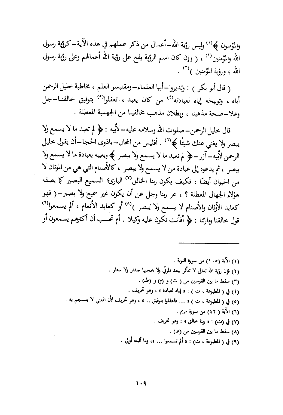 وَالْمُؤْمِنُونَ} [التوبة: 105] ، وَلَيْسَ رُؤْيَةُ اللَّهِ أَعْمَالَ مَنْ ذَكَرَ عَمَلَهُمْ فِي هَذِهِ الْآيَةِ، كَرُؤْيَةِ رَسُولِ اللَّهِ وَالْمُؤْمِنِينَ، وَإِنْ كَانَ اسْمُ الرُّؤْيَةِ يَقَعُ عَلَى رُؤْيَةِ اللَّهِ أَعْمَالَهُمْ، وَعَلَى رُؤْيَةِ رَسُولِ اللَّهِ، وَرُؤْيَةِ الْمُؤْمِنِينَ قَالَ أَبُو بَكْرٍ: وَتَدَبَّرُوا أَيُّهَا الْعُلَمَاءُ، وَمُقْتَبِسُوا الْعِلْمَ، مُخَاطَبَةَ خَلِيلِ الرَّحْمَنِ أَبَاهُ، وَتَوْبِيخَهُ إِيَّاهُ لِعِبَادَتِهِ مَنْ كَانَ يَعْبُدُ، تَعْقِلُوا بِتَوْفِيقِ خَالِقِنَا جَلَّ وَعَلَا، صِحَّةَ مَذْهَبِنَا، وَبُطْلَانَ مَذْهَبِ مُخَالِفِينَا مِنَ الْجَهْمِيَّةِ الْمُعَطِّلَةِ قَالَ خَلِيلُ الرَّحْمَنِ صَلَوَاتُ اللَّهِ وَسَلَامُهُ عَلَيْهِ، لِأَبِيهِ: {لِمَ تَعْبُدُ مَا لَا يَسْمَعُ وَلَا يُبْصِرُ وَلَا يُغْنِي عَنْكَ شَيْئًا} [مريم: 42] أَفَلَيْسَ مِنَ الْمِحَالِ يَا ذَوِي الْحِجَا، أَنْ يَقُولَ خَلِيلُ الرَّحْمَنِ لِأَبِيهِ آزَرَ: {لِمَ تَعْبُدُ مَا لَا يَسْمَعُ وَلَا يُبْصِرُ} [مريم: 42] ، وَيَعِيبُهُ بِعِبَادَةِ مَا لَا يَسْمَعُ، وَلَا يُبْصِرُ، ثُمَّ يَدْعُوهُ إِلَى عِبَادَةِ مَنْ لَا يَسْمَعُ، وَلَا يُبْصِرُ، كَالْأَصْنَامِ الَّتِي هِيَ مِنَ الْمَوْتَانِ، لَا مِنَ الْحَيَوَانِ أَيْضًا، فَكَيْفَ يَكُونُ رَبُّنَا الْخَالِقُ الْبَارِئُ السَّمِيعُ الْبَصِيرُ كَمَا يَصِفُهُ هَؤُلَاءِ الْجُهَّالُ الْمُعَطِّلَةُ؟، عَزَّ رَبُّنَا وَجَلَّ عَنْ أَنْ يَكُونَ غَيْرَ سَمِيعٍ، وَلَا بَصِيرٍ، فَهُوَ كَعَابِدِ الْأَوْثَانِ وَالْأَصْنَامِ لَا يَسْمَعُ وَلَا يُبْصِرُ، أَوْ كَعَابِدِ الْأَنْعَامِ، أَلَمْ يَسْمَعُوا قَوْلَ خَالِقِنَا وَبَارِئِنَا: {أَفَأَنْتَ تَكُونُ عَلَيْهِ وَكِيلًا، أَمْ تَحْسَبُ أَنَّ أَكْثَرَهُمُ يَسْمَعُونَ أَوْ