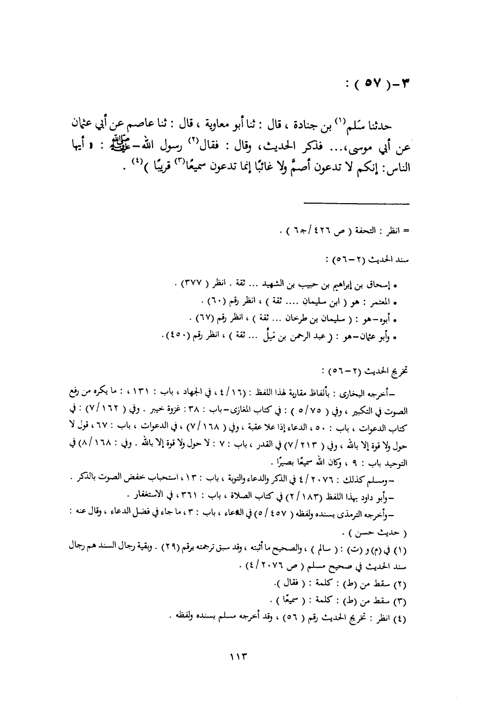 حَدَّثَنَا سَلْمُ بْنُ جُنَادَةَ، قَالَ: ثنا أَبُو مُعَاوِيَةَ، قَالَ: ثنا عَاصِمٌ، عَنْ أَبِي عُثْمَانَ، عَنْ أَبِي مُوسَى، فَذَكَرَ الْحَدِيثَ , وَقَالَ: فَقَالَ رَسُولُ اللَّهِ صَلَّى اللهُ عَلَيْهِ وَسَلَّمَ: " أَيُّهَا النَّاسُ: §إِنَّكُمْ لَا تَدْعُونَ أَصَمَّ وَلَا غَائِبًا , إِنَّمَا تَدْعُونَ سَمِيعًا قَرِيبًا " -[114]- خَرَّجْتُ طُرُقَ هَذَا الْخَبَرِ فِي كِتَابِ الذِّكْرِ وَالتَّسْبِيحِ قَالَ أَبُو بَكْرٍ: فَاسْمَعُوا يَا ذَوِي الْحِجَا مَا نَقُولُ فِي هَذَا الْبَابِ , وَنَذْكُرُ بَهْتَ الْجَهْمِيَّةِ وَزُورَهُمْ وَكَذِبَهُمْ عَلَى عُلَمَاءِ أَهْلِ الْآثَارِ , وَرَمْيَهُمْ خِيَارَ الْخَلْقِ بَعْدَ الْأَنْبِيَاءِ بِمَا اللَّهُ قَدْ نَزَّهَهُمْ عَنْهُ، وَبَرَّأَهُمْ مِنْهُ بِتَزَوُّرِ الْجَهْمِيَّةِ عَلَى عُلَمَائِنَا إِنَّهُمْ مُشَبِّهَةٌ، فَاسْمَعُوا مَا أَقُولُ وَأُبَيِّنُ مِنْ مَذَاهِبِ عُلَمَائِنَا تَعْلَمُوا وَتَسْتَيْقِنُوا بِتَوْفِيقِ خَالِقِنَا أَنَّ هَؤُلَاءِ الْمُعَطِّلَةَ يَبْهَتُونَ الْعُلَمَاءَ وَيَرْمُونَهُمْ بِمَا اللَّهُ نَزَّهَهُمْ عَنْهُ نَحْنُ نَقُولُ: لِرَبِّنَا الْخَالِقِ عَيْنَانِ يُبْصِرُ بِهِمَا مَا تَحْتَ الثَّرَى , وَتَحْتَ الْأَرْضِ السَّابِعَةِ السُّفْلَى، وَمَا فِي السَّمَاوَاتِ الْعُلَى، وَمَا بَيْنَهُمَا مِنْ صَغِيرٍ وَكَبِيرٍ، لَا يُخْفَى عَلَى خَالِقِنَا خَافِيَةٌ فِي السَّمَاوَاتِ السَّبْعِ وَالْأَرَضِينَ السَّبْعِ، وَلَا مِمَّا بَيْنَهُمْ وَلَا فَوْقَهُمْ، وَلَا أَسْفَلَ مِنْهُنَّ لَا يَغِيبُ عَنْ بَصَرِهِ مِنْ ذَلِكَ شَيْءٌ، يَرَى مَا فِي جَوْفِ الْبِحَارِ وَلُجَجِهَا كَمَا يَرَى عَرْشَهُ الَّذِي هُوَ مُسْتَوٍ عَلَيْهِ وَبَنُو آدَمَ وَإِنْ كَانَتْ لَهُمْ عُيُونٌ يُبْصِرُونَ بِهَا فَإِنَّهُمْ إِنَّمَا يَرَوْنَ مَا قَرُبَ مِنْ أَبْصَارِهِمْ، مِمَّا لَا حِجَابَ وَلَا سِتْرَ بَيْنَ الْمَرَئِيِّ وَبَيْنَ أَبْصَارِهِمْ، وَمَا يَبْعُدُ مِنْهُمْ , إِنْ كَانَ يَقَعُ اسْمُ الْقُرْبِ عَلَيْهِ فِي بَعْضِ الْأَحْوَالِ، لِأَنَّ الْعَرَبَ الَّتِي خُوطِبْنَا بَلَغْتِهَا قَدْ تَقُولُ: قَرْيَةُ كَذَا مِنَّا قَرِيبَةٌ، وَبَلْدَةٌ كَذَا قَرِيبَةٌ مِنَّا , وَمِنْ بَلَدِنَا، وَمَنْزِلُ فُلَانٍ قَرِيبٌ مِنَّا -[115]-، وَإِنْ كَانَ بَيْنَ الْبَلَدَيْنِ وَبَيْنَ الْقَرْيَتَيْنِ وَبَيْنَ الْمَنْزِلَيْنِ فَرَاسِخُ وَالْبَصِيرُ مِنْ بَنِي آدَمَ لَا يُدْرِكُ بِبَصَرِهِ شَخْصًا آخَرَ، مِنْ بَنِي آدَمَ، وَبَيْنَهُمَا فَرْسَخَانِ فَأَكْثَرُ، وَكَذَلِكَ لَا يَرَى أَحَدٌ مِنَ الْآدَمِيِّينَ مَا تَحْتَ الْأَرْضِ إِذَا كَانَ فَوْقَ الْمَرَئِيِّ مِنَ الْأَرْضِ وَالتُّرَابِ قَدْرَ أُنْمُلَةٍ، أَوْ أَقَلَّ مِنْهَا بِقَدْرِ مَا يُغَطَّى وَيُوَارَى الشَّيْءُ، وَكَذَلِكَ لَا يُدْرِكُ بَصَرُهُ إِذَا كَانَ بَيْنَهُمَا حِجَابٌ مِنْ حَائِطٍ , أَوْ ثَوْبٍ صَفِيقٍ , أَوْ غَيْرِهِمَا مِمَّا يَسْتُرُ الشَّيْءَ عَنْ عَيْنِ النَّاظِرِ، فَكَيْفَ يَكُونُ يَا ذَوِي الْحِجَا مُشَبِّهًا مَنْ يَصِفُ عَيْنَ اللَّهِ بِمَا ذَكَرْنَا، وَأَعْيُنُ بَنِي آدَمَ بِمَا وَصَفْنَا وَنَزِيدُ شَرْحًا وَبَيَانًا نَقُولُ: عَيْنُ اللَّهِ عَزَّ وَجَلَّ قَدِيمَةٌ، لَمْ تَزَلْ بَاقِيَةً، وَلَا يَزَالُ مَحْكُومٌ لَهَا بِالْبَقَاءِ، مَنْفِيٌّ عَنْهَا الْهَلَاكُ، وَالْفَنَاءُ , وَعُيُونُ بَنِي آدَمَ مُحْدَثَةٌ مَخْلُوقَةٌ، كَانَتْ عَدَمًا غَيْرَ مُكَوَّنَةٍ , فَكَوَّنَهَا اللَّهُ , وَخَلَقَهَا بِكَلَامِهِ الَّذِي هُوَ: صِفَةٌ مِنْ صِفَاتِ ذَاتِهِ، وَقَدْ قَضَى اللَّهُ وَقَدَّرَ أَنَّ عُيُونَ بَنَى آدَمَ تَصِيرُ إِلَى بَلَاءٍ، عَنْ قَلِيلٍ , وَاللَّهُ نَسْأَلُ خَيْرَ ذَلِكَ الْمَصِيرِ , وَقَ