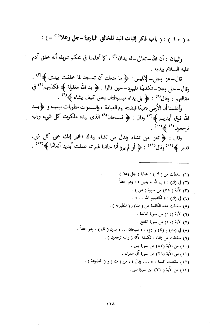 §بَابُ ذِكْرِ إِثْبَاتِ الْيَدِ لِلْخَالِقِ الْبَارِئِ جَلَّ وَعَلَا وَالْبَيَانُ: أَنَّ اللَّهَ تَعَالَى لَهُ يَدَانِ، كَمَا أَعْلَمَنَا فِي مُحْكَمِ تَنْزِيلِهِ أَنَّهُ خَلَقَ آدَمَ عَلَيْهِ السَّلَامُ بِيَدَيْهِ قَالَ عَزَّ وَجَلَّ لِإِبْلِيسَ: {مَا مَنَعَكَ أَنْ تَسْجُدَ لِمَا خَلَقْتُ بِيَدَيَّ} [ص: 75] وَقَالَ جَلَّ وَعَلَا تَكْذِيبًا لِلْيَهُودِ حِينَ قَالُوا: {يَدُ اللَّهِ مَغْلُولَةٌ} [المائدة: 64] , فَكَذَّبَهُمْ فِي مَقَالَتِهِمْ، وَقَالَ: {بَلْ يَدَاهُ مَبْسُوطَتَانِ يُنْفِقُ كَيْفَ يَشَاءُ} [المائدة: 64] أَعْلَمَنَا أَنَّ الْأَرْضَ جَمِيعًا قَبْضَتُهُ يَوْمَ الْقِيَامَةِ، وَالسَّمَاوَاتُ مَطْوِيَّاتٌ بِيَمِينِهِ , وَ {يَدُ اللَّهِ فَوْقَ أَيْدِيهِمْ} [الفتح: 10] , وَقَالَ: {فَسُبْحَانَ الَّذِي بِيَدِهِ مَلَكُوتُ كُلِّ شَيْءٍ وَإِلَيْهِ تَرْجَعُونَ} [يس: 83] وَقَالَ: {تُعِزُّ مَنْ تَشَاءُ وَتُذِلُّ مَنْ تَشَاءُ بِيَدِكَ الْخَيْرُ إِنَّكَ عَلَى كُلِّ شَيْءٍ قَدِيرٌ} [آل عمران: 26] , وَقَالَ: {أَوَلَمْ يَرَوْا أَنَّا خَلَقْنَا لَهُمْ مِمَّا عَمِلَتْ أَيْدِينَا أَنْعَامًا} [يس: 71]