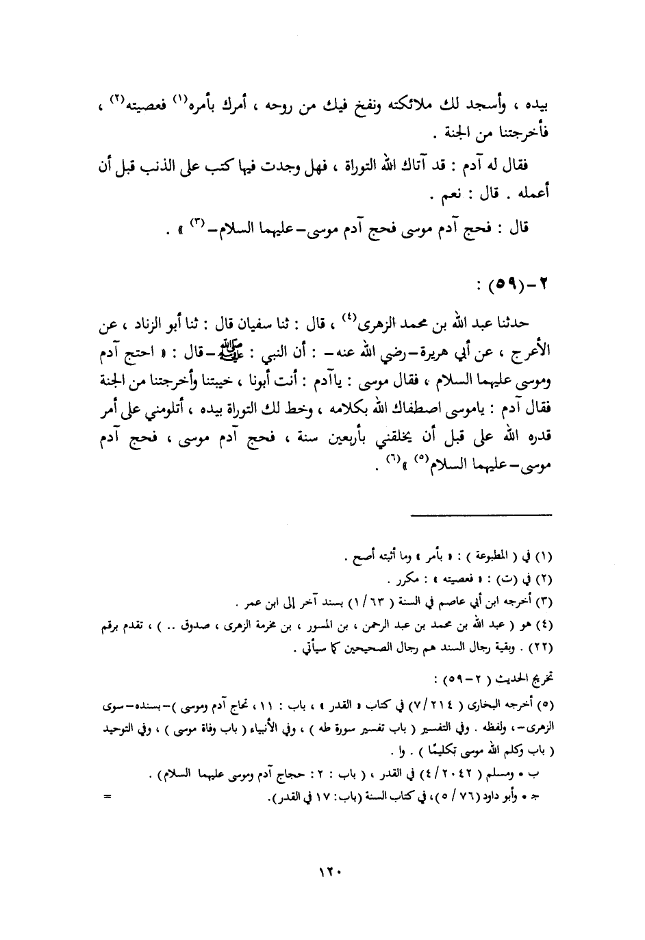 حَدَّثَنَا عَبْدُ اللَّهِ بْنُ مُحَمَّدٍ الزُّهْرِيُّ، قَالَ: ثنا سُفْيَانُ، قَالَ: ثنا أَبُو الزِّنَادِ، عَنِ الْأَعْرَجِ، عَنْ أَبِي هُرَيْرَةَ، رَضِيَ اللَّهُ عَنْهُ: أَنَّ النَّبِيَّ صَلَّى اللهُ عَلَيْهِ وَسَلَّمَ قَالَ: " §احْتَجَّ آدَمَ وَمُوسَى عَلَيْهِمَا السَّلَامُ , فَقَالَ مُوسَى: يَا آدَمَ , أَنْتَ أَبُونَا، خَيَّبْتَنَا وَأَخْرَجْتَنَا مِنَ الْجَنَّةِ , فَقَالَ آدَمَ: يَا مُوسَى , اصْطَفَاكَ اللَّهُ بِكَلَامِهِ، وَخَطَّ لَكَ التَّوْرَاةَ بِيَدِهِ، أَتَلُومُنِي عَلَى أَمْرٍ قَدَّرَهُ اللَّهُ عَلَيَّ قَبْلَ أَنْ يَخْلُقَنِي بِأَرْبَعِينَ سَنَةً، فَحَجَّ آدَمَ مُوسَى، فَحَجَّ آدَمَ مُوسَى عَلَيْهِمَا السَّلَامُ " -[121]- حَدَّثَنَا عَمْرُو بْنُ عَلِيٍّ، قَالَ: ثنا الْمُعْتَمِرُ، قَالَ: ثنا مُحَمَّدُ بْنُ عَمْرٍو، عَنْ أَبِي سَلَمَةَ -[122]-، عَنْ أَبِي هُرَيْرَةَ، رَضِيَ اللَّهُ عَنْهُ قَالَ: قَالَ رَسُولُ اللَّهِ صَلَّى اللهُ عَلَيْهِ وَسَلَّمَ: «احْتَجَّ آدَمَ وَمُوسَى عَلَيْهِمَا السَّلَامُ» , فَذَكَرَ عَمْرٌو الْحَدِيثَ حَدَّثَنَا عَمْرٌو، قَالَ: ثنا يَحْيَى بْنُ سَعِيدٍ، قَالَ: ثنا مُحَمَّدُ بْنُ عَمْرٍو، قَالَ: ثنا أَبُو سَلَمَةَ، عَنْ أَبِي هُرَيْرَةَ، رَضِيَ اللَّهُ عَنْهُ قَالَ: قَالَ رَسُولُ اللَّهِ صَلَّى اللهُ عَلَيْهِ وَسَلَّمَ وَثَنَا عَمْرُو بْنُ مُرَّةَ، الْحَدِيثَ -[123]- وَثَنَا يَحْيَى بْنُ حَكِيمٍ، قَالَ: ثَنَا عَبْدُ الْوَهَّابِ، قَالَ: ثَنَا مُحَمَّدُ بْنُ عَمْرٍو، فَذَكَرَ الْحَدِيثَ نَحْوَهُ حَدَّثَنَا أَحْمَدُ بْنُ ثَابِتٍ الْجَحْدَرِيُّ، قَالَ: ثنا صَفْوَانُ يَعْنِي ابْنَ عِيسَى، قَالَ: ثنا الْحَارِثُ بْنُ عَبْدِ الرَّحْمَنِ، قَالَ: أَخْبَرَنِي يَزِيدُ بْنُ هُرْمُزَ، عَنْ أَبِي هُرَيْرَةَ، رَضِيَ اللَّهُ عَنْهُ قَالَ: قَالَ رَسُولُ اللَّهِ صَلَّى اللهُ عَلَيْهِ وَسَلَّمَ: " احْتَجَّ آدَمَ وَمُوسَى عَلَيْهِمَا السَّلَامُ، فَقَالَ مُوسَى: أَنْتَ آدَمَ، خَلَقَكَ اللَّهُ بِيَدِهِ " , فَذَكَرَ الْحَدِيثَ بِطُولِهِ، قَدْ أَمْلَيْتُهُ فِي كِتَابِ الْقَدَرِ -[124]- حَدَّثَنَا أَحْمَدُ بْنُ ثَابِتٍ قَالَ: ثنا صَفْوَانُ عَنِ الْحَارِثِ، قَالَ: أَخْبَرَنِي عَبْدُ الرَّحْمَنِ بْنُ هُرْمُزَ الْأَعْرَجُ، عَنْ أَبِي هُرَيْرَةَ مِثْلَ هَذَا الْحَدِيثِ , لَمْ يَزِدْ , وَلَمْ يَنْقُصْ حَدَّثَنَا مُحَمَّدُ بْنُ بَشَّارٍ، وَأَبُو مُوسَى قَالَا: ثنا يَحْيَى، قَالَ: بُنْدَارٌ , ثنا مُحَمَّدُ بْنُ عَمْرٍو، وَقَالَ: أَبُو مُوسَى، عَنْ مُحَمَّدِ بْنِ عَمْرٍو، قَالَ: ثنا أَبُو سَلَمَةَ، عَنْ أَبِي هُرَيْرَةَ، رَضِيَ اللَّهُ عَنْهُ قَالَ: قَالَ رَسُولُ اللَّهِ صَلَّى اللهُ عَلَيْهِ وَسَلَّمَ: " احْتَجَّ آدَمُ وَمُوسَى , فَقَالَ لَهُ مُوسَى: أَنْتَ آدَمَ الَّذِي خَلَقَكَ اللَّهُ بِيَدِهِ وَنَفَخَ فِيكَ مِنْ رُوحِهِ، وَأَسْكَنَكَ جَنَّتَهُ " , فَذَكَرَ الْحَدِيثَ بِطُولِهِ حَدَّثَنَا يُوسُفُ بْنُ مُوسَى، قَالَ: ثنا جَرِيرٌ، عَنِ الْأَعْمَشِ، عَنْ أَبِي -[125]- صَالِحٍ، عَنْ أَبِي هُرَيْرَةَ، رَضِيَ اللَّهُ عَنْهُ قَالَ: قَالَ رَسُولُ اللَّهِ صَلَّى اللهُ عَلَيْهِ وَسَلَّمَ: " احْتَجَّ آدَمُ وَمُوسَى , فَقَالَ مُوسَى: يَا آدَمُ , أَنْتَ خَلَقَكَ اللَّهُ بِيَدِهِ، وَنَفَخَ فِيكَ مِنْ رُوحِهِ " , وَذَكَرَ الْحَدِيثَ بِطُولِهِ حَدَّثَنَا مُحَمَّدُ بْنُ بَشَّارٍ، قَالَ: ثنا يَحْيَى بْنُ حَمَّادٍ، قَالَ: ثنا أَبُو عَوَانَةَ، عَنْ سُلَيْمَانَ وَهُوَ الْأَعْمَشُ بِهَذَا الْإِسْنَادِ مِثْلَهُ قَالَ أَبُو بَكْرٍ: هَذَا الْبَابُ قَدْ أَمْلَيْتُهُ بِتَمَامِهِ فِي كِتَابِ الْقَدَرِ , قَالَ أَبُو بَكْرٍ: فَكَلِيمُ اللَّهِ خَاطَبَ آدَمَ عَلَيْهِمَا السَّلَامُ , أَنَّ اللَّهَ خَلَقَهُ بِيَدِهِ , وَنَفَخَ فِيهِ