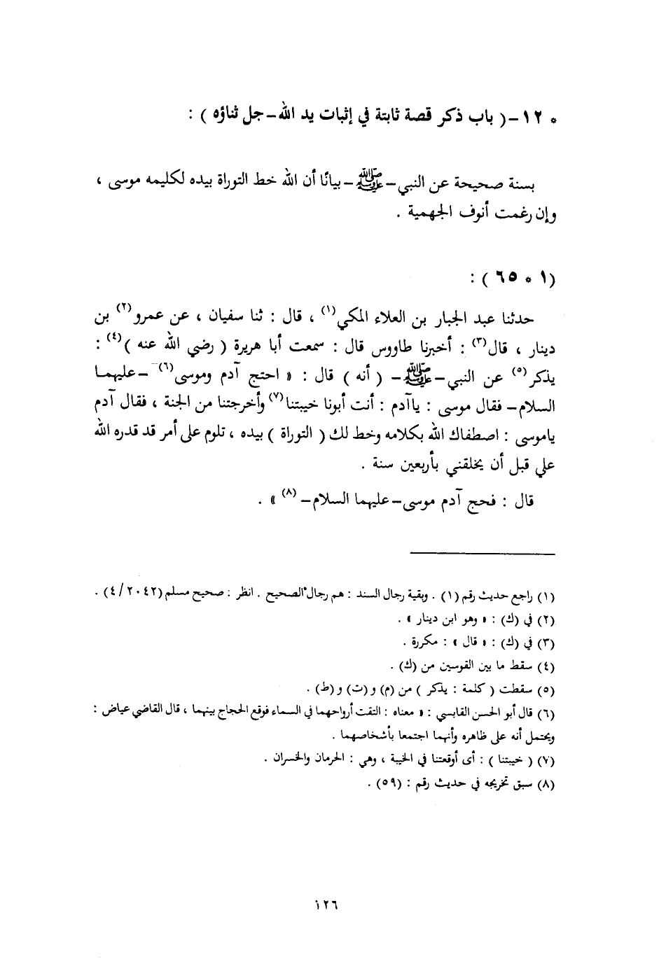حَدَّثَنَا عَبْدُ الْجَبَّارِ بْنُ الْعَلَاءِ الْمَكِّيُّ، قَالَ: ثنا سُفْيَانُ، عَنْ عَمْرِو بْنِ دِينَارٍ، قَالَ: أَخْبَرَنَا طَاوُسٌ، قَالَ: سَمِعْتُ أَبَا هُرَيْرَةَ، رَضِيَ اللَّهُ عَنْهُ: يَذْكُرُ عَنِ النَّبِيِّ صَلَّى اللهُ عَلَيْهِ وَسَلَّمَ أَنَّهُ قَالَ: " §احْتَجَّ آدَمُ وَمُوسَى عَلَيْهِمَا السَّلَامُ , فَقَالَ مُوسَى: يَا آدَمُ: أَنْتَ أَبُونَا خَيَّبْتَنَا وَأَخْرَجْتَنَا مِنَ الْجَنَّةِ، فَقَالَ آدَمُ يَا مُوسَى: اصْطَفَاكَ اللَّهُ بِكَلَامِهِ , وَخَطَّ لَكَ التَّوْرَاةَ بِيَدِهِ، تَلُومُ عَلَيَّ أَمْرًا قَدْ قَدَّرَهُ اللَّهُ عَلَيَّ قَبْلَ أَنْ يَخْلُقَنِي بِأَرْبَعِينَ سَنَةً , قَالَ: فَحَجَّ آدَمُ مُوسَى عَلَيْهِمَا السَّلَامُ " -[127]- حَدَّثَنَا الْحَسَنُ بْنُ مُحَمَّدٍ الزَّعْفَرَانِيُّ، قَالَ: ثنا سُفْيَانُ بْنُ عُيَيْنَةَ، عَنْ عَمْرٍو وَهُوَ ابْنُ دِينَارٍ، عَنْ طَاوُسٍ أَنَّهُ سَمِعَ أَبَا هُرَيْرَةَ يَقُولُ: قَالَ رَسُولُ اللَّهِ صَلَّى اللهُ عَلَيْهِ وَسَلَّمَ: بِمِثْلِهِ، وَقَالَ: " وَخَطَّ لَكَ التَّوْرَاةَ بِيَدِهِ، وَلَمْ يَذْكُرْ: «فَحَجَّ آدَمُ مُوسَى» حَدَّثَنَا عَمْرُو بْنُ عَلِيٍّ، قَالَ: ثنا سُفْيَانُ، عَنْ عَمْرِو بْنِ دِينَارٍ، عَنْ طَاوُسٍ أَنَّهُ سَمِعَ أَبَا هُرَيْرَةَ رَضِيَ اللَّهُ عَنْهُ قَالَ: قَالَ رَسُولُ اللَّهِ صَلَّى اللهُ عَلَيْهِ وَسَلَّمَ بِمِثْلِ حَدِيثِ عَبْدِ الْجَبَّارِ، وَقَالَ: «وَخَطَّ لَكَ التَّوْرَاةَ بِيَدِهِ» وَقَالَ: «أَتَلُومُنِي»