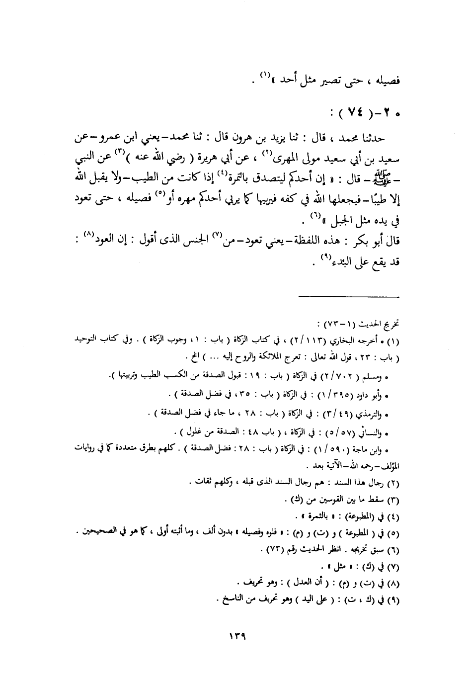 حَدَّثَنَا مُحَمَّدٌ، قَالَ: ثنا يَزِيدُ بْنُ هَارُونَ، قَالَ: ثنا مُحَمَّدٌ يَعْنِي ابْنَ عَمْرٍو، عَنْ سَعِيدِ بْنِ أَبِي سَعِيدٍ، مَوْلَى الْمَهْرِيِّ، عَنْ أَبِي هُرَيْرَةَ، رَضِيَ اللَّهُ عَنْهُ، عَنِ النَّبِيِّ صَلَّى اللهُ عَلَيْهِ وَسَلَّمَ قَالَ: «§إِنَّ أَحَدَكُمْ لَيَتَصَدَّقُ بِالتَّمْرَةِ إِذَا كَانَتْ مِنَ الطَّيِّبِ , وَلَا يَقْبَلُ اللَّهُ إِلَّا طَيِّبًا , فَيَجْعَلُهَا اللَّهُ فِي كَفِّهِ فَيُرَبِّيهَا كَمَا يُرَبِّي أَحَدُكُمْ مُهْرَهُ أَوْ فَصِيلَهُ، حَتَّى تَعُودَ فِي يَدِهِ مِثْلَ الْجَبَلِ» قَالَ أَبُو بَكْرٍ: هَذِهِ اللَّفْظَةُ يَعْنِي: «تَعُودُ» مِنَ الْجِنْسِ الَّذِي أَقُولُ: إِنَّ الْعَوْدَ قَدْ يَقَعُ عَلَى الْبَدْءِ -[140]- وَأَقُولُ: الْعَرَبُ قَدْ تَقُولُ عَادَ عَلَى مَعْنَى صَارَ، وَبِيَقِينٍ يُعْلَمُ أَنَّ تِلْكَ التَّمْرَةَ الَّتِي تَصَدَّقَ بِهَا الْمُتَصَدِّقُ لَمْ تَكُنْ مِثْلَ الْجَبَلِ قَبْلَ أَنْ يَتَصَدَّقَ بِهَا الْمُتَصَدِّقُ، ثُمَّ صَغُرَتْ فَصَارَتْ مِثْلَ تَمْرَةٍ تَحْوِيهَا يَدُ الْمُتَصَدِّقِ، ثُمَّ أَعَادَهَا اللَّهُ إِلَى حَالِهَا , فَصَيَّرَهَا كَالْجَبَلِ , وَلَكِنْ كَانَتِ التَّمْرُ مِثْلَ تَمْرَةٍ تَحْوِيهَا يَدُ الْمُتَصَدِّقِ، فَلَمَّا تَصَدَّقَ بِهَا صَيَّرَهَا اللَّهُ الْخَالِقُ الْبَارِئُ مِثْلَ الْجَبَلِ , فَمَعْنَى قَوْلِهِ: حَتَّى تَعُودَ مِثْلَ الْجَبَلِ , أَيْ تَصِيرُ مِثْلَ الْجَبَلِ، فَافْهَمُوا سَعَةَ لِسَانِ الْعَرَبِ، لَا تُخْدَعُوا فَتَغَالَطُوا، فَتَتَوَهَّمُوا أَنَّ الْمُظَاهِرَ لَا تَجِبُ عَلَيْهِ الْكَفَّارَةُ إِلَّا بِتَظَاهُرٍ مَرَّتَيْنِ، فَإِنَّ هَذَا الْقَوْلَ خِلَافُ سُنَّةِ النَّبِيِّ الْمُصْطَفَى صَلَّى اللهُ عَلَيْهِ وَسَلَّمَ , وَخِلَافُ قَوْلِ الْعُلَمَاءِ، قَدْ بَيَّنْتُ هَذِهِ الْمَسْأَلَةَ فِي مَوْضِعَهَا حَدَّثَنَا مُحَمَّدُ بْنُ يَحْيَى، قَالَ: ثنا يَعْلَى، قَالَ: ثنا مُحَمَّدُ بْنُ عَمْرٍو، عَنْ سَعِيدِ بْنِ أَبِي سَعِيدٍ، عَنْ أَبِي هُرَيْرَةَ، بِهَذَا وَلَمْ يَرْفَعْهُ