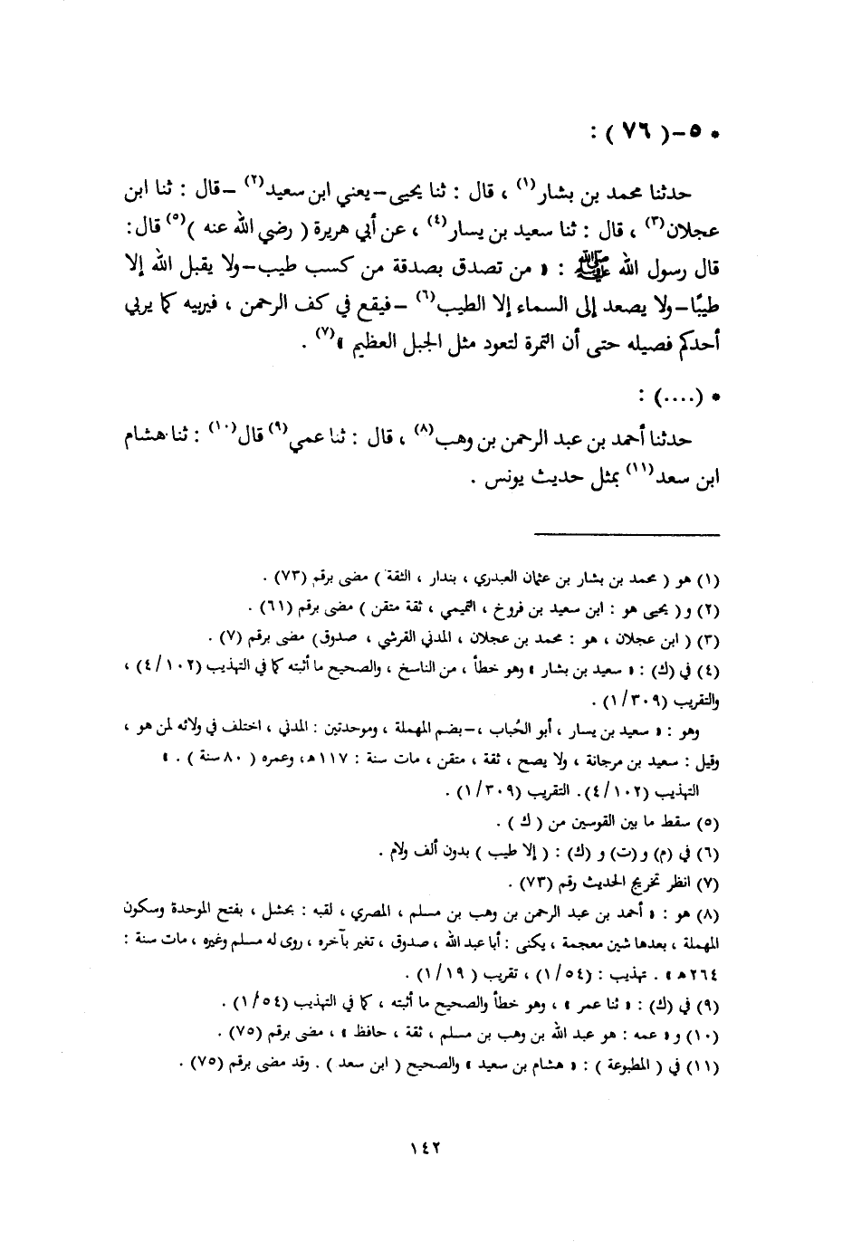 حَدَّثَنَا مُحَمَّدُ بْنُ بَشَّارٍ، قَالَ: ثنا يَحْيَى يَعْنِي ابْنَ سَعِيدٍ، قَالَ: ثنا ابْنُ عَجْلَانَ، قَالَ: ثنا سَعِيدُ بْنُ يَسَارٍ، عَنْ أَبِي هُرَيْرَةَ، رَضِيَ اللَّهُ عَنْهُ قَالَ: قَالَ رَسُولُ اللَّهِ صَلَّى اللهُ عَلَيْهِ وَسَلَّمَ: «§مَنْ تَصَدَّقَ بِصَدَقَةٍ مِنْ كَسْبٍ طَيِّبٍ , وَلَا يَقْبَلُ اللَّهُ إِلَّا طَيِّبًا , وَلَا يَصْعَدُ إِلَى السَّمَاءِ إِلَّا الطِّيبُ , فَيَقَعُ فِي كَفِّ الرَّحْمَنِ، فَيُرَبِّيهِ كَمَا يُرَبِّي أَحَدُكُمْ فَصِيلَهُ حَتَّى أَنَّ التَّمْرَةَ لَتَعُودُ مِثْلَ الْجَبَلِ الْعَظِيمِ» حَدَّثَنَا أَحْمَدُ بْنُ عَبْدِ الرَّحْمَنِ بْنِ وَهْبٍ، قَالَ: ثنا عَمِّي، قَالَ: ثنا هِشَامُ بْنُ سَعْدٍ بِمِثْلِ حَدِيثِ يُونُسَ -[143]-، حَدَّثَنَا مُحَمَّدُ بْنُ يَحْيَى، قَالَ: ثنا ابْنُ أَبِي مَرْيَمَ، قَالَ: أَخْبَرَنَا بَكْرٌ يَعْنِي ابْنَ مُضَرَ، قَالَ: ثنا ابْنُ عَجْلَانَ، قَالَ: أَخْبَرَنِي أَبُو الْحُبَابِ سَعِيدُ بْنُ يَسَارٍ أَنَّ أَبَا هُرَيْرَةَ، أَخْبَرَهُ أَنَّ رَسُولَ اللَّهِ صَلَّى اللهُ عَلَيْهِ وَسَلَّمَ قَالَ: بِمِثْلِهِ، وَقَالَ: «إِلَّا وَهُوَ يَضَعُهَا فِي يَدِ الرَّحْمَنِ أَوْ فِي كَفِّ الرَّحْمَنِ» ، وَقَالَ: «حَتَّى أَنَّ التَّمْرَةَ لَتَكُونَ مِثْلَ الْجَبَلِ الْعَظِيمِ»