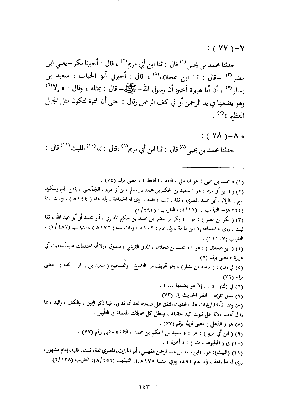 حَدَّثَنَا مُحَمَّدُ بْنُ يَحْيَى، قَالَ: ثنا ابْنُ أَبِي مَرْيَمَ، قَالَ: ثنا اللَّيْثُ، قَالَ -[144]-: حَدَّثَنِي سَعِيدُ بْنُ أَبِي سَعِيدٍ الْمَقْبُرِيُّ، عَنْ سَعِيدِ بْنِ يَسَارٍ، أَخِي أَبِي مُزَرِّدٍ أَنَّهُ سَمِعَ أَبَا هُرَيْرَةَ، رَضِيَ اللَّهُ عَنْهُ يَقُولُ: قَالَ رَسُولُ اللَّهِ صَلَّى اللهُ عَلَيْهِ وَسَلَّمَ: «§مَا تَصَدَّقَ أَحَدٌ بِصَدَقَةٍ مِنْ طَيِّبٍ، وَلَا يَقْبَلُ اللَّهُ إِلَّا الطَّيِّبَ إِلَّا أَخَذَهَا اللَّهُ بِيَمِينِهِ، وَإِنْ كَانَتْ مِثْلَ تَمْرَةٍ , فَتَرْبُو لَهُ فِي كَفِّ الرَّحْمَنِ، حَتَّى تَكُونَ أَعْظَمَ مِنَ الْجَبَلِ، كَمَا يُرَبِّي أَحَدُكُمْ فَلُوَّهُ أَوْ فَصِيلَهُ» حَدَّثَنَا مُحَمَّدٌ، قَالَ: ثنا هِشَامُ بْنُ عَمَّارٍ، قَالَ: ثنا صَدَقَةُ، قَالَ: ثنا -[145]- ابْنُ أَبِي ذِئْبٍ، عَنِ الْمَقْبُرِيِّ، عَنْ سَعِيدِ بْنِ يَسَارٍ، عَنْ أَبِي هُرَيْرَةَ، رَضِيَ اللَّهُ عَنْهُ , عَنِ النَّبِيِّ صَلَّى اللهُ عَلَيْهِ وَسَلَّمَ قَالَ: «مَا مِنَ امْرِئٍ يَتَصَدَّقُ بِصَدَقَةٍ»
