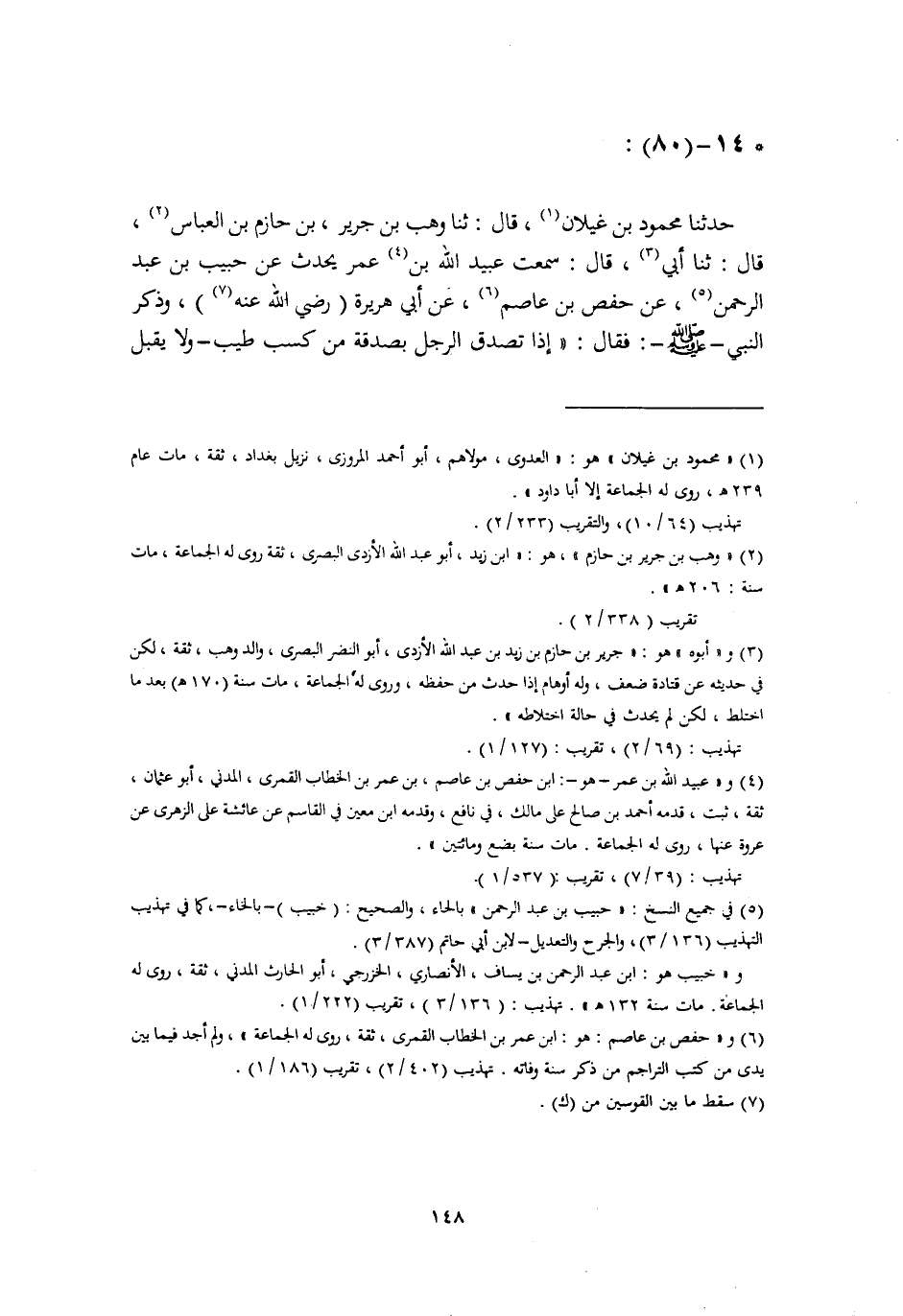 حَدَّثنا مَحْمُودُ بْنُ غَيْلَانَ، قَالَ: ثنا وَهْبُ بْنُ جَرِيرِ بْنِ حَازِمِ بْنِ الْعَبَّاسِ، قَالَ: ثَنَا أَبِي قَالَ: سَمِعْتُ عُبَيْدَ اللَّهِ بْنَ عُمَرَ، يُحَدِّثُ عَنْ حَبِيبِ بْنِ عَبْدِ الرَّحْمَنِ، عَنْ حَفْصِ بْنِ عَاصِمٍ، عَنْ أَبِي هُرَيْرَةَ، رَضِيَ اللَّهُ عَنْهُ، وَذَكَرَ النَّبِيَّ صَلَّى اللهُ عَلَيْهِ وَسَلَّمَ , فَقَالَ: «§إِذَا تَصَدَّقَ الرَّجُلُ بِصَدَقَةٍ مِنْ كَسْبٍ طَيِّبٍ , وَلَا يَقْبَلُ -[149]- اللَّهُ إِلَّا طَيِّبًا أَخَذَهَا اللَّهُ بِيَمِينِهِ، فَيُرَبِّيهَا لِأَحَدِكُمُ اللُّقْمَةَ وَالتَّمْرَةَ، كَمَا يُرَبِّي أَحَدُكُمْ فَلُوَّهُ أَوْ فَصِيلَهُ، حَتَّى أَنَّهَا لَتَكُونَ أَعْظَمَ مِنْ أُحُدٍ»