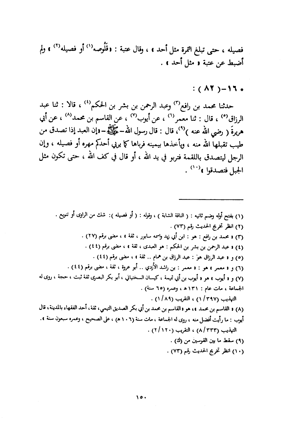 16 - حَدَّثَنَا مُحَمَّدُ بْنُ رَافِعٍ، وَعَبْدُ الرَّحْمَنِ بْنُ بِشْرِ بْنِ الْحَكَمِ، قَالَا: ثنا عَبْدُ الرَّزَّاقِ، قَالَ: ثنا مَعْمَرٌ، عَنْ أَيُّوبَ، عَنِ الْقَاسِمِ بْنِ مُحَمَّدٍ، عَنْ أَبِي هُرَيْرَةَ، رَضِيَ اللَّهُ عَنْهُ قَالَ: قَالَ رَسُولُ اللَّهِ صَلَّى اللهُ عَلَيْهِ وَسَلَّمَ: «§إِنَّ الْعَبْدَ إِذَا تَصَدَّقَ مِنْ طَيِّبٍ تَقَبَّلَهَا اللَّهُ مِنْهُ، وَيَأْخُذُهَا بِيَمِينِهِ , فَرَبَّاهَا كَمَا يُرَبِّي أَحَدُكُمْ مُهْرَهُ أَوْ فَصِيلَهُ، وَإِنَّ الرَّجُلَ لَيَتَصَدَّقُ بِاللُّقْمَةِ فَتَرْبُو فِي يَدِ اللَّهِ» أَوْ قَالَ: «فِي كَفِّ اللَّهِ، حَتَّى تَكُونَ مِثْلَ الْجَبَلِ فَتَصَدَّقُوا»