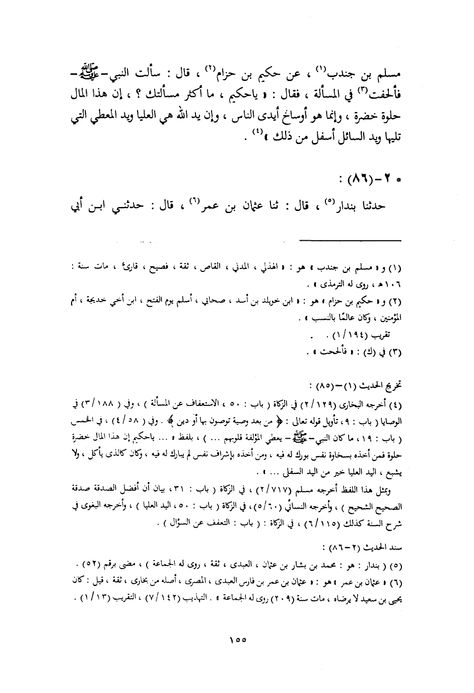 حَدَّثَنَا بُنْدَارٌ، قَالَ: ثنا عُثْمَانُ بْنُ عُمَرَ، قَالَ: حَدَّثَنِي ابْنُ أَبِي -[156]- ذِئْبٍ، عَنْ مُسْلِمِ بْنِ جُنْدُبٍ، عَنْ حَكِيمِ بْنِ حِزَامٍ، قَالَ: سَأَلْتُ رَسُولَ اللَّهِ صَلَّى اللهُ عَلَيْهِ وَسَلَّمَ مِنَ الْمَالِ، وَأَلْحَحْتُ عَلَيْهِ , فَقَالَ: «وَمَا أَكْثَرَ مَسْأَلَتَكَ , يَا حَكِيمُ، إِنَّ هَذَا §الْمَالَ حُلْوَةٌ خَضِرَةٌ، وَهِيَ مَعَ ذَلِكَ أَوْسَاخُ أَيْدِي النَّاسِ، وَإِنَّ يَدَ اللَّهِ فَوْقَ يَدِ الْمُعْطِي، وَيَدَ الْمُعْطِي فَوْقَ يَدِ الْمُعْطَى، وَيَدَ الْمُعْطَى أَسْفَلُ الْأَيْدِي» قَالَ أَبُو بَكْرٍ: مُسْلِمُ بْنُ جُنْدُبٍ قَدْ سَمِعَ مِنِ ابْنِ عُمَرَ غَيْرَ شَيْءٍ، وَقَالَ: أَمَرَنِي ابْنُ عُمَرَ أَنْ أَشْتَرِيَ لَهُ بَدَنَةً، فَلَسْتُ أُنْكِرُ أَنْ يَكُونَ قَدْ سَمِعَ مِنَ حَكِيمِ بْنِ حِزَامٍ