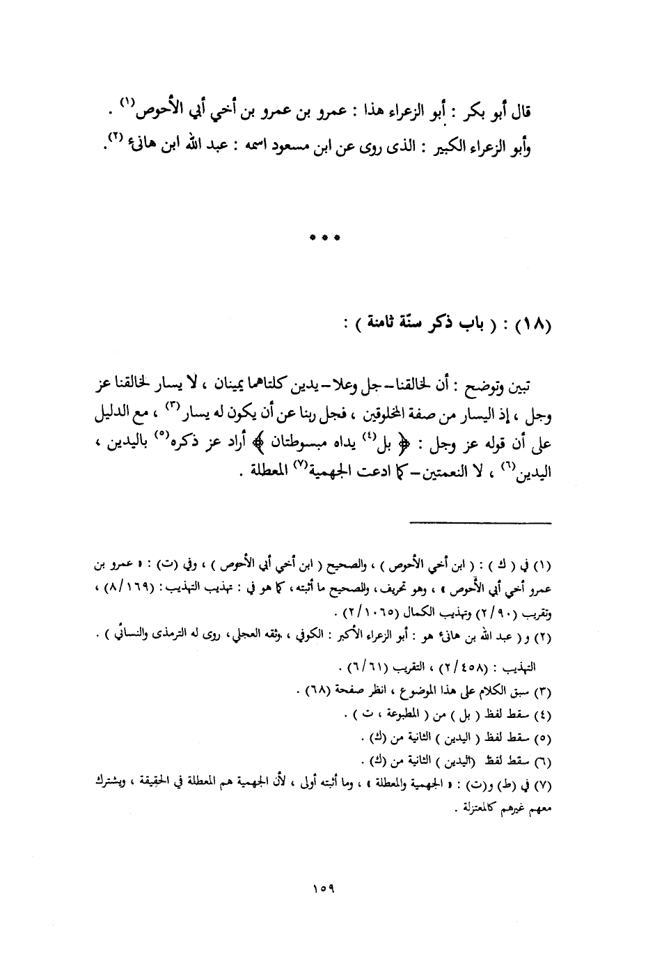 §بَابُ ذِكْرِ سُنَّةٍ ثَامِنَةٍ تُبَيِّنُ وَتُوَضِّحُ: أَنَّ لِخَالِقِنَا جَلَّ وَعَلَا يَدَيْنِ كِلْتَاهُمَا يَمِينَانِ، وَلَا يَسَارَ لِخَالِقِنَا عَزَّ وَجَلَّ، إِذِ الْيَسَارُ مِنْ صِفَةِ الْمَخْلُوقِينَ، فَجَلَّ رَبُّنَا عَنْ أَنْ يَكُونَ لَهُ يَسَارٌ، مَعَ الدَّلِيلِ عَلَى أَنَّ قَوْلَهُ عَزَّ وَجَلَّ: {بَلْ يَدَاهُ مَبْسُوطَتَانِ} [المائدة: 64] , أَرَادَ عَزَّ ذِكْرُهُ بِالْيَدَيْنِ، الْيَدَيْنِ , لَا النِّعْمَتَيْنِ كَمَا ادَّعَتِ الْجَهْمِيَّةُ الْمُعَطِّلَةُ