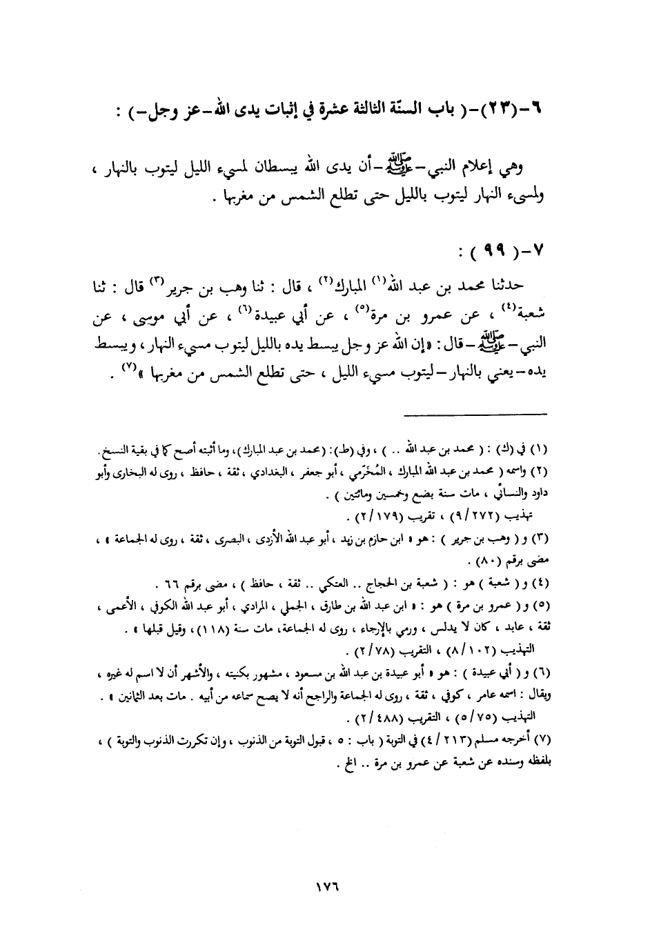 حَدَّثَنَا مُحَمَّدُ بْنُ عَبْدِ اللَّهِ الْمُبَارَكُ، قَالَ: ثنا وَهْبُ بْنُ جَرِيرٍ، قَالَ: ثنا شُعْبَةُ، عَنْ عَمْرِو بْنِ مُرَّةَ، عَنْ أَبِي عُبَيْدَةَ، عَنْ أَبِي مُوسَى، عَنِ النَّبِيِّ صَلَّى اللهُ عَلَيْهِ وَسَلَّمَ قَالَ: «§إِنَّ اللَّهَ عَزَّ وَجَلَّ يَبْسُطُ يَدَهُ بِاللَّيْلِ لِيَتُوبَ مُسِيءُ النَّهَارِ، وَيَبْسُطُ يَدَهُ - يَعْنِي بِالنَّهَارِ - لِيَتُوبَ مُسِيءُ اللَّيْلِ، حَتَّى تَطْلُعَ الشَّمْسُ مِنْ مَغْرِبِهَا» -[177]- قَالَ أَبُو بَكْرٍ: لَمْ يَقُلِ الْمَخْزُومِيُّ بِالنَّهَارِ، قَدْ أَمْلَيْتُ هَذَا الْبَابَ بِتَمَامِهِ فِي كِتَابِ التَّوْبَةِ وَالْإِنَابَةِ، فَاسْمَعِ الدَّلِيلَ عَلَى مَعْنَى هَذَا الْخَبَرِ أَنَّ اللَّهَ تَعَالَى يَبْسُطُ يَدَهُ عَلَى لَفْظِ الْخَبَرِ، لِيُعْلَمَ وَيُتَيَقَّنَ أَنَّ عَمَلَ اللَّيْلِ يُرْفَعُ إِلَى اللَّهِ قَبْلَ النَّهَارِ، وَعَمَلَ النَّهَارِ قَبْلَ اللَّيْلِ