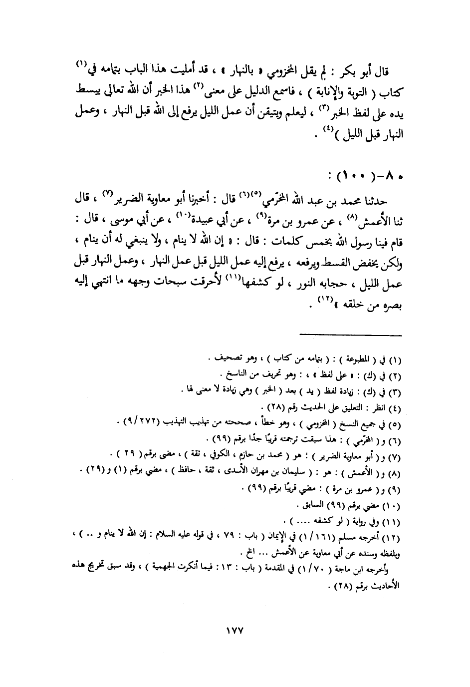 حَدَّثَنَا مُحَمَّدُ بْنُ عَبْدِ اللَّهِ الْمُخَرِّمِيُّ، قَالَ: أَخْبَرَنَا أَبُو مُعَاوِيَةَ الضَّرِيرُ، قَالَ: ثنا الْأَعْمَشُ، عَنْ عَمْرِو بْنِ مُرَّةَ، عَنْ أَبِي عُبَيْدَةَ، عَنْ أَبِي مُوسَى، قَالَ: قَامَ فِينَا رَسُولُ اللَّهِ بِخَمْسِ كَلِمَاتٍ قَالَ: «§إِنَّ اللَّهَ لَا يَنَامُ، وَلَا يَنْبَغِي لَهُ أَنْ يَنَامَ، وَلَكِنْ يَخْفِضُ الْقِسْطَ وَيَرْفَعُهُ، يُرْفَعُ إِلَيْهِ عَمَلُ اللَّيْلِ قَبْلَ عَمَلِ النَّهَارِ، وَعَمَلُ النَّهَارِ قَبْلَ عَمَلِ اللَّيْلِ، حِجَابُهُ النُّورُ، لَوْ كَشَفَهَا لَأَحْرَقَتْ سُبُحَاتُ وَجْهِهِ مَا انْتَهَى إِلَيْهِ بَصَرُهُ مِنْ خَلْقِهِ»