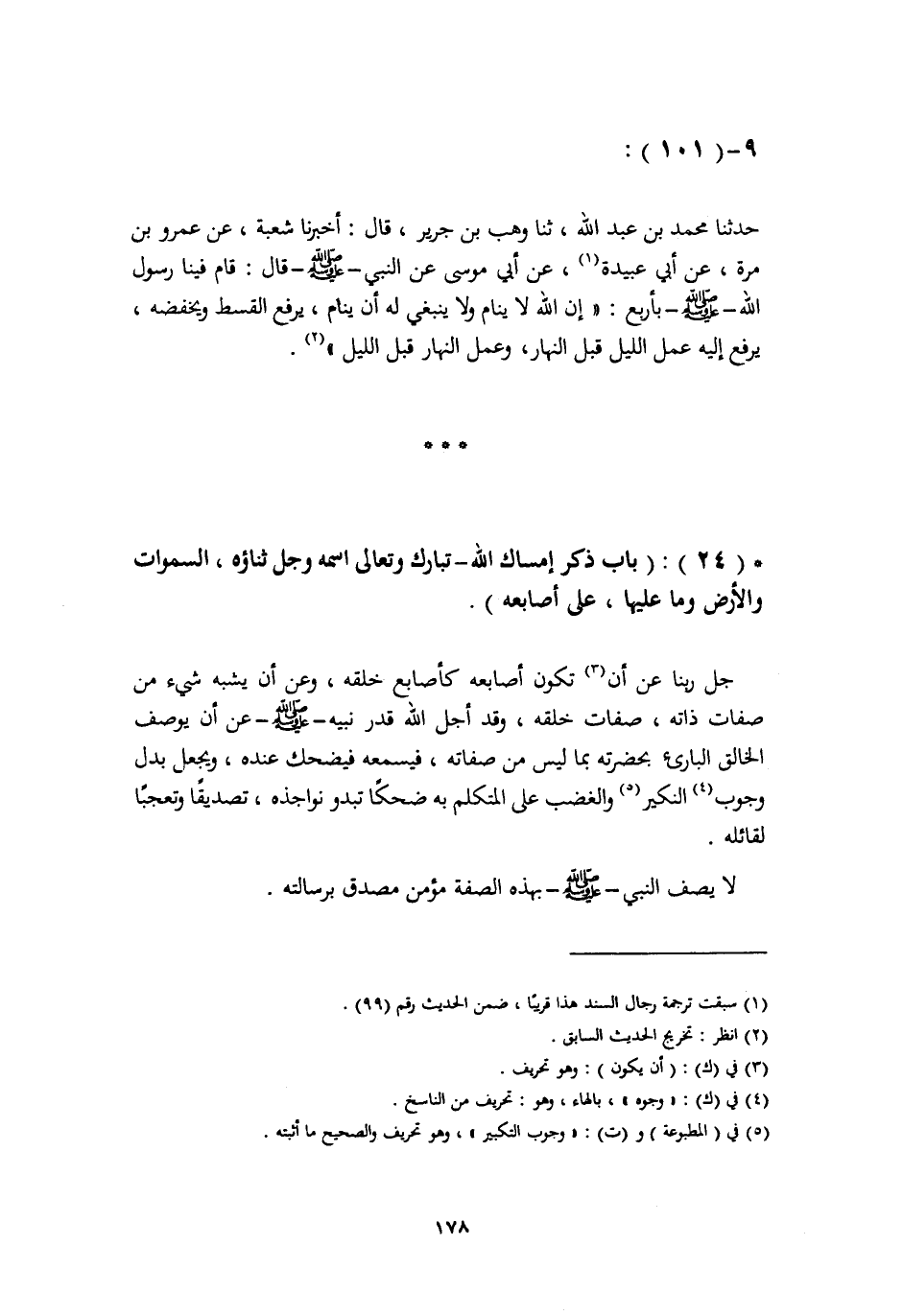 §بَابُ ذِكْرِ إِمْسَاكِ اللَّهِ تَبَارَكَ وَتَعَالَى اسْمُهُ وَجَلَّ ثَنَاؤُهُ السَّمَاوَاتِ وَالْأَرْضَ وَمَا عَلَيْهَا عَلَى أَصَابِعِهِ جَلَّ رَبُّنَا عَنْ أَنْ تَكُونَ أَصَابِعُهُ كَأَصَابِعِ خَلْقِهِ، وَعَنْ أَنْ يُشْبِهَ شَيْءٌ مِنْ صِفَاتِ ذَاتِهِ صِفَاتِ خَلْقِهِ، وَقَدْ أَجَلَّ اللَّهُ قَدْرَ نَبِيِّهِ صَلَّى اللهُ عَلَيْهِ وَسَلَّمَ عَنْ أَنْ يُوصَفَ الْخَالِقُ الْبَارِئُ بِحَضْرَتِهِ بِمَا لَيْسَ مِنْ صِفَاتِهِ، فَيَسْمَعُهُ فَيَضْحَكُ عِنْدَهُ، وَيَجْعَلُ بَدَلَ وجُوبِ النَّكِيرِ وَالْغَضَبِ عَلَى الْمُتَكَلِّمِ بِهِ ضَحِكًا تَبْدُوَ نَوَاجِذُهُ، تَصْدِيقًا وَتَعَجُّبًا لِقَائِلِهِ لَا يَصِفُ النَّبِيَّ صَلَّى اللهُ عَلَيْهِ وَسَلَّمَ بِهَذِهِ الصِّفَةِ مُؤْمِنٌ مُصَدِّقٌ بِرِسَالَتِهِ