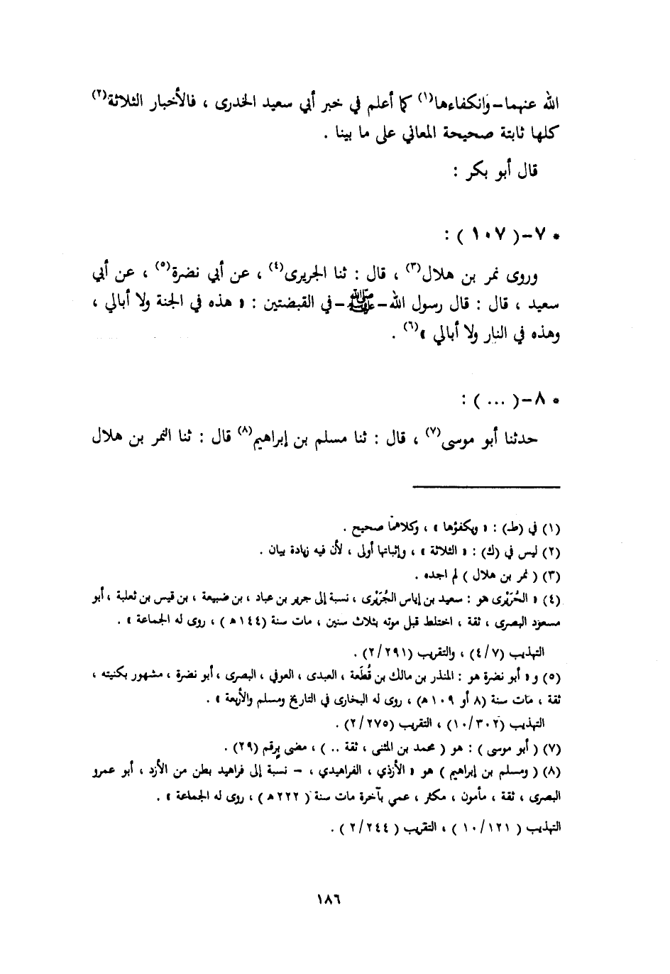 قال أبو بكر وَرَوَى نَمِرُ بْنُ هِلَالٍ، قَالَ: ثنا الْجُرَيْرِيُّ، عَنْ أَبِي نَضْرَةَ، عَنْ أَبِي سَعِيدٍ، قَالَ: قَالَ رَسُولُ اللَّهِ صَلَّى اللهُ عَلَيْهِ وَسَلَّمَ فِي الْقَبْضَتَيْنِ: «§هَذِهِ فِي الْجَنَّةِ وَلَا أُبَالِي، وَهَذِهِ فِي النَّارِ وَلَا أُبَالِي»