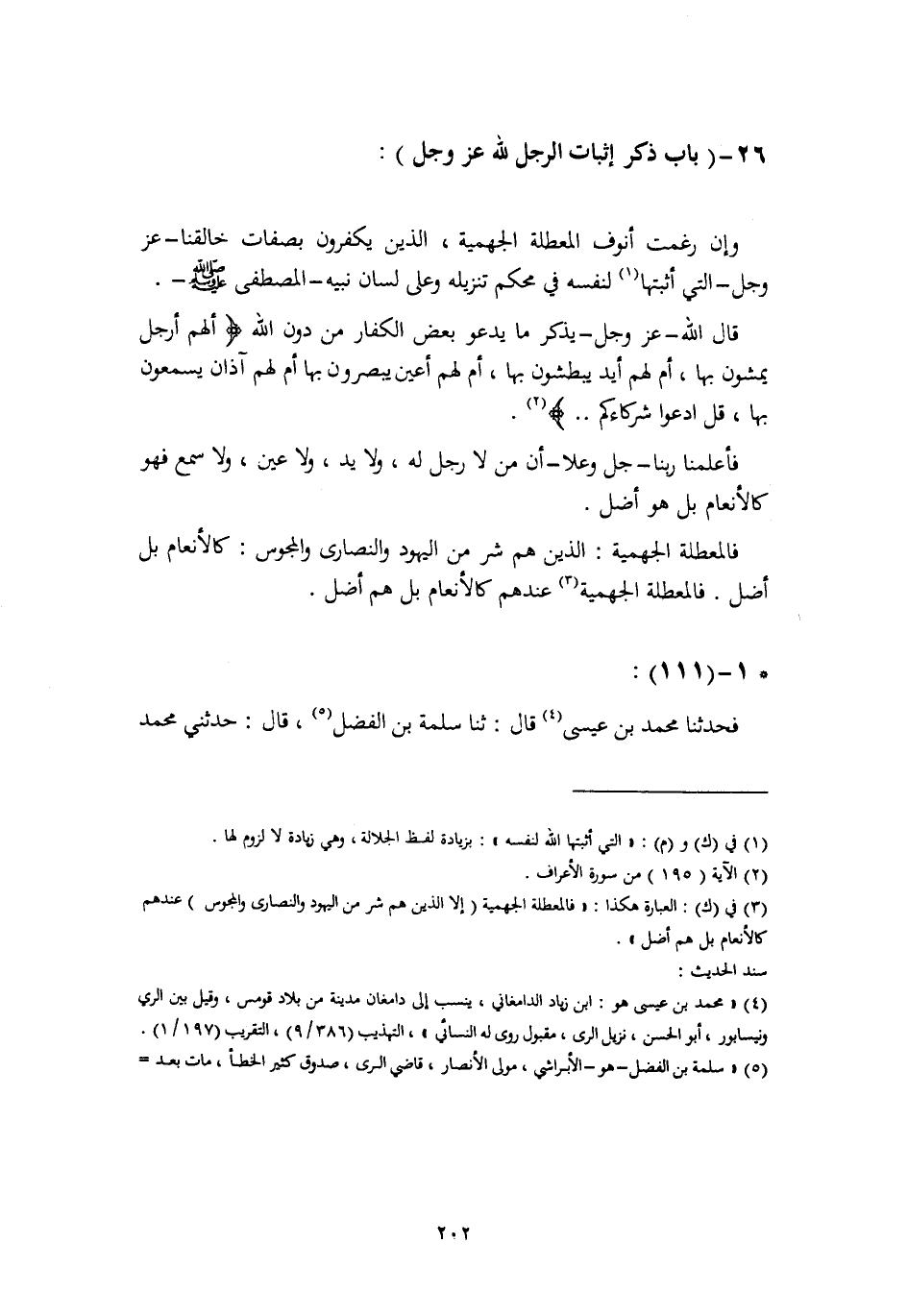 §26 - بَابُ ذِكْرِ إِثْبَاتِ الرِّجْلِ لِلَّهِ عَزَّ وَجَلَّ وَإِنْ رَغَمَتْ أُنُوفُ الْمُعَطِّلَةِ الْجَهْمِيَّةِ، الَّذِينَ يَكْفُرُونَ بِصِفَاتِ خَالِقِنَا عَزَّ وَجَلَّ الَّتِي أَثْبَتَهَا لِنَفْسِهِ فِي مُحْكَمِ تَنْزِيلِهِ , وَعَلَى لِسَانِ نَبِيِّهِ الْمُصْطَفَى صَلَّى اللهُ عَلَيْهِ وَسَلَّمَ قَالَ اللَّهُ عَزَّ وَجَلَّ يَذْكُرُ مَا يَدْعُو بَعْضُ الْكُفَّارِ مِنْ دُونِ اللَّهِ: {أَلَهُمْ أَرْجُلٌ يَمْشُونَ بِهَا، أَمْ لَهُمْ أَيَدٍ يَبْطِشُونَ بِهَا، أَمْ لَهُمْ أَعْيُنٌ يُبْصِرُونَ بِهَا أَمْ لَهُمْ آذَانٌ يَسْمَعُونَ بِهَا، قُلِ ادْعُوا شُرَكَاءَكُمْ} [الأعراف: 195] فَأَعْلَمَنَا رَبُّنَا جَلَّ وَعَلَا أَنَّ مَنَ لَا رِجْلَ لَهُ، وَلَا يَدَ، وَلَا عَيْنَ، وَلَا سَمْعَ فَهُوَ كَالْأَنْعَامِ بَلْ هُوَ أَضَلُّ , فَالْمُعَطِّلَةُ الْجَهْمِيَّةُ: الَّذِينَ هُمْ شَرٌّ مِنَ الْيَهُودِ وَالنَّصَارَى وَالْمَجُوسِ: كَالْأَنْعَامِ بَلْ أَضَلُّ؛ فَالْمُعَطِّلَةُ الْجَهْمِيَّةُ عِنْدَهُمْ كَالْأَنْعَامِ بَلْ هُمْ أَضَلُّ