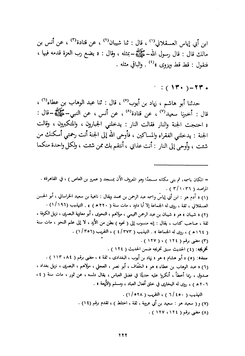 حَدَّثَنَا أَبُو هَاشِمٍ زِيَادُ بْنُ أَيُّوبَ قَالَ: ثنا عَبْدُ الْوَهَّابِ بْنُ عَطَاءٍ، قَالَ: أَخْبَرَنَا سَعِيدٌ، عَنْ قَتَادَةَ، عَنْ أَنَسٍ، عَنِ النَّبِيِّ صَلَّى اللهُ عَلَيْهِ وَسَلَّمَ قَالَ: " §احْتَجَّتِ الْجَنَّةُ وَالنَّارُ , فَقَالَتِ النَّارُ: يَدْخُلُنِي الْجَبَّارُونَ، وَالْمُتَكَبِّرُونَ، وَقَالَتِ الْجَنَّةُ: يَدْخُلُنِي الْفُقَرَاءُ وَالْمَسَاكِينَ، فَأَوْحَى اللَّهُ إِلَى الْجَنَّةِ: أَنْتِ رَحْمَتِي أُسْكِنُكِ مَنْ شِئْتُ، وَأَوْحَى إِلَى النَّارِ: أَنْتِ عَذَابِي، أَنْتَقِمُ بِكِ مِمَّنْ شِئْتُ، وَلِكُلِّ وَاحِدَةٍ مِنْكُمَا -[223]- مِلْؤُهَا، فَتَقُولُ، يَعْنِي النَّارَ: هَلْ مِنْ مَزِيدٍ؟ حَتَّى يَضَعَ فِيهَا قَدَمَهُ , فَتَقُولُ: قَطْ قَطْ "
