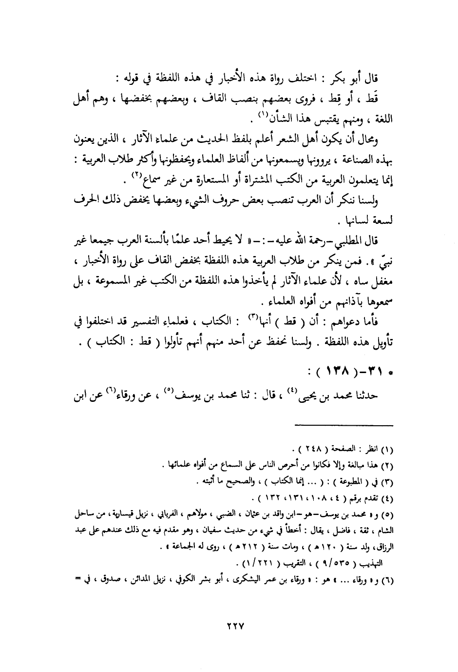 31 - حَدَّثَنَا مُحَمَّدُ بْنُ يَحْيَى، قَالَ: ثنا مُحَمَّدُ بْنُ يُوسُفَ، عَنْ وَرْقَاءَ، عَنِ ابْنِ -[228]- أَبِي نَجِيحٍ، عَنْ مُجَاهِدٍ، " فِي قَوْلِهِ: {§عَجِّلْ لَنَا قِطَّنَا} [ص: 16] قَالَ: عَذَابَنَا " وَثنا مُحَمَّدُ بْنُ يَحْيَى قَالَ: ثنا ابْنُ يُوسُفَ، قَالَ: ثنا سُفْيَانُ، عَنْ أَشْعَثَ بْنِ سِوَارٍ، عَنِ الْحَسَنِ فِي قَوْلِهِ: {رَبَّنَا عَجِّلْ لَنَا قِطَّنَا} [ص: 16] ، قَالَ: «عُقُوبَتَنَا»