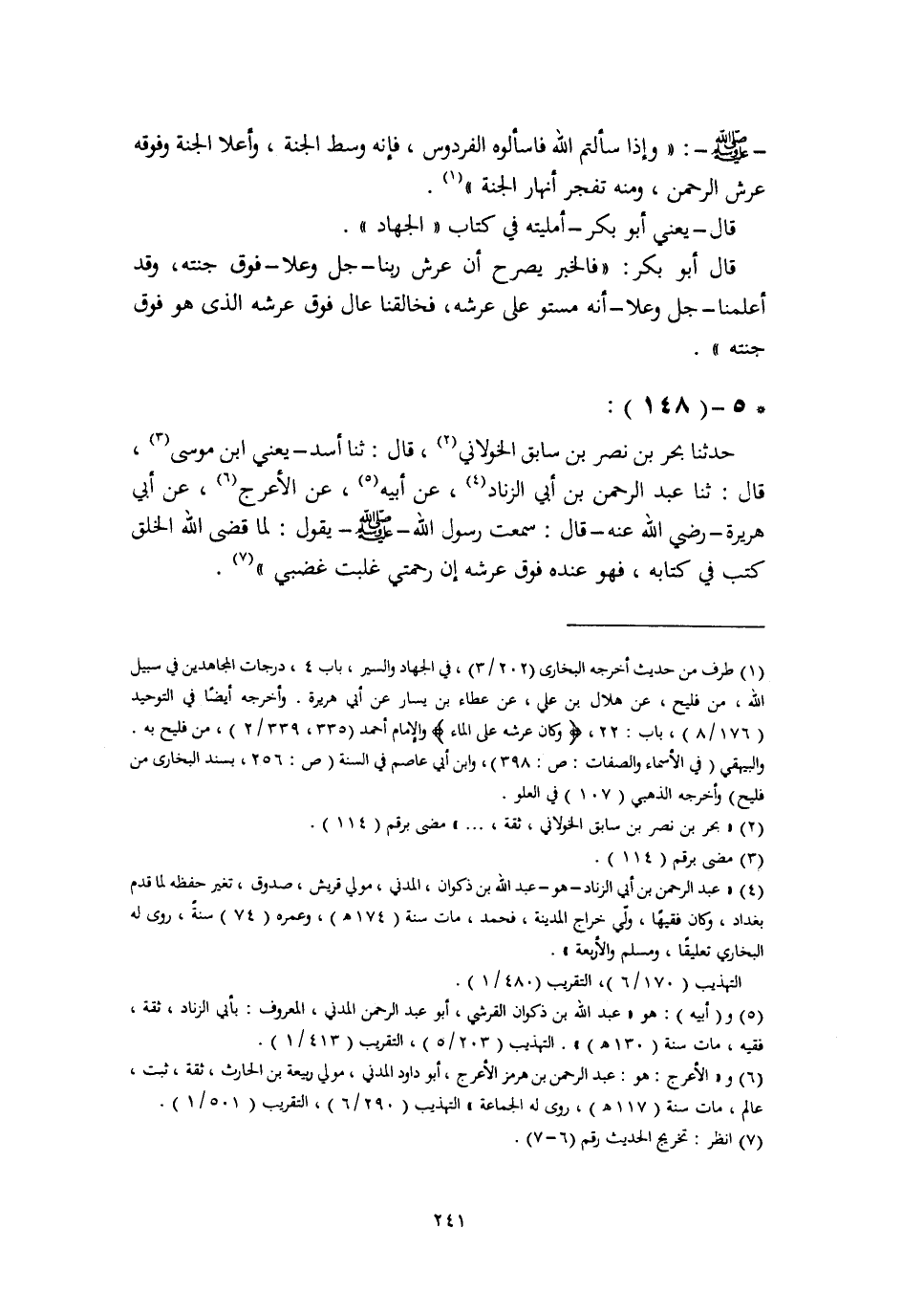 حَدَّثَنَا بَحْرُ بْنُ نَصْرِ بْنِ سَابِقٍ الْخَوْلَانِيُّ، قَالَ: ثنا أَسَدٌ يَعْنِي ابْنَ مُوسَى، قَالَ: ثنا عَبْدُ الرَّحْمَنِ بْنُ أَبِي الزِّنَادِ، عَنْ أَبِيهِ، عَنِ الْأَعْرَجِ، عَنْ أَبِي هُرَيْرَةَ، رَضِيَ اللَّهُ عَنْهُ قَالَ: سَمِعْتُ رَسُولَ اللَّهِ صَلَّى اللهُ عَلَيْهِ وَسَلَّمَ يَقُولُ: «§لَمَّا قَضَى اللَّهُ الْخَلْقَ كَتَبَ فِي كِتَابِهِ، فَهُوَ عِنْدَهُ فَوْقَ عَرْشِهِ إِنَّ رَحْمَتِي غَلَبَتْ غَضَبِي» -[242]- قَالَ أَبُو بَكْرٍ: أَمْلَيْتُ طُرُقَ هَذَا الْخَبَرِ فِي غَيْرِ هَذَا الْكِتَابِ، فَالْخَبَرُ دَالٌ عَلَى أَنَّ رَبَّنَا جَلَّ وَعَلَا فَوْقَ عَرْشِهِ الَّذِي كِتَابُهُ: إِنَّ رَحْمَتَهُ غَلَبَتْ غَضَبَهُ عِنْدَهُ