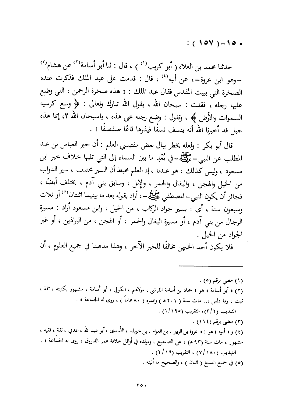 حَدَّثَنَا مُحَمَّدُ بْنُ الْعَلَاءِ أَبُو كُرَيْبٍ، قَالَ: ثنا أَبُو أُسَامَةَ، عَنْ هِشَامٍ وَهُوَ ابْنُ عُرْوَةَ، عَنْ أَبِيهِ، قَالَ: قَدِمْتُ عَلَى عَبْدِ الْمَلِكِ، فَذَكَرْتُ عِنْدَهُ الصَّخْرَةَ الَّتِي بِبَيْتِ الْمَقْدِسِ، فَقَالَ عَبْدُ الْمَلِكِ: " §هَذِهِ صَخْرَةُ الرَّحْمَنِ، الَّتِي وَضَعَ عَلَيْهَا رِجْلَهُ، فَقُلْتُ: سُبْحَانَ اللَّهِ، يَقُولُ اللَّهُ تَبَارَكَ وَتَعَالَى: {وَسِعَ كُرْسِيُّهُ السَّمَاوَاتِ وَالْأَرْضَ} [البقرة: 255] ، وَتَقُولُ وَضَعَ رِجْلَهُ عَلَى هَذِهِ، يَا سُبْحَانَ اللَّهِ إِنَّمَا هَذِهِ جَبَلٌ قَدْ أَخْبَرَنَا اللَّهُ أَنَّهُ يُنْسَفُ نَسْفًا فَيَذَرَهَا قَاعًا صَفْصَفًا " قَالَ أَبُو بَكْرٍ: وَلَعَلَّهُ يَخْطِرُ بِبَالِ بَعْضِ مُقْتَبِسِي الْعِلْمِ أَنَّ خَبَرَ الْعَبَّاسِ بْنِ عَبْدِ الْمُطَّلِبِ عَنِ النَّبِيِّ صَلَّى اللهُ عَلَيْهِ وَسَلَّمَ فِي بُعْدِ مَا بَيْنَ السَّمَاءِ إِلَى الَّتِي تَلِيهَا خِلَافُ خَبَرِ ابْنِ مَسْعُودٍ، وَلَيْسَ كَذَلِكَ، وَهُوَ عِنْدَنَا، إِذِ الْعِلْمُ مُحِيطٌ أَنَّ السَّيْرَ يَخْتَلِفُ، سَيْرَ الدَّوَابِّ مِنَ الْخَيْلِ وَالْهُجْنِ، وَالْبِغَالِ وَالْحُمُرِ وَالْإِبِلِ، وَسَابِقُ بَنِي آدَمَ، يَخْتَلِفُ أَيْضًا، فَجَائِزٌ أَنْ يَكُونَ النَّبِيُّ الْمُصْطَفَى صَلَّى اللهُ عَلَيْهِ وَسَلَّمَ، أَرَادَ بِقَوْلِهِ: «بُعْدُ مَا بَيْنَهُمَا اثْنَتَانِ أَوْ ثَلَاثٌ وَسَبْعُونَ سَنَةً» أَيْ: بِسَيْرِ جَوَادِ الرِّكَابِ مِنَ الْخَيْلِ، وَابْنُ مَسْعُودٍ أَرَادَ: مَسِيرَةَ الرِّجَالِ مِنْ بَنِي آدَمَ، أَوْ مَسِيرَةَ الْبِغَالِ وَالْحُمُرِ، أَوِ الْهُجْنِ، مِنَ الْبَرَاذِينِ، أَوْ غَيْرِ الْجَوَادِ مِنَ الْخَيْلِ، فَلَا يَكُونُ أَحَدُ الْخَبَرَيْنِ مُخَالِفًا لِلْخَبَرِ الْآخَرِ، وَهَذَا مَذْهَبُنَا فِي جَمِيعِ الْعُلُومِ، أَنَّ