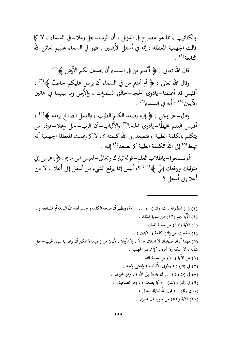 وَالْكَتَاتِيبِ، مِمَّا هُوَ مُصَرَّحٌ فِي التَّنْزِيلِ أَنَّ الرَّبَّ جَلَّ وَعَلَا فِي السَّمَاءِ، لَا كَمَا قَالَتِ الْجَهْمِيَّةُ الْمُعَطِّلَةُ: إِنَّهُ فِي أَسْفَلِ الْأَرَضِينَ فَهُوَ فِي السَّمَاءِ عَلَيْهِمْ لَعَائِنُ اللَّهُ التَّابِعَةُ قَالَ اللَّهُ تَعَالَى: {أَأَمِنْتُمْ مَنْ فِي السَّمَاءِ أَنْ يَخْسِفَ بِكُمُ الْأَرْضُ} [الملك: 16] وَقَالَ اللَّهُ تَعَالَى: {أَمْ أَمِنْتُمْ مَنْ فِي السَّمَاءِ أَنْ يُرْسِلَ عَلَيْكُمْ حَاصِبًا} [الملك: 17] ، أَفَلَيْسَ قَدْ أَعْلَمَنَا - يَا ذَوِي الْحِجَا - خَالِقُ السَّمَاوَاتِ وَالْأَرْضِ، وَمَا بَيْنَهُمَا فِي هَاتَيْنِ الْآيَتَيْنِ: أَنَّهُ فِي السَّمَاءِ وَقَالَ عَزَّ وَجَلَّ: {إِلَيْهِ يَصْعَدُ الْكَلِمُ الطَّيِّبُ، وَالْعَمَلُ الصَّالِحُ يَرْفَعْهُ} [فاطر: 10] ، أَفَلَيْسَ الْعِلْمُ مُحِيطًا يَا ذَوِي الْحِجَا وَالْأَلْبَابِ أَنَّ الرَّبَّ جَلَّ وَعَلَا فَوْقَ مَنْ يَتَكَلَّمْ بِالْكَلِمَةِ الطَّيِّبَةِ، فَتَصْعَدُ إِلَى اللَّهِ كَلِمَتُهُ؟، لَا كَمَا زَعَمَتِ الْمُعَطِّلَةُ الْجَهْمِيَّةُ أَنَّهُ تَهْبِطُ إِلَى اللَّهِ الْكَلِمَةُ الطَّيِّبَةُ كَمَا تَصْعَدُ إِلَيْهِ أَلَمْ تَسْمَعُوا يَا طُلَّابَ الْعِلْمِ، قَوْلَهُ تَبَارَكَ وَتَعَالَى لِعِيسَى ابْنِ مَرْيَمَ: {يَا عِيسَى إِنِّي مُتَوَفِّيكَ وَرَافِعُكَ إِلَيَّ} [آل عمران: 55] ، أَلَيْسَ إِنَّمَا يَرْفَعُ الشَّيْءَ مِنْ أَسْفَلَ إِلَى أَعْلَى، لَا مِنْ أَعْلَى إِلَى أَسْفَلَ؟