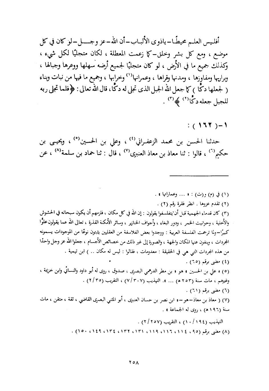 حَدَّثَنَا الْحَسَنُ بْنُ مُحَمَّدٍ الزَّعْفَرَانِيُّ، وَعَلِيُّ بْنُ الْحُسَيْنِ، وَيَحْيَى بْنُ حَكِيمٍ، قَالُوا: ثنا مُعَاذُ بْنُ مُعَاذٍ الْعَنْبَرِيُّ، قَالَ: ثنا حَمَّادُ بْنُ سَلَمَةَ، عَنْ -[259]- ثَابِتٍ، عَنْ أَنَسِ بْنِ مَالِكٍ، عَنِ النَّبِيِّ صَلَّى اللهُ عَلَيْهِ وَسَلَّمَ فِي قَوْلِهِ: {فَلَمَّا تَجَلَّى رَبُّهُ لِلْجَبَلِ جَعَلَهُ دَكًّا} [الأعراف: 143] قَالَ: §بِأُصْبُعِهِ هَكَذَا، وَأَشَارَ بِالْخِنْصَرِ مِنَ الظُّفْرِ يُمْسِكُهُ بِالْإِبْهَامِ قَالَ: فَقَالَ حُمَيْدٌ لِثَابِتٍ: يَا أَبَا مُحَمَّدٍ، دَعْ هَذَا، مَا تُرِيدُ إِلَى هَذَا؟ قَالَ: فَضَرَبَ ثَابِتٌ مَنْكِبَ حُمَيْدٍ، وَقَالَ: وَمَنْ أَنْتَ يَا حُمَيْدُ؟، وَمَا أَنْتَ يَا حُمَيْدُ، حَدَّثَنِي بِهِ أَنَسُ بْنُ مَالِكٍ عَنْ رَسُولِ اللَّهِ صَلَّى اللهُ عَلَيْهِ وَسَلَّمَ وَتَقُولُ أَنْتَ: دَعْ هَذَا -[260]-، هَذَا لَفْظُهُ حَدَّثَنَا يَحْيَى بْنُ حَكِيمٍ، وَقَالَ الزَّعْفَرَانِيُّ، وَعَلِيُّ بْنُ الْحُسَيْنِ، عَنْ حَمَّادِ بْنِ سَلَمَةَ، قَالَ عَلِيٌّ: ثنا ثَابِتٌ الْبُنَانِيُّ، عَنْ أَنَسِ بْنِ مَالِكٍ، عَنْ رَسُولِ اللَّهِ صَلَّى اللهُ عَلَيْهِ وَسَلَّمَ. وَقَالَ الزَّعْفَرَانِيُّ، عَنْ ثَابِتٍ الْبُنَانِيٍّ، عَنْ أَنَسٍ، عَنْ رَسُولِ اللَّهِ صَلَّى اللهُ عَلَيْهِ وَسَلَّمَ، فِي قَوْلِهِ: {فَلَمَّا تَجَلَّى رَبُّهُ لِلْجَبَلِ جَعَلَهُ دَكًّا} [الأعراف: 143] قَالَ: هَكَذَا، وَوَصَفَ مُعَاذٌ أَنَّهُ أَخْرَجَ أَوَّلَ مَفْصِلٍ مِنْ خِنْصَرِهِ، فَقَالَ لَهُ حُمَيْدٌ الطَّوِيلُ: يَا أَبَا مُحَمَّدٍ مَا تُرِيدُ إِلَى هَذَا؟ فَضَرَبَ صَدْرَهُ ضَرْبَةً شَدِيدَةً، وَقَالَ: فَمَنْ أَنْتَ يَا حُمَيْدُ، يُحَدِّثُنِي أَنَسُ بْنُ مَالِكٍ، عَنْ رَسُولِ اللَّهِ صَلَّى اللهُ عَلَيْهِ وَسَلَّمَ، وَتَقُولُ: أَنْتَ مَا تُرِيدُ إِلَى هَذَا؟ غَيْرَ أَنَّ الزَّعْفَرَانِيَّ قَالَ: هَكَذَا وَوَضَعَ إِبْهَامَهُ الْيُسْرَى عَلَى طَرَفِ خِنْصَرِهِ الْأَيْسَرِ عَلَى الْعِقْدِ الْأَوَّلِ حَدَّثَنَا عَبْدُ الْوَارِثِ بْنُ عَبْدِ الصَّمَدِ، قَالَ: ثنا أَبِي، ثنا حَمَّادُ بْنُ -[261]- سَلَمَةَ، قَالَ: ثنا ثَابِتٌ، عَنْ أَنَسِ بْنِ مَالِكٍ، قَالَ: قَالَ رَسُولُ اللَّهِ صَلَّى اللهُ عَلَيْهِ وَسَلَّمَ: «لَمَّا تَجَلَّى رَبُّهُ لِلْجَبَلِ رَفَعَ خِنْصَرَهُ وَقَبَضَ عَلَى مَفْصِلٍ مِنْهَا فَانْسَاخَ الْجَبَلُ» ، فَقَالَ لَهُ حُمَيْدٌ: أَتُحَدِّثَ بِهَذَا؟ فَقَالَ: حَدَّثَنَا أَنَسٌ عَنِ النَّبِيِّ صَلَّى اللهُ عَلَيْهِ وَسَلَّمَ، وَتَقُولُ: لَا تُحَدِّثْ بِهِ. حَدَّثَنَا مُحَمَّدُ بْنُ يَحْيَى، قَالَ: ثنا عَفَّانُ بْنُ مُسْلِمٍ، قَالَ: ثنا حَمَّادُ بْنُ سَلَمَةَ، قَالَ: ثنا ثَابِتٌ، عَنْ أَنَسٍ، عَنِ النَّبِيِّ صَلَّى اللهُ عَلَيْهِ وَسَلَّمَ، فِي قَوْلِهِ تَعَالَى: {فَلَمَّا تَجَلَّى رَبُّهُ لِلْجَبَلِ جَعَلَهُ دَكًّا} [الأعراف: 143] قَالَ: تَجَلَّى قَالَ بِيَدِهِ هَكَذَا، وَوَصَفَ عَفَّانُ بِطَرَفِ إِصْبَعِهِ الْخِنْصَرِ، قَالَ: فَسَاخَ الْجَبَلُ، فَقَالَ حُمَيْدٌ لِثَابِتٍ: أَتُحَدِّثَ بِمِثْلِ هَذَا؟ قَالَ: فَرَفَعَ ثَابِتٌ يَدَهُ، فَضَرَبَ صَدْرَهُ، وَقَالَ: حَدَّثَنِيهِ أَنَسٌ عَنْ رَسُولِ اللَّهِ صَلَّى اللهُ عَلَيْهِ وَسَلَّمَ وَتَقُولُ: أَتُحَدِّثَ بِمِثْلِ هَذَا؟ -[262]- حَدَّثَنَا مُحَمَّدٌ قَالَ: ثنا الْهَيْثَمُ بْنُ جَمِيلٍ قَالَ: ثنا حَمَّادٌ، عَنْ ثَابِتٍ، عَنْ أَنَسٍ، عَنِ النَّبِيِّ صَلَّى اللهُ عَلَيْهِ وَسَلَّمَ بِمِثْلِهِ وَحَدَّثَنَا مُحَمَّدٌ، قَالَ: ثنا مُسْلِمُ بْنُ إِبْرَاهِيمَ، قَالَ: ثنا حَمَّادٌ، قَالَ: ثنا ثَابِتٌ، عَنْ أَنَسٍ، أَنَّ النَّبِيَّ صَلَّى اللهُ عَلَيْهِ وَسَلَّمَ تَلَا هَذِهِ الْآيَةَ: {فَلَمَّا تَجَلَّى ر