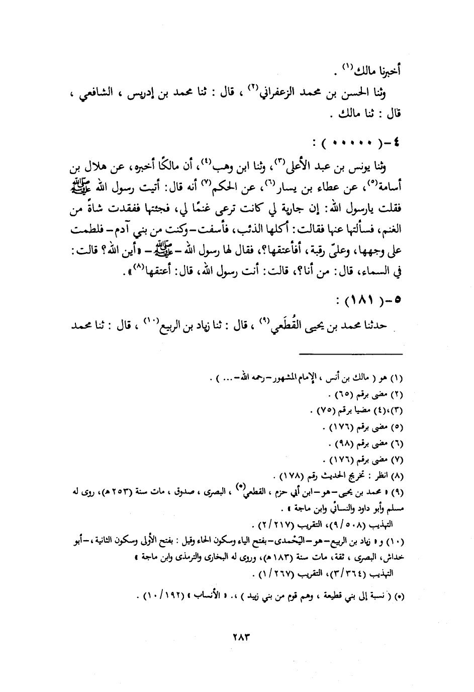 حَدَّثَنَا مُحَمَّدُ بْنُ يَحْيَى الْقُطَعِيُّ، قَالَ: ثنا زِيَادُ بْنُ الرَّبِيعِ، قَالَ: ثنا مُحَمَّدُ -[284]- بْنُ عَمْرِو بْنِ عَلْقَمَةَ، عَنْ أَبِي سَلَمَةَ، عَنْ أَبِي هُرَيْرَةَ، رَضِيَ اللَّهُ عَنْهُ أَنَّ مُحَمَّدَ بْنَ الشَّرِيدِ، جَاءَ بِخَادِمٍ سَوْدَاءَ عَتْمَاءَ إِلَى رَسُولِ اللَّهِ صَلَّى اللهُ عَلَيْهِ وَسَلَّمَ، فَقَالَ: يَا رَسُولَ اللَّهِ، إِنَّ أُمِّي جَعَلَتْ عَلَيْهَا عِتْقَ رَقَبَةٍ مُؤْمِنَةٍ، فَقَالَ: يَا رَسُولَ اللَّهِ: §هَلْ يُجْزَى أَنْ أَعْتِقَ هَذِهِ؟ فَقَالَ رَسُولُ اللَّهِ صَلَّى اللهُ عَلَيْهِ وَسَلَّمَ لِلْخَادِمَ: «أَيْنَ اللَّهُ» ، فَرَفَعَتْ رَأْسَهَا، فَقَالَتْ: فِي السَّمَاءِ، فَقَالَ: «مَنْ أَنَا؟» قَالَتْ: أَنْتَ رَسُولُ اللَّهِ، فَقَالَ: «أَعْتِقْهَا؛ فَإِنَّهَا مُؤْمِنَةٌ» حَدَّثَنَا مُحَمَّدُ بْنُ رَافِعٍ، قَالَ: ثنا يَزِيدُ بْنُ هَارُونَ، قَالَ: أَخْبَرَنَا الْمَسْعُودِيُّ، عَنْ عَوْنِ بْنِ عَبْدِ اللَّهِ، عَنْ أَخِيهِ عُبَيْدِ اللَّهِ بْنِ عَبْدِ اللَّهِ، عَنْ أَبِي -[285]- هُرَيْرَةَ، رَضِيَ اللَّهُ عَنْهُ قَالَ: جَاءَ رَجُلٌ إِلَى رَسُولِ اللَّهِ بِجَارِيَةٍ أَعْجَمِيَّةٍ، فَقَالَ: يَا رَسُولَ اللَّهِ، إِنَّ عَلَيَّ عِتْقَ رَقَبَةٍ مُؤْمِنَةٍ، أَفَأَعْتِقُ هَذِهِ؟، فَقَالَ لَهَا رَسُولُ اللَّهِ صَلَّى اللهُ عَلَيْهِ وَسَلَّمَ: " أَيْنَ اللَّهُ؟ فَأَشَارَتْ إِلَى السَّمَاءِ، قَالَ رَسُولُ اللَّهِ: «وَمَنْ أَنَا؟» قَالَتْ: فَأَشَارَتْ إِلَى رَسُولِ اللَّهِ، وَإِلَى السَّمَاءِ، أَيْ: أَنْتَ رَسُولُ اللَّهِ، فَقَالَ رَسُولُ اللَّهِ صَلَّى اللهُ عَلَيْهِ وَسَلَّمَ: «أَعْتِقْهَا؛ فَإِنَّهَا مُؤْمِنَةٌ» حَدَّثَنَا بَحْرُ بْنُ نَصْرٍ، قَالَ: ثنا أَسَدُ السُّنَّةِ يَعْنِي ابْنَ مُوسَى، قَالَ: ثنا الْمَسْعُودِيُّ، بِهَذَا مِثْلَهُ، وَقَالَ: بِجَارِيَةٍ سَوْدَاءَ لَا تُفْصِحُ، فَقَالَ: إِنَّ عَلَيَّ رَقَبَةً -[286]- مُؤْمِنَةً، وَقَالَ لَهَا رَسُولُ اللَّهِ صَلَّى اللهُ عَلَيْهِ وَسَلَّمَ: مَنْ رَبُّكِ؟ " فَأَشَارَتْ بِيَدِهَا إِلَى السَّمَاءِ، ثُمَّ قَالَ: «مَنْ أَنَا؟» فَقَالَتْ بِيَدِهَا مَا بَيْنَ السَّمَاءِ إِلَى الْأَرْضِ تَعْنِي رَسُولَ اللَّهِ وَالْبَاقِي مِثْلُهُ حَدَّثَنَا مُحَمَّدُ بْنُ مَعْمَرٍ، قَالَ: ثنا أَبُو دَاوُدَ، قَالَ: ثنا الْمَسْعُودِيُّ، قَالَ: أَخْبَرَنِي عَوْنُ بْنُ عَبْدِ اللَّهِ بْنِ عُتْبَةَ، بِهَذَا الْإِسْنَادِ مِثْلَهُ، وَقَالَ أَيْضًا: بِجَارِيَةٍ عَجْمَاءَ، لَا تُفْصِحُ، وَقَالَ: «أَعْتِقْهَا» وَقَالَ: فَقَالَ الْمَسْعُودِيُّ مَرَّةً: «أَعْتِقْهَا؛ فَإِنَّهَا مُؤْمِنَةٌ» قَالَ أَبُو بَكْرٍ: أَمْلَيْتُ تَمَامَ هَذَا الْبَابِ فِي كِتَابِ الظِّهَارِ فِي ذِكْرِ عِتْقِ الرَّقَبَةِ فِي الظِّهَارِ