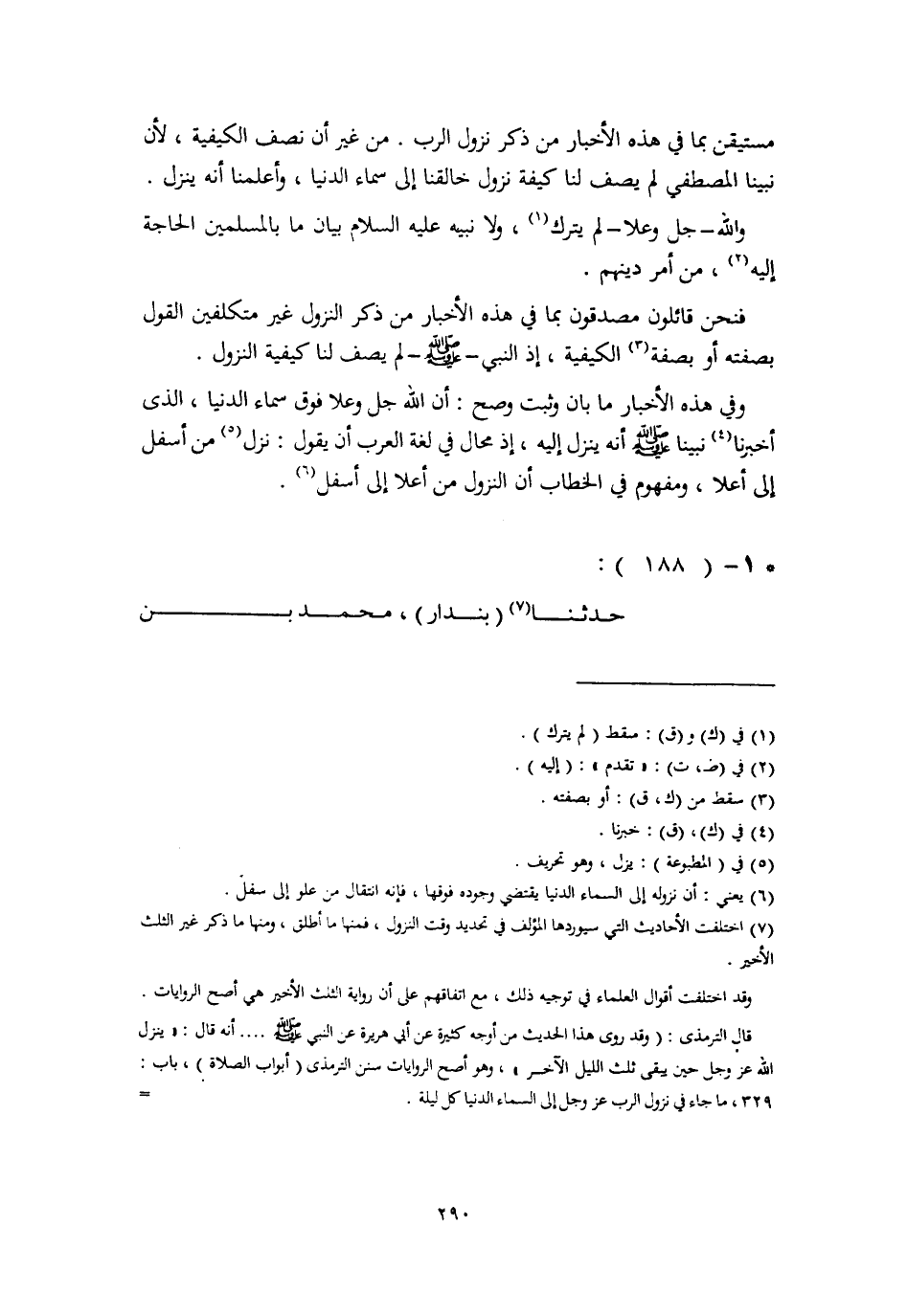 ، مُسْتَيْقِنٍ بِمَا فِي هَذِهِ الْأَخْبَارِ مِنْ ذِكْرِ نُزُولِ الرَّبِّ مِنْ غَيْرِ أَنْ نَصِفَ الْكَيْفِيَّةَ، لِأَنَّ نَبِيَّنَا الْمُصْطَفَى لَمْ يَصِفْ لَنَا كَيْفِيَّةَ نُزُولِ خَالِقِنَا إِلَى سَمَاءِ الدُّنْيَا، أَعْلَمَنَا أَنَّهُ يَنْزِلُ وَاللَّهُ جَلَّ وَعَلَا لَمْ يَتْرُكْ، وَلَا نَبِيُّهُ عَلَيْهِ السَّلَامُ بَيَانَ مَا بِالْمُسْلِمِينَ الْحَاجَةُ إِلَيْهِ، مِنْ أَمْرِ دِينِهِمْ فَنَحْنُ قَائِلُونَ مُصَدِّقُونَ بِمَا فِي هَذِهِ الْأَخْبَارِ مِنْ ذِكْرِ النُّزُولِ غَيْرِ مُتَكَلِّفِينَ الْقَوْلَ بِصِفَتِهِ أَوْ بِصِفَةِ الْكَيْفِيَّةِ، إِذِ النَّبِيُّ صَلَّى اللهُ عَلَيْهِ وَسَلَّمَ لَمْ يَصِفْ لَنَا كَيْفِيَّةَ النُّزُولِ وَفِي هَذِهِ الْأَخْبَارِ مَا بَانَ وَثَبَتَ وَصَحَّ: أَنَّ اللَّهَ جَلَّ وَعَلَا فَوْقَ سَمَاءِ الدُّنْيَا، الَّذِي أَخْبَرَنَا نَبِيُّنَا صَلَّى اللهُ عَلَيْهِ وَسَلَّمَ أَنَّهُ يَنْزِلُ إِلَيْهِ، إِذْ مُحَالٌ فِي لُغَةِ الْعَرَبِ أَنْ يَقُولَ: نَزَلَ مِنْ أَسْفَلَ إِلَى أَعْلَى، وَمَفْهُومٌ فِي الْخِطَابِ أَنَّ النُّزُولَ مِنْ أَعْلَى إِلَى أَسْفَلَ