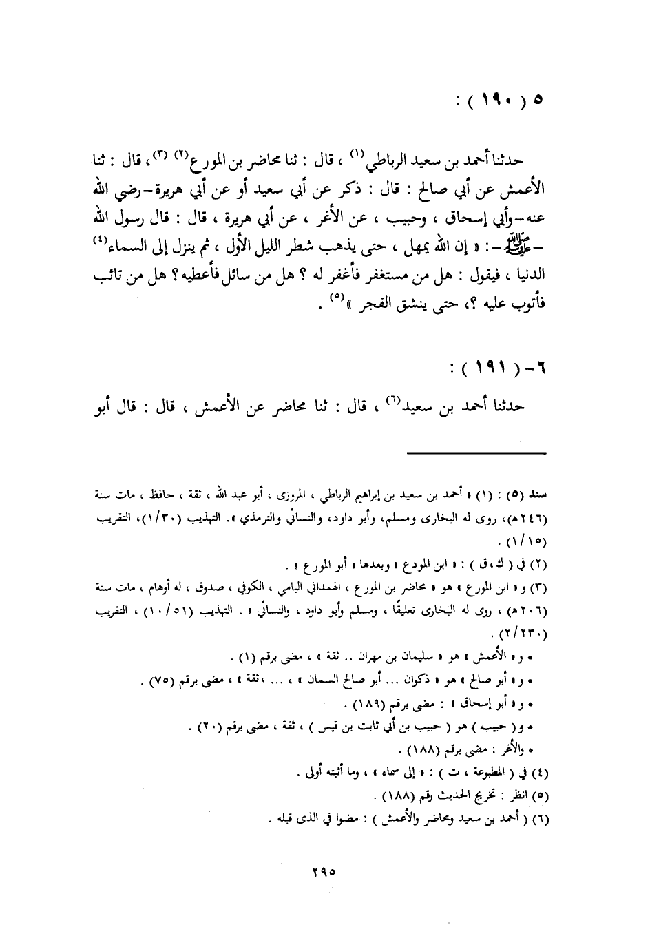 حَدَّثَنَا أَحْمَدُ بْنُ سَعِيدٍ الرِّبَاطِيُّ، ثنا مُحَاضِرُ بْنُ الْمُوَرِّعِ، قَالَ: ثنا الْأَعْمَشُ، عَنْ أَبِي صَالِحٍ، قَالَ: ذَكَرَ عَنْ أَبِي سَعِيدٍ، أَوْ عَنْ أَبِي هُرَيْرَةَ، رَضِيَ اللَّهُ عَنْهُ، وَأَبِي إِسْحَاقَ، وَحَبِيبٍ، عَنِ الْأَغَرِّ، عَنْ أَبِي هُرَيْرَةَ، قَالَ: قَالَ رَسُولُ اللَّهِ صَلَّى اللهُ عَلَيْهِ وَسَلَّمَ: " إِنَّ اللَّهَ يُمْهِلُ حَتَّى يَذْهَبَ شَطْرُ اللَّيْلِ الْأَوَّلُ، ثُمَّ يَنْزِلُ إِلَى السَّمَاءِ الدُّنْيَا، فَيَقُولُ: §هَلْ مِنْ مُسْتَغْفِرٍ فَأَغْفِرَ لَهُ؟ هَلْ مِنْ سَائِلٍ فَأُعْطِيَهُ؟ هَلْ مِنْ تَائِبٍ فَأَتُوبَ عَلَيْهِ؟، حَتَّى يَنْشَقَّ الْفَجْرُ " حَدَّثَنَا أَحْمَدُ بْنُ سَعِيدٍ، قَالَ: ثنا مُحَاضِرٌ، عَنِ الْأَعْمَشِ، قَالَ: قَالَ أَبُو -[296]- سُفْيَانَ، عَنْ جَابِرٍ، أَنَّهُ قَالَ: ذَاكَ فِي كُلِّ لَيْلَةٍ