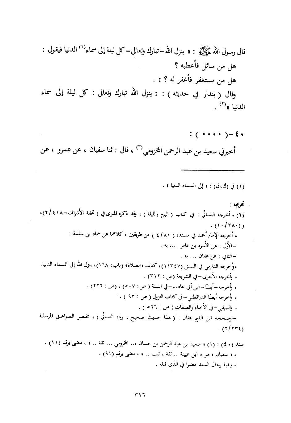 40 - أَخْبَرَنِي سَعِيدُ بْنُ عَبْدِ الرَّحْمَنِ الْمَخْزُومِيُّ قَالَ: ثنا سُفْيَانُ، عَنْ عَمْرِو، عَنْ -[317]- نَافِعِ بْنِ جُبَيْرٍ، عَنْ رَجُلٍ مِنْ أَصْحَابِ النَّبِيِّ صَلَّى اللهُ عَلَيْهِ وَسَلَّمَ قَالَ: " §إِذَا ذَهَبَ نِصْفُ اللَّيْلِ يَنْزِلُ اللَّهُ تَبَارَكَ وَتَعَالَى، إِلَى سَمَاءِ الدُّنْيَا، فَيَفْتَحُ بَابَهَا، فَيَقُولُ: مَنْ ذَا الَّذِي يَسْأَلُنِي فَأُعْطِيَهُ؟ مَنْ ذَا الَّذِي يَدْعُونِي فَأَسْتَجِيبَ لَهُ؟ حَتَّى يَطْلُعَ الْفَجْرُ " قَالَ أَبُو بَكْرٍ: لَيْسَ رِوَايَةُ سُفْيَانَ بْنِ عُيَيْنَةَ مِمَّا تُوهِنُ رِوَايَةَ حَمَّادِ بْنِ سَلَمَةَ، لِأَنَّ جُبَيْرَ بْنَ مُطْعِمٍ هُوَ رَجُلٌ مِنْ أَصْحَابِ النَّبِيِّ صَلَّى اللهُ عَلَيْهِ وَسَلَّمَ، وَقَدْ يَشُكُّ الْمُحَدِّثُ فِي بَعْضِ الْأَوْقَاتِ فِي بَعْضِ رُوَاةِ الْخَبَرِ، وَيَسْتَيْقِنُ فِي بَعْضِ الْأَوْقَاتِ، وَرُبَّمَا شَكَّ سَامِعُ -[318]- الْخَبَرِ مِنَ الْمُحَدِّثِ فِي اسْمِ بَعْضِ الرُّوَاةِ، فَلَا يَكُونُ شَكُّ مَنْ شَكَّ فِي اسْمِ بَعْضِ الرُّوَاةِ، مِمَّا يُوهِنُ مِنْ حِفْظِ اسْمِ الرَّاوِي حَمَّادُ بْنُ سَلَمَةَ رَحِمَهُ اللَّهُ قَدْ حَفِظَ اسْمَ جُبَيْرِ بْنِ مُطْعِمٍ فِي هَذَا الْإِسْنَادِ وَإِنْ كَانَ ابْنُ عُيَيْنَةَ شَكَّ فِي اسْمِهِ، فَقَالَ عَنْ رَجُلٍ مِنْ أَصْحَابِ النَّبِيِّ صَلَّى اللهُ عَلَيْهِ وَسَلَّمَ وَخَبَرُ الْقَاسِمِ بْنِ عَبَّاسٍ إِسْنَادٌ آخَرُ: نَافِعُ بْنُ جُبَيْرٍ، عَنْ أَبِي هُرَيْرَةَ رَضِيَ اللَّهُ عَنْهُ وَغَيْرُ مُسْتَنْكَرٍ لِنَافِعِ بْنُ جُبَيْرٍ مَعَ جَلَالَتِهِ، وَمَكَانِهِ مِنَ الْعِلْمِ أَنْ يَرْوِيَ خَبَرًا عَنْ صَحَابِيٍّ عَنِ النَّبِيِّ صَلَّى اللهُ عَلَيْهِ وَسَلَّمَ، وَعَنْ جَمَاعَةٍ مِنْ أَصْحَابِ النَّبِيِّ صَلَّى اللهُ عَلَيْهِ وَسَلَّمَ أَيْضًا، وَلَعَلَّ نَافِعًا إِنَّمَا رَوَى خَبَرَ أَبِي هُرَيْرَةَ عَنِ النَّبِيِّ صَلَّى اللهُ عَلَيْهِ وَسَلَّمَ - الَّذِي رَوَاهُ عَنْ أَبِيهِ لِزِيَادَةِ الْمَعْنَى فِي خَبَرِ أَبِي هُرَيْرَةَ، لِأَنَّ فِي خَبَرِ أَبِي هُرَيْرَةَ: «فَلَا يَزَالُ كَذَلِكَ حَتَّى تَرَجَّلَ الشَّمْسُ» -[319]-، وَلَيْسَ فِي خَبَرِهِ عَنْ أَبِيهِ ذِكْرُ الْوَقْتِ، إِلَّا أَنَّ فِيَ خَبَرِ ابْنِ عُيَيْنَةَ «حَتَّى يَطْلُعَ الْفَجْرُ» ، وَبَيْنَ طُلُوعِ الْفَجْرِ وَبَيْنَ تَرَجُّلِ الشَّمْسِ سَاعَةٌ طَوِيلَةٌ فَلَفْظُ خَبَرِهِ الَّذِي رَوَى عَنْهُ أَبِيهِ، أَوْ عَنْ رَجُلٍ مِنْ أَصْحَابِ النَّبِيِّ صَلَّى اللهُ عَلَيْهِ وَسَلَّمَ غَيْرُ مُسَمًّى بِلَفْظٍ غَيْرِ لَفْظِ خَبَرِهِ، الَّذِي رَوَى عَنْ أَبِي هُرَيْرَةَ، فَهَذَا كَالدَّالِ عَلَى أَنَّهُمَا خَبَرَانِ لَا خَبَرًا وَاحِدًا