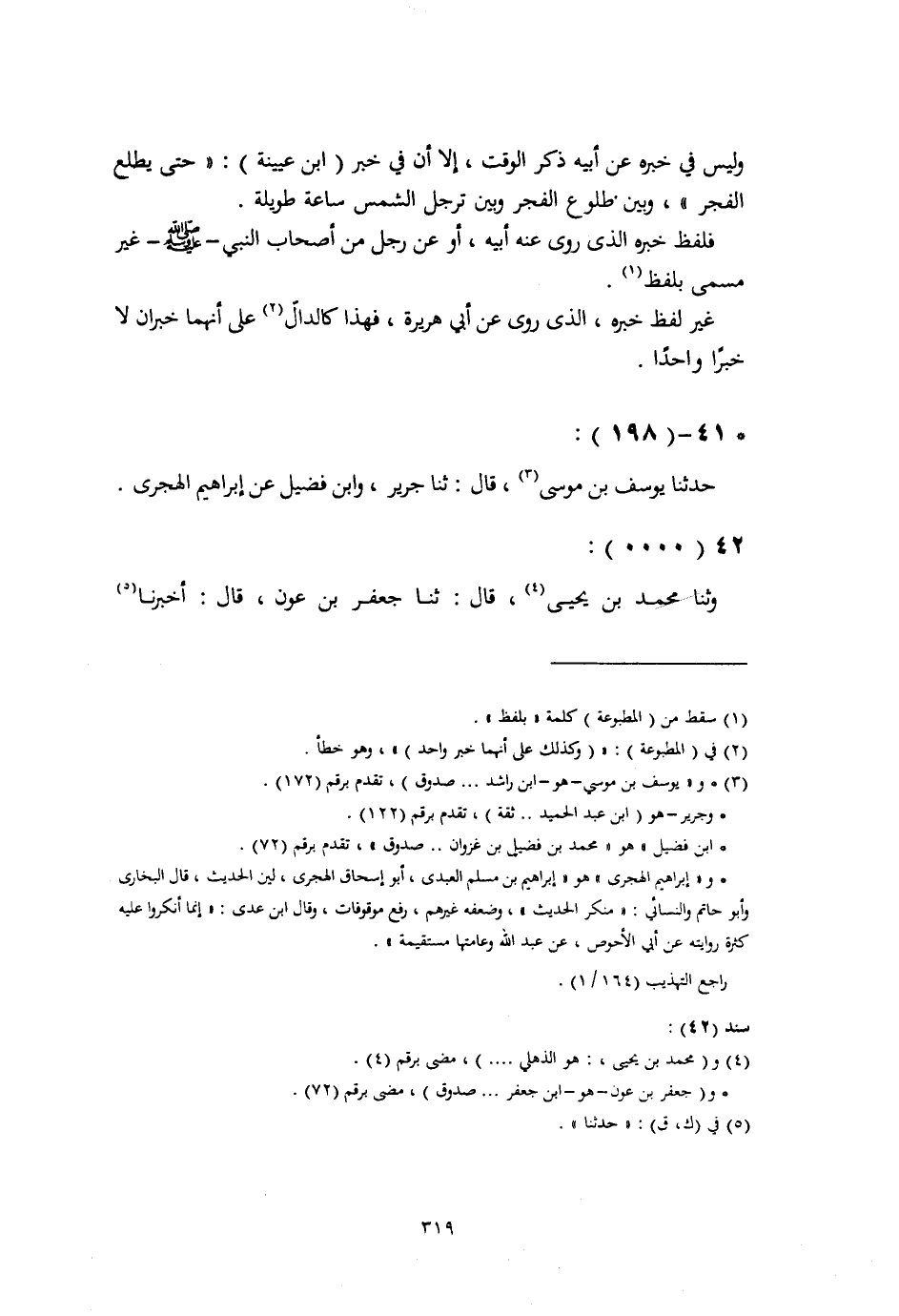 41 - حَدَّثَنَا يُوسُفُ بْنُ مُوسَى، قَالَ: ثنا جَرِيرٌ، وَابْنُ فُضَيْلٍ، عَنْ إِبْرَاهِيمَ الْهَجَرِيِّ،