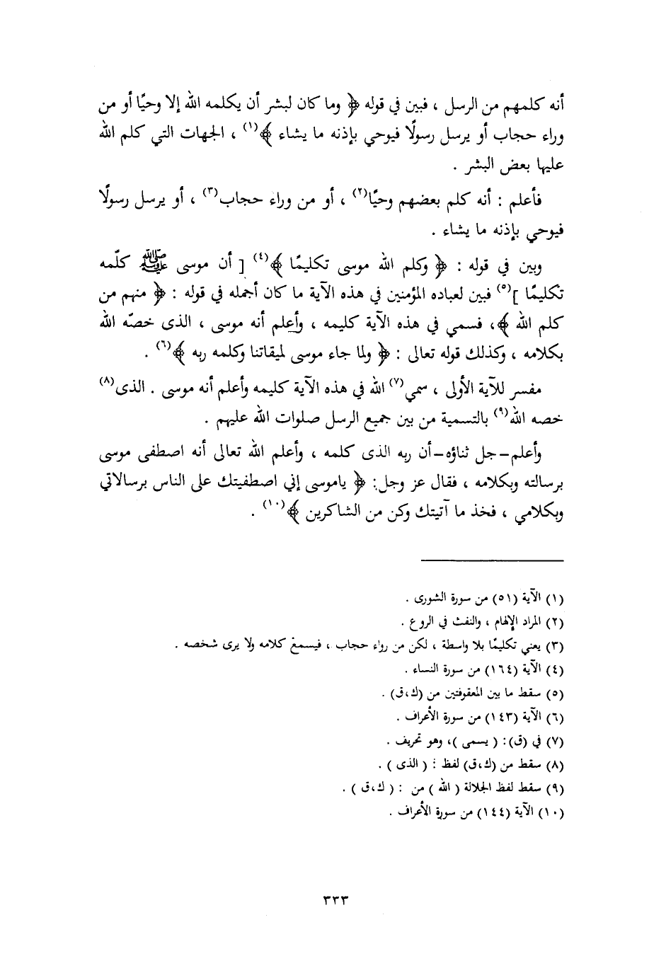 أَنَّهُ كَلَّمَهُمْ مِنَ الرُّسُلِ، فَبَيَّنَ فِي قَوْلِهِ: { «وَمَا كَانَ لِبَشَرٍ أَنْ يُكَلِّمَهُ اللَّهُ إِلَّا وَحْيًا أَوْ مِنْ وَرَاءِ حِجَابٍ أَوْ يُرْسِلَ رَسُولًا فَيُوحِي بِإِذْنِهِ مَا يَشَاءُ» } [الشورى: 51] ، الْجِهَاتِ الَّتِي كَلَّمَ اللَّهُ عَلَيْهَا بَعْضَ الْبَشَرِ، فَأَعْلَمَ: أَنَّهُ كَلَّمَ بَعْضَهُمْ وَحْيًا، أَوْ مِنْ وَرَاءِ حِجَابٍ، أَوْ يُرْسِلُ رَسُولًا فَيُوحِي بِإِذْنِهِ مَا يَشَاءُ وَبَيَّنَ فِي قَوْلِهِ: { «وَكَلَّمَ اللَّهُ مُوسَى تَكْلِيمًا» } [النساء: 164] أَنَّ مُوسَى صَلَّى اللهُ عَلَيْهِ وَسَلَّمَ كَلَّمَهُ تَكْلِيمًا، فَبَيَّنَ لِعِبَادِهِ الْمُؤْمِنِينَ فِي هَذِهِ الْآيَةِ مَا كَانَ أَجْمَلَهُ فِي قَوْلِهِ: { «مِنْهُمْ مَنْ كَلَّمَ اللَّهُ» } [البقرة: 253] ، فَسُمِّيَ فِي هَذِهِ الْآيَةِ كَلِيمُهُ، وَأَعْلَمَ أَنَّهُ مُوسَى، الَّذِي خَصَّهُ اللَّهُ بِكَلَامِهِ، وَكَذَلِكَ قَوْلِهِ تَعَالَى: { «وَلَمَّا جَاءَ مُوسَى لِمِيقَاتِنَا وَكَلَّمَهُ رَبُّهُ» } [الأعراف: 143] مُفَسِّرٌ لِلْآيَةِ الْأُولَى، سَمَّى اللَّهُ فِي هَذِهِ الْآيَةِ كَلِيمَهُ، وَأَعْلَمَ أَنَّهُ مُوسَى الَّذِي خَصَّهُ اللَّهُ بِالتَّسْمِيَةِ مِنْ بَيْنِ جَمِيعِ الرُّسُلِ صَلَوَاتُ اللَّهِ عَلَيْهِمْ، وَأَعْلَمَ جَلَّ ثَنَاؤُهُ أَنَّ رَبَّهُ الَّذِي كَلَّمَهُ، وَأَعْلَمَ اللَّهُ تَعَالَى أَنَّهُ اصْطَفَى مُوسَى بِرِسَالَتِهِ وَبِكَلَامِهِ، فَقَالَ عَزَّ وَجَلَّ: { «يَا مُوسَى إِنِّي اصْطَفَيْتُكَ عَلَى النَّاسِ بِرِسَالَاتِي وَبِكَلَامِي، فَخُذْ مَا آتَيْتُكَ وَكُنْ مِنَ الشَّاكِرِينَ» } [الأعراف
