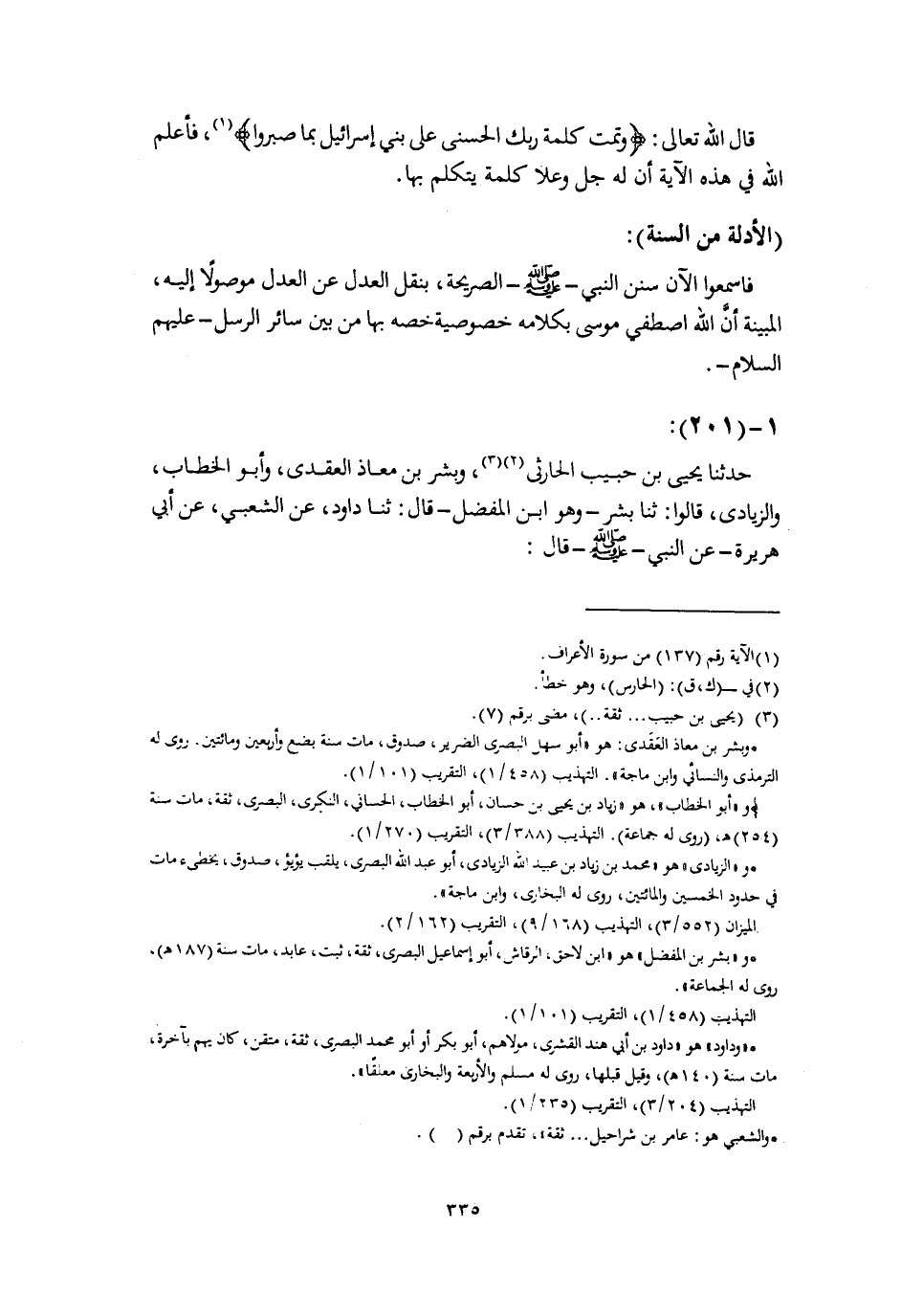 : 12] قَالَ اللَّهُ تَعَالَى: { «وَتَمَّتْ كَلِمَةُ رَبِّكَ الْحُسْنَى عَلَى بَنِي إِسْرَائِيلَ بِمَا صَبَرُوا» } ، فَأَعْلَمَ اللَّهُ فِي هَذِهِ الْآيَةِ أَنَّ لَهُ جَلَّ وَعَلَا كَلِمَةً يَتَكَلَّمُ بِهَا الْأَدِلَّةُ مِنَ السُّنَّةِ: فَاسْمَعُوا الْآنَ سُنَنَ النَّبِيِّ صَلَّى اللهُ عَلَيْهِ وَسَلَّمَ الصَّرِيحَةَ، بِنَقْلِ الْعَدْلِ عَنِ الْعَدْلِ مَوْصُولًا إِلَيْهِ، الْمُبَيِّنَةَ أَنَّ اللَّهَ اصْطَفَى مُوسَى بِكَلَامِهِ خُصُوصِيَّةً خَصَّهُ بِهَا مِنْ بَيْنِ سَائِرِ الرُّسُلِ عَلَيْهِمُ السَّلَامُ