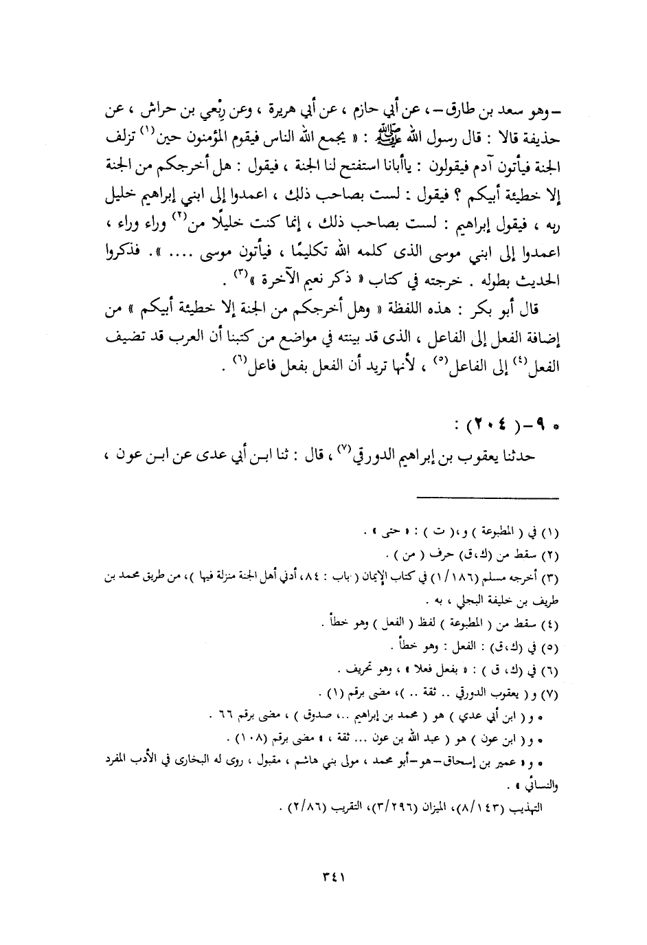 حَدَّثَنَا يَعْقُوبُ بْنُ إِبْرَاهِيمَ الدَّوْرَقِيُّ، قَالَ: ثنا ابْنُ أَبِي عَدِيٍّ، عَنِ ابْنِ عَوْنٍ -[342]-، عَنْ عُمَيْرِ بْنِ إِسْحَاقَ، أَنَّ جَعْفَرًا وَهُوَ ابْنُ أَبِي طَالِبٍ قَالَ: " يَا نَبِيَّ اللَّهِ، §ائْذَنْ لِي أَنْ آتِيَ أَرْضًا أَعْبُدُ اللَّهَ فِيهَا لَا أَخَافُ أَحَدًا، قَالَ: فَأَذِنَ لَهُ , فَأَتَى أَرْضَ الْحَبَشَةِ قَالَ: فَحَدَّثَنَا عُمَرُ بْنُ الْعَاصِ، أَوْ قَالَ: قَالَ عَمْرُو بْنُ الْعَاصِ: لَمَّا رَأَيْتُ جَعْفَرًا وَأَصْحَابَهُ آمِنِينَ بِأَرْضِ الْحَبَشَةِ حَسَدْتُهُ، قَالَ: قُلْتُ: لَأَسْتَقْبِلَنَّ هَذَا وَأَصْحَابَهُ، قَالَ: فَأَتَيْتُ النَّجَاشِيَّ، فَقُلْتُ: إِنَّ بِأَرْضِكَ رَجُلًا ابْنُ عَمِّهِ بِأَرْضِنَا يَزْعُمُ أَنَّهُ لَيْسَ لِلنَّاسِ إِلَّا إِلَهٌ وَاحِدٌ، وَإِنَّكَ وَاللَّهِ إِنْ لَمْ تَقْتُلْهُ وَأَصْحَابَهُ لَا أَقْطَعُ إِلَيْكَ هَذِهِ الْقَطِيعَةَ أَبَدًا أَنَا وَلَا أَحَدُ أَصْحَابِي، قَالَ: اذْهَبْ إِلَيْهِ فَادْعُهُ، قَالَ: قُلْتُ: إِنَّهُ لَا يَجِيءُ مَعِي، فَأَرْسِلْ مَعِي رَسُولًا، فَأَتَيْتُهُ وَهُوَ بَيْنَ ظَهْرَيْ أَصْحَابِهِ يُحَدِّثُهُمْ، قَالَ: فَقَالَ لَهُ أَجِبْ، قَالَ: فَجِئْنَا إِلَى الْبَابِ، فَنَادَيْتُ: ائْذَنْ لِعَمْرِو بْنِ الْعَاصِ، فَرَفَعَ صَوْتَهُ: ائْذَنْ لِحِزْبِ اللَّهِ، قَالَ: فَسَمِعَ صَوْتَهُ، فَأَذِنَ لَهُ قَبْلِي، قَالَ: فَوَصَفَ لِي عَمْرٌو السَّرِيرَ، قَالَ: وَقَعَدَ جَعْفَرٌ بَيْنَ يَدَيِ السَّرِيرِ وَأَصْحَابُهُ حَوْلَهُ عَلَى الْوَسَائِدِ قَالَ: قَالَ عَمْرٌو: فَجِئْتُ فَلَمَّا رَأَيْتُ مَجْلِسَهُ قَعَدْتُ بَيْنَهُ وَبَيْنَ السَّرِيرِ، فَجَعَلْتُهُ خَلْفَ ظَهْرِي، قَالَ: وَأَقْعَدْتُ بَيْنَ كُلِّ رَجُلَيْنِ مِنْ أَصْحَابِهِ رَجُلًا مِنْ أَصْحَابِي -[343]-، قَالَ: قَالَ النَّجَاشِيُّ: نَخِّرْ يَا عَمْرُو بْنَ الْعَاصِ - أَيْ تَكَلَّمْ - قَالَ: فَقُلْتُ: ابْنُ عَمِّ هَذَا بِأَرْضِنَا يَزْعُمُ أَنْ لَيْسَ لِلنَّاسِ إِلَهٌ إِلَّا إِلَهٌ وَاحِدٌ، وَإِنَّكَ وَاللَّهِ لَئِنْ لَمْ تَقْتُلْهُ وَأَصْحَابَهُ لَا أَقْطَعُ إِلَيْكَ هَذَا الْقَطِيعَةَ أَبَدًا، أَنَا وَلَا أَحَدٌ مِنْ أَصْحَابِي، قَالَ: نَخِّرْ يَا حِزْبَ اللَّهِ، نَخِّرْ، قَالَ: فَحَمِدَ اللَّهَ وَأَثْنَى عَلَيْهِ، وَشَهِدَ أَنْ لَا إِلَهَ إِلَّا اللَّهُ، وَأَنَّ مُحَمَّدًا رَسُولُ اللَّهِ، وَقَالَ: صَدَقَ، هُوَ ابْنُ عَمِّي، وَأَنَا عَلَى دِينِهِ، قَالَ عَمْرٌو: فَوَاللَّهِ إِنِّي أَوَّلُ مَا سَمِعْتُ التَّشَهُّدَ قَطُّ إِلَّا يَوْمَئِذٍ، قَالَ بِيَدِهِ هَكَذَا، وَوَضَعَ ابْنُ عَدِيٍّ يَدَهُ عَلَى جَبِينِهِ، وَقَالَ أَوَّهْ أَوَّهْ حَتَّى قُلْتُ فِي نَفْسِي: الْعَنِ الْعَبْدَ الْحَبَشِيَّ أَلَّا يَتَكَلَّمَ، قَالَ: ثُمَّ رَفَعَ يَدَهُ، فَقَالَ: يَا جَعْفَرُ، مَا يَقُولُ فِي عِيسَى؟ قَالَ: يَقُولُ: هُوَ رُوحُ اللَّهِ وَكَلِمَتُهُ، قَالَ: فَأَخَذَ شَيْئًا تَافِهًا مِنَ الْأَرْضِ، قَالَ: مَا أَخْطَأَ مِنْهُ مِثْلَ هَذِهِ، قُمْ يَا حِزْبَ اللَّهِ، فَأَنْتَ آمِنٌ بِأَرْضِي، مَنْ قَاتَلَكَ قَتَلْتُهُ، وَمَنْ سَبَّكَ غَرَّمْتُهُ، قَالَ: وَقَالَ: لَوْلَا مُلْكِي وَقَوْمِي لَاتَّبَعْتُكَ فَقُمْ، وَقَالَ لِآذِنِهِ: انْظُرْ هَذَا، فَلَا تَحْجُبْهُ عَنِّي إِلَّا أَنْ أَكُونَ مَعَ أَهْلِي، فَإِنْ أَبَى إِلَّا أَنْ يَدْخُلَ فَأْذَنْ لَهُ، وَقُمْ أَنْتَ يَا عُمْرُو بْنَ الْعَاصِ، فَوَاللَّهِ مَا أُبَالِي أَلَّا تَقْطِعَ إِلَيَّ هَذِهِ الْقِطْعَةَ أَبَدًا، أَنْتَ وَلَا أَحَدًا مِنْ أَصْحَابِكَ، قَالَ: فَلَمْ نَعُدْ أَنْ خَرَجْنَا مِنْ عِنْدِهِ، فَلَمْ يَكُنْ أَحَدٌ أَلْقَاهُ -[344]- خَالِيًا أَحَبَّ إِلَيَّ مِنْ جَعْفَرٍ، قَالَ: فَلَقِيتُهُ ذَاتَ 
