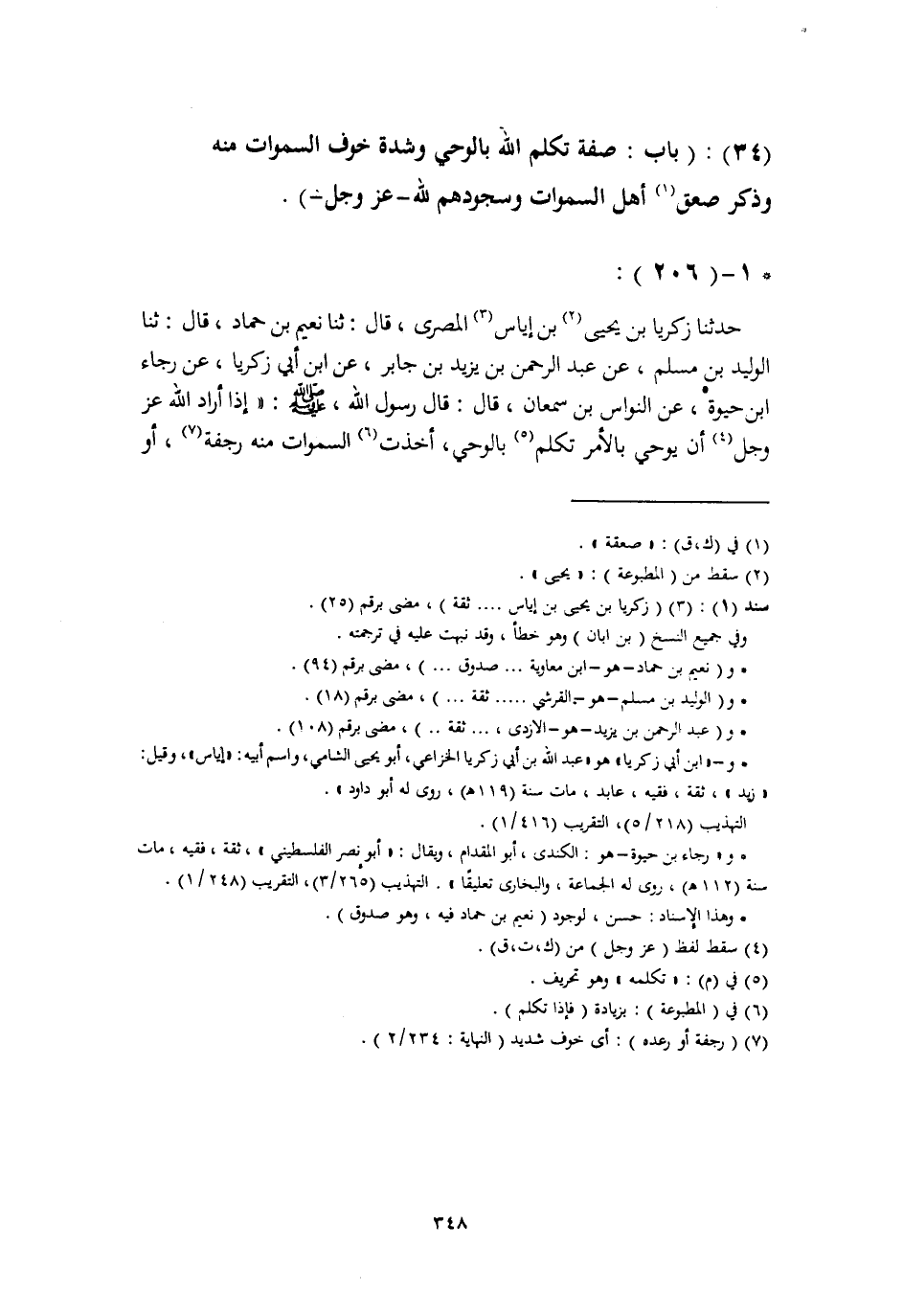حَدَّثَنَا زَكَرِيَّا بْنُ يَحْيَى بْنِ إِيَاسٍ الْمِصْرِيُّ، قَالَ: ثنا نُعَيْمُ بْنُ حَمَّادٍ، قَالَ: ثنا الْوَلِيدُ بْنُ مُسْلِمٍ، عَنْ عَبْدِ الرَّحْمَنِ بْنِ يَزِيدَ بْنِ جَابِرٍ، عَنِ ابْنِ أَبِي زَكَرِيَّا، عَنْ رَجَاءِ بْنِ حَيْوَةَ، عَنِ النَّوَّاسِ بْنِ سَمْعَانَ، قَالَ: قَالَ رَسُولُ اللَّهِ صَلَّى اللهُ عَلَيْهِ وَسَلَّمَ: " §إِذَا أَرَادَ اللَّهُ عَزَّ وَجَلَّ أَنْ يُوحِيَ بِالْأَمْرِ تَكَلَّمَ بِالْوَحْيِ أَخَذَتِ السَّمَاوَاتُ مِنْهُ رَجْفَةً، أَوْ -[349]- قَالَ رِعْدَةً شَدِيدَةً، خَوْفًا مِنَ اللَّهِ، فَإِذَا سَمِعَ بِذَلِكَ أَهْلُ السَّمَاوَاتِ صَعِقُوا، وَخَرُّوا لِلَّهِ سُجَّدًا، فَيَكُونُ أَوَّلَ مَنْ يَرْفَعُ رَأْسَهُ جِبْرِيلُ، فَيُكَلِّمُهُ اللَّهُ مِنْ وَحْيِهِ بِمَا أَرَادَ، ثُمَّ يَمُرُّ جِبْرِيلُ عَلَى الْمَلَائِكَةِ، كُلَّمَا مَرَّ بِسَمَاءِ سَمَاءٍ سَأَلَهُ مَلَائِكَتُهَا: مَاذَا قَالَ رَبُّنَا يَا جِبْرِيلُ؟ فَيَقُولُ جِبْرِيلُ عَلَيْهِ السَّلَامُ: قَالَ الْحَقَّ، وَهُوَ الْعَلِيُّ الْكَبِيرُ قَالَ: فَيَقُولُونَ: كُلُّهُمْ مِثْلَ مَا قَالَ جِبْرِيلُ، فَيَنْتَهِي جِبْرِيلُ بِالْوَحْيِ حَيْثُ أَمَرَهُ اللَّهُ " قَالَ أَبُو بَكْرٍ: عَبْدُ اللَّهِ بْنُ أَبِي زَكَرِيَّا أَحَدُ عُبَّادِهِمْ