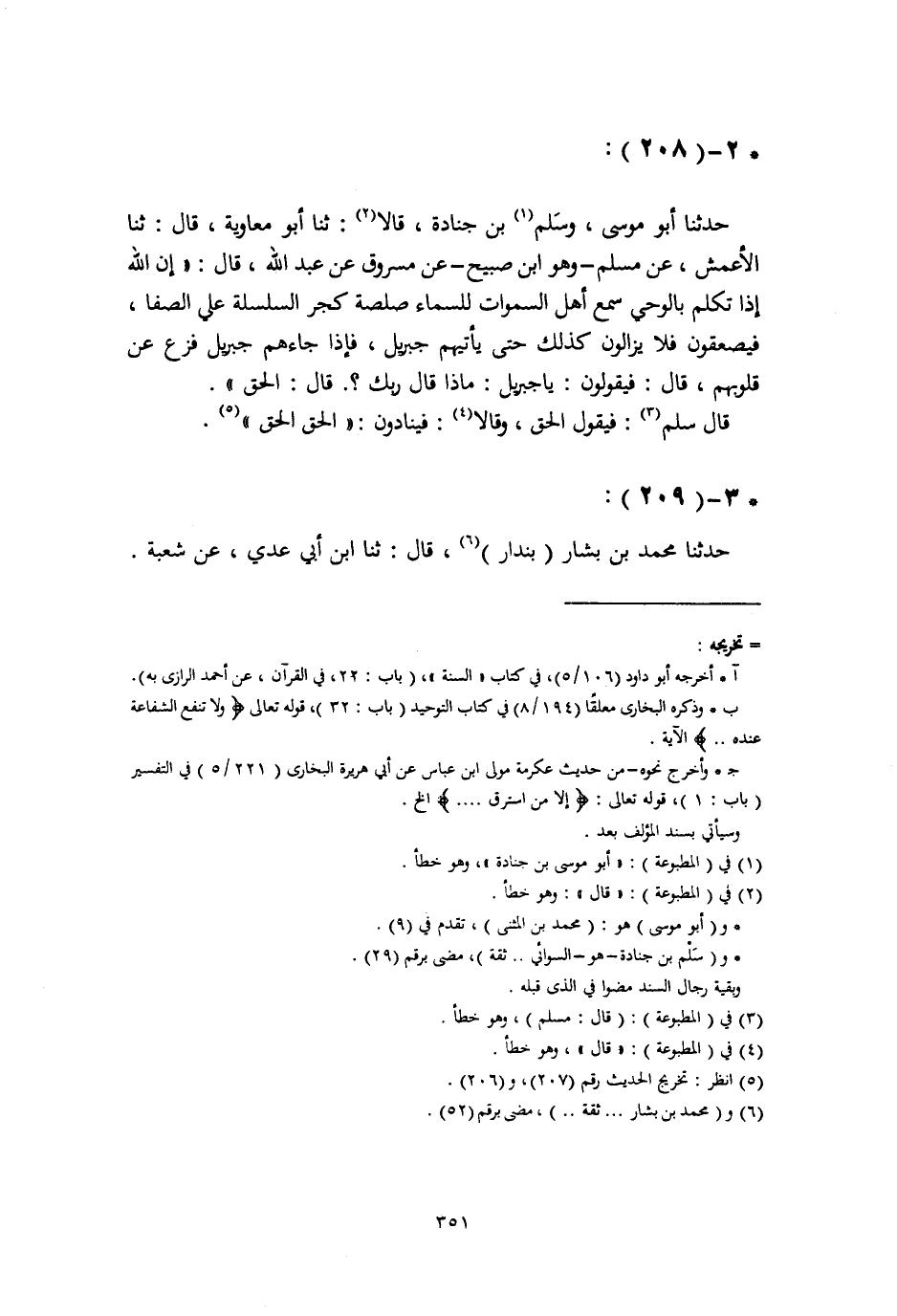 حَدَّثَنَا مُحَمَّدُ بْنُ بَشَّارٍ بُنْدَارٌ قَالَ: ثنا ابْنُ أَبِي عَدِيٍّ، عَنْ شُعْبَةَ -[352]-، وَثنا بِشْرُ بْنُ خَالِدٍ الْعَسْكَرِيُّ، قَالَ: ثنا مُحَمَّدٌ، عَنْ شُعْبَةَ، عَنْ سُلَيْمَانَ، قَالَ: سَمِعْتُ أَبَا الضُّحَى يُحَدِّثُ عَنْ مَسْرُوقٍ، قَالَ: قَالَ عَبْدُ اللَّهِ: " §إِذَا تَكَلَّمَ اللَّهُ بِالْوَحْيِ سَمِعَ أَهْلُ السَّمَاءِ صَلْصَلَةً كَصَلْصَلَةِ السِّلْسِلَةِ عَلَى الصَّفْوَانِ، فَيَرَوْنَ أَنَّهُ مِنْ أَمْرِ السَّمَاءِ، فَيَفْزَعُونَ، فَإِذَا سَكَنَ عَنْ قُلُوبِهِمْ {قَالُوا مَاذَا قَالَ رَبُّكُمْ قَالُوا الْحَقَّ وَهُوَ الْعَلِيُّ الْكَبِيرُ} [سبأ: 23] هَذَا حَدِيثُ مُحَمَّدِ بْنِ صُبَيْحٍ، الصَّوَابُ مُسْلِمُ بْنُ صُبَيْحٍ