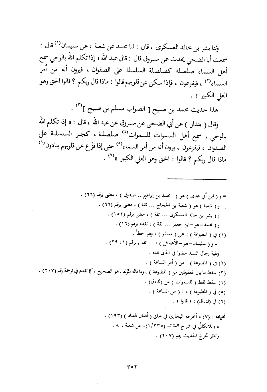 وَقَالَ بُنْدَارٌ عَنْ أَبِي الضُّحَى، عَنْ مَسْرُوقٍ، عَنْ عَبْدِ اللَّهِ قَالَ: " §إِذَا تَكَلَّمَ اللَّهُ بِالْوَحْيِ، سَمِعَ أَهْلُ السَّمَاوَاتِ لِلسَّمَاوَاتِ صَلْصَلَةً كَجَرِّ السِّلْسِلَةِ عَلَى الصَّفْوَانِ، فَيُفْزَعُونَ، يَرَوْنَ أَنَّهُ مِنْ أَمْرِ السَّمَاءِ حَتَّى إِذَا فُزِّعَ عَنْ قُلُوبِهِمْ يُنَادُونَ مَاذَا قَالَ رَبُّكُمْ؟ قَالُوا: الْحَقَّ وَهُوَ الْعَلِيُّ الْكَبِيرُ "
