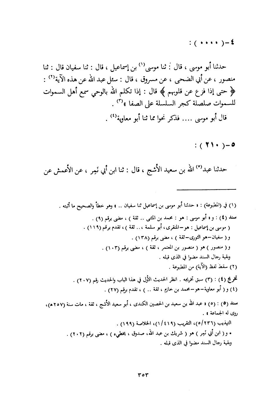 حَدَّثَنَا عَبْدُ اللَّهِ بْنُ سَعِيدٍ الْأَشَجُّ، قَالَ: ثنا ابْنُ أَبِي نَمِرٍ، عَنِ الْأَعْمَشِ، عَنْ -[354]- مُسْلِمٍ، عَنْ مَسْرُوقٍ، عَنْ عَبْدِ اللَّهِ، قَالَ: §إِذَا تَكَلَّمَ اللَّهُ سُبْحَانَهُ وَتَعَالَى بِالْوَحْيِ، سَمِعَ أَهْلُ السَّمَاوَاتِ صَلْصَلَةً كَصَلْصَلَةِ السِّلْسِلَةِ عَلَى الصَّفْوَانِ، فَيُصْعَقُونَ لِذَلِكَ، وَيَخِرُّونَ سُجَّدًا، فَإِذَا عَلِمُوا أَنَّهُ وَحْيٌ، فُزِّعَ عَنْ قُلُوبِهِمْ قَالَ: رُدَّتْ إِلَيْهِمْ أَرْوَاحُهُمْ، فَيُنَادِي أَهْلُ السَّمَاوَاتِ بَعْضُهُمْ بَعْضًا: مَاذَا قَالَ رَبُّكُمْ؟ قَالُوا الْحَقَّ وَهُوَ الْعَلِيُّ الْكَبِيرُ