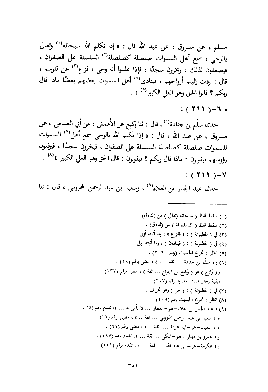 حَدَّثَنَا سَلْمُ بْنُ جُنَادَةَ، قَالَ: ثنا وَكِيعٌ، عَنِ الْأَعْمَشِ، عَنْ أَبِي الضُّحَى، عَنْ مَسْرُوقٍ، عَنْ عَبْدِ اللَّهِ، قَالَ: " §إِذَا تَكَلَّمَ اللَّهُ بِالْوَحْيِ سَمِعَ أَهْلُ السَّمَاوَاتِ لِلسَّمَاوَاتِ صَلْصَلَةً كَصَلْصَلَةِ السِّلْسِلَةِ عَلَى الصَّفْوَانِ، فَيَخِرُّونَ سُجَّدًا، فَيَرْفَعُونَ رُءُوسَهُمْ فَيَقُولُونَ: مَاذَا قَالَ رَبُّكُمْ؟ فَيَقُولُونَ: قَالَ الْحَقَّ وَهُوَ الْعَلِيُّ الْكَبِيرُ "
