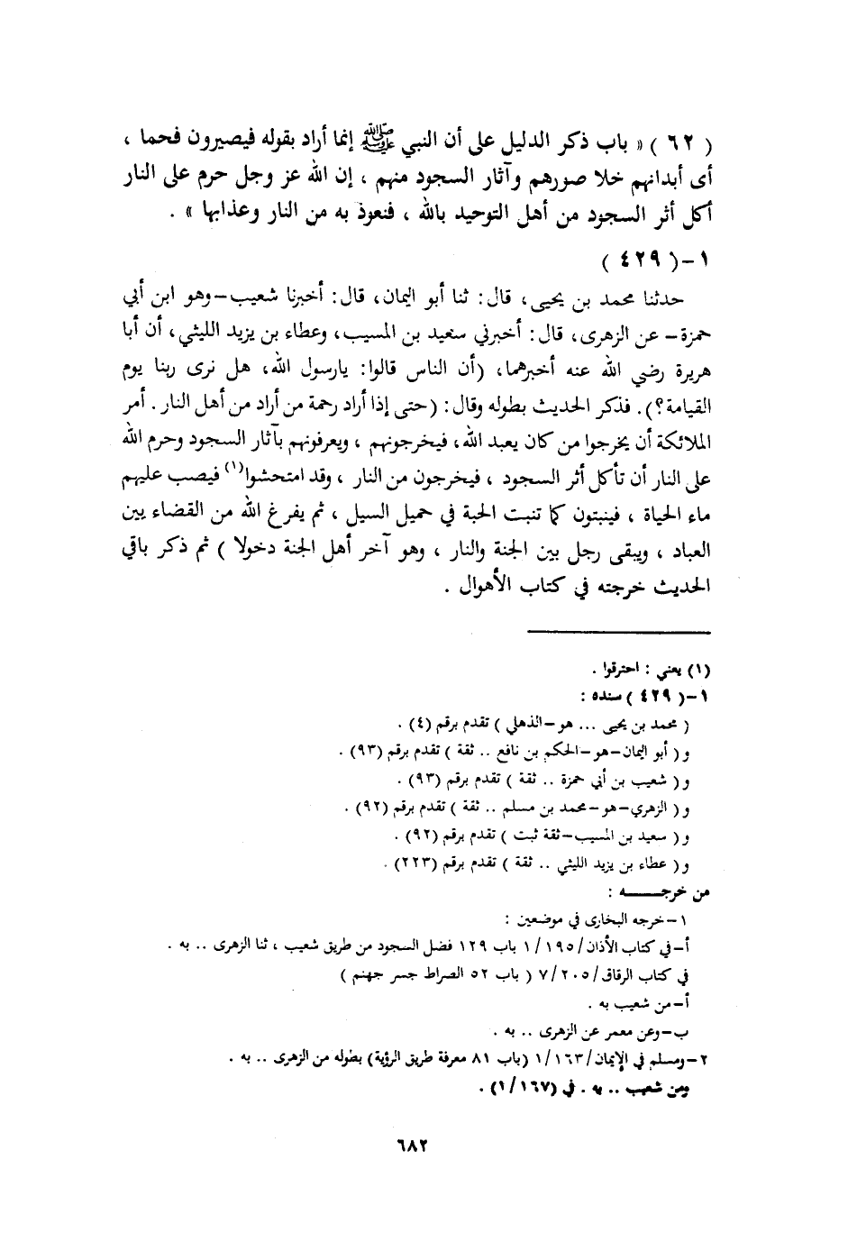 حَدَّثَنَا مُحَمَّدُ بْنُ يَحْيَى، قَالَ: ثَنَا أَبُو الْيَمَانِ، قَالَ: أَخْبَرَنَا شُعَيْبٌ وَهُوَ ابْنُ أَبِي حَمْزَةَ، عَنِ الزُّهْرِيِّ، قَالَ: أَخْبَرَنِي سَعِيدُ بْنُ الْمُسَيِّبِ، وَعَطَاءُ بْنُ يَزِيدَ اللَّيْثِيُّ، أَنَّ أَبَا هُرَيْرَةَ، رَضِيَ اللَّهُ عَنْهُ أَخْبَرَهُمَا، أَنَّ النَّاسَ قَالُوا: يَا رَسُولَ اللَّهِ، هَلْ نَرَى رَبَّنَا يَوْمَ الْقِيَامَةِ؟ فَذَكَرَ الْحَدِيثَ بِطُولِهِ وَقَالَ: «حَتَّى إِذَا أَرَادَ رَحْمَةَ مَنْ أَرَادَ مِنْ أَهْلِ النَّارِ أَمَرَ الْمَلَائِكَةَ أَنْ يُخْرِجُوا مَنْ كَانَ يَعْبُدُ اللَّهَ، فَيُخْرِجُونَهُمْ، وَيَعْرِفُونَهُمْ بِآثَارِ السُّجُودِ §وَحَرَّمَ اللَّهُ عَلَى النَّارِ أَنْ تَأْكُلَ أَثَرَ السُّجُودِ، فَيَخْرُجُونَ مِنَ النَّارِ، وَقَدِ امْتُحِشُوا فَيُصَبُّ عَلَيْهِمْ مَاءُ الْحَيَاةِ، فَيَنْبُتُونَ كَمَا تَنْبُتُ الْحِبَّةُ فِي حَمِيلِ السَّيْلِ، ثُمَّ يَفْرُغُ اللَّهُ مِنَ الْقَضَاءِ بَيْنَ الْعِبَادِ، وَيَبْقَى رَجُلٌ بَيْنَ الْجَنَّةِ وَالنَّارِ، وَهُوَ آخِرُ أَهْلِ الْجَنَّةِ دُخُولًا» ثُمَّ ذَكَرَ بَاقِيَ الْحَدِيثِ خَرَّجْتُهُ فِي كِتَابِ الْأَهْوَالِ -[683]- حَدَّثَنَا مُحَمَّدُ بْنُ يَحْيَى، قَالَ: ثَنَا سُلَيْمَانُ بْنُ دَاوُدَ الْهَاشِمِيُّ قَالَ: أَخْبَرَنَا إِبْرَاهِيمُ بْنُ سَعْدٍ، عَنِ ابْنِ شِهَابٍ، عَنْ عَطَاءِ بْنِ يَزِيدَ اللَّيْثِيِّ، أَنَّ أَبَا هُرَيْرَةَ رَضِيَ اللَّهُ عَنْهُ أَخْبَرَهُ أَنَّ النَّاسَ قَالُوا: يَا رَسُولَ اللَّهِ. وَحَدَّثَنَا مُحَمَّدٌ، قَالَ: ثَنَا عَبْدُ الرَّزَّاقِ، قَالَ: أَخْبَرَنَا مَعْمَرٌ، عَنِ الزُّهْرِيِّ، عَنْ عَطَاءِ بْنِ يَزِيدَ اللَّيْثِيِّ، عَنْ أَبِي هُرَيْرَةَ رَضِيَ اللَّهُ عَنْهُ قَالَ: قَالَ النَّاسُ: يَا رَسُولَ اللَّهِ، قَالَ مُحَمَّدُ بْنُ يَحْيَى: وَسَاقَا جَمِيعًا الْحَدِيثَ بِهَذَا الْخَبَرِ، غَيْرَ أَنَّهُمَا رُبَّمَا اخْتَلَفَا فِي اللَّفْظِ وَالشَّيْءِ، وَالْمَعْنَى وَاحِدٌ، قَالَ أَبُو بَكْرٍ: قَدَّمَ مُحَمَّدُ بْنُ يَحْيَى إِسْنَادَ عَبْدِ الرَّزَّاقِ عَلَى إِسْنَادِ حَدِيثِ الْهَاشِمِيِّ
