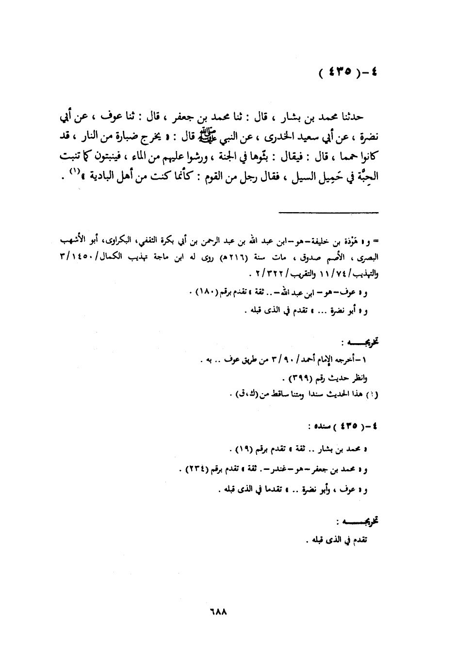 حَدَّثَنَا مُحَمَّدُ بْنُ بَشَّارٍ، قَالَ: ثَنَا مُحَمَّدُ بْنُ جَعْفَرٍ، قَالَ: ثَنَا عَوْفٌ، عَنْ أَبِي نَضْرَةَ، عَنْ أَبِي سَعِيدٍ الْخُدْرِيِّ، عَنِ النَّبِيِّ صَلَّى اللهُ عَلَيْهِ وَسَلَّمَ قَالَ: «§يَخْرُجُ ضُبَارَةٌ مِنَ النَّارِ، قَدْ كَانُوا حُمَمًا» ، قَالَ: " فَيُقَالُ: بُثُّوهَا فِي الْجَنَّةِ، وَرُشُّوا عَلَيْهِمْ مِنَ الْمَاءِ، فَيَنْبُتُونَ كَمَا تَنْبُتُ الْحَبَّةُ فِي حَمِيلِ السَّيْلِ "، فَقَالَ رَجُلٌ مِنَ الْقَوْمِ: كَأَنَّمَا كُنْتُ مِنْ أَهْلِ الْبَادِيَةِ