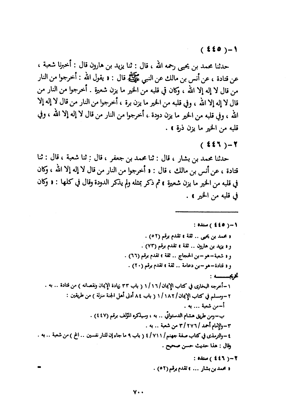 حَدَّثَنَا مُحَمَّدُ بْنُ يَحْيَى، رَحِمَهُ اللَّهُ، قَالَ: ثَنَا يَزِيدُ بْنُ هَارُونَ، قَالَ: أَخْبَرَنَا شُعْبَةُ، عَنْ قَتَادَةَ، عَنْ أَنَسِ بْنِ مَالِكٍ، عَنِ النَّبِيِّ صَلَّى اللهُ عَلَيْهِ وَسَلَّمَ قَالَ: " يَقُولُ اللَّهُ: §أَخْرِجُوا مِنَ النَّارِ مَنْ قَالَ لَا إِلَهَ إِلَّا اللَّهُ، وَكَانَ فِي قَلْبِهِ مِنَ الْخَيْرِ مَا يَزِنُ شَعِيرَةً أَخْرِجُوا مِنَ النَّارِ مَنْ قَالَ لَا إِلَهَ إِلَّا اللَّهُ، وَفِي قَلْبِهِ مِنَ الْخَيْرِ مَا يَزِنُ بُرَّةً، أَخْرِجُوا مِنَ النَّارِ مَنْ قَالَ لَا إِلَهَ إِلَّا اللَّهُ، وَفِي قَلْبِهِ مِنَ الْخَيْرِ مَا يَزِنُ دُودَةً أَخْرِجُوا مِنَ النَّارِ مَنْ قَالَ لَا إِلَهَ إِلَّا اللَّهُ، وَفِي قَلْبِهِ مِنَ الْخَيْرِ مَا يَزِنُ ذَرَّةً " حَدَّثَنَا مُحَمَّدُ بْنُ بَشَّارٍ، قَالَ: ثَنَا مُحَمَّدُ بْنُ جَعْفَرٍ، قَالَ: ثَنَا شُعْبَةُ، قَالَ: ثَنَا قَتَادَةُ، عَنْ أَنَسِ بْنِ مَالِكٍ، قَالَ: «أَخْرِجُوا مِنَ النَّارِ مَنْ قَالَ لَا إِلَهَ إِلَّا اللَّهُ، وَكَانَ فِي قَلْبِهِ مِنَ الْخَيْرِ مَا يَزِنُ شَعِيرَةً» ، ثُمَّ ذَكَرَ بِمِثْلِهِ وَلَمْ يَذْكُرِ الدُّودَةَ وَقَالَ فِي كُلِّهَا: «وَكَانَ فِي قَلْبِهِ مِنَ الْخَيْرِ» -[701]-، وَثَنَا بُنْدَارٌ فِي عَقِبِهِ، قَالَ: ثَنَا أَبُو دَاوُدَ، عَنْ شُعْبَةَ، عَنْ قَتَادَةَ، عَنْ أَنَسٍ، عَنِ النَّبِيِّ صَلَّى اللهُ عَلَيْهِ وَسَلَّمَ بِمِثْلِ حَدِيثِ مُحَمَّدِ بْنِ جَعْفَرٍ