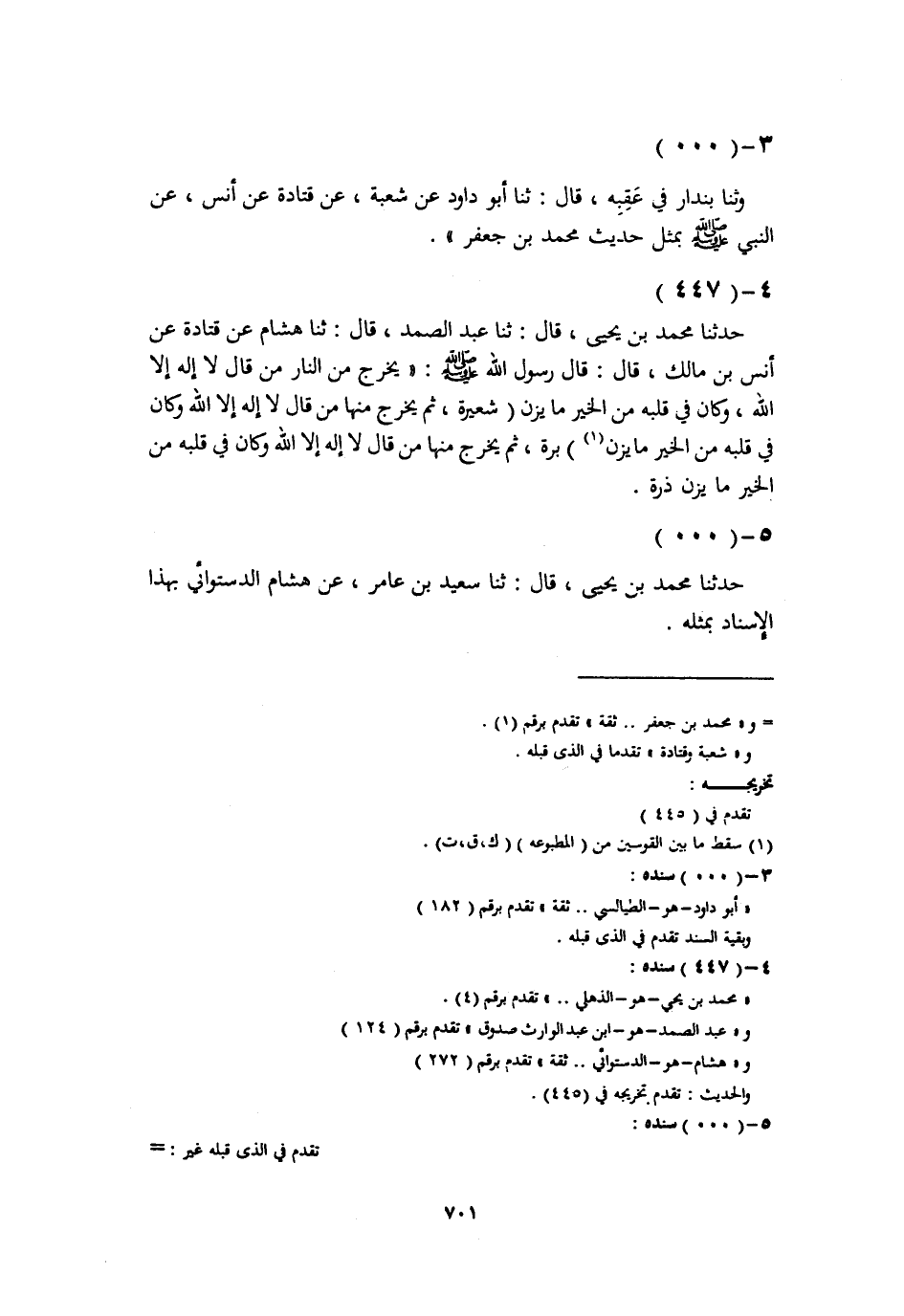 حَدَّثَنَا مُحَمَّدُ بْنُ يَحْيَى، قَالَ: ثَنَا عَبْدُ الصَّمَدِ، قَالَ: ثَنَا هِشَامٌ، عَنْ قَتَادَةَ، عَنْ أَنَسِ بْنِ مَالِكٍ، قَالَ: قَالَ رَسُولُ اللَّهِ صَلَّى اللهُ عَلَيْهِ وَسَلَّمَ: «§يَخْرُجُ مِنَ النَّارِ مَنْ قَالَ لَا إِلَهَ إِلَّا اللَّهُ، وَكَانَ فِي قَلْبِهِ مِنَ الْخَيْرِ مَا يَزِنُ شَعِيرَةً، ثُمَّ يَخْرُجُ مِنْهَا مَنْ قَالَ لَا إِلَهَ إِلَّا اللَّهُ وَكَانَ فِي قَلْبِهِ مِنَ الْخَيْرِ مَا يَزِنُ بُرَّةً، ثُمَّ يَخْرُجُ مَنْ قَالَ لَا إِلَهَ اللَّهُ وَكَانَ فِي قَلْبِهِ مِنَ الْخَيْرِ مَا يَزِنُ ذَرَّةً» حَدَّثَنَا مُحَمَّدُ بْنُ يَحْيَى، قَالَ: ثَنَا سَعِيدُ بْنُ عَامِرٍ، عَنْ هِشَامٍ الدَّسْتَوَائِيِّ بِهَذَا الْإِسْنَادِ بِمِثْلِهِ