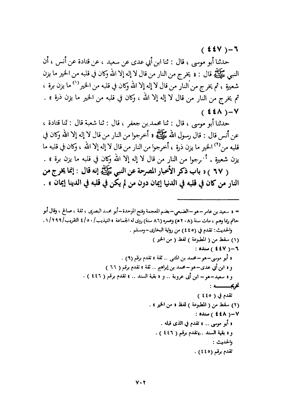 حَدَّثَنَا أَبُو مُوسَى، قَالَ: ثَنَا ابْنُ أَبِي عَدِيٍّ، عَنْ سَعِيدٍ، عَنْ قَتَادَةَ، عَنْ أَنَسٍ، أَنَّ النَّبِيَّ صَلَّى اللهُ عَلَيْهِ وَسَلَّمَ قَالَ: «§يَخْرُجُ مِنَ النَّارِ مَنْ قَالَ لَا إِلَهَ إِلَّا اللَّهُ وَكَانَ فِي قَلْبِهِ مِنَ الْخَيْرِ مَا يَزِنُ شَعِيرَةً، ثُمَّ يَخْرُجُ مِنَ النَّارِ مَنْ قَالَ لَا إِلَهَ اللَّهُ وَكَانَ فِي قَلْبِهِ مِنَ الْخَيْرِ مَا يَزِنُ بُرَّةً، ثم يَخْرُجُ مِنَ النَّارِ مَنْ قَالَ لَا إِلَهَ إِلَّا اللَّهُ وَكَانَ فِي قَلْبِهِ مِنَ الْخَيْرِ مَا يَزِنُ ذَرَّةً»