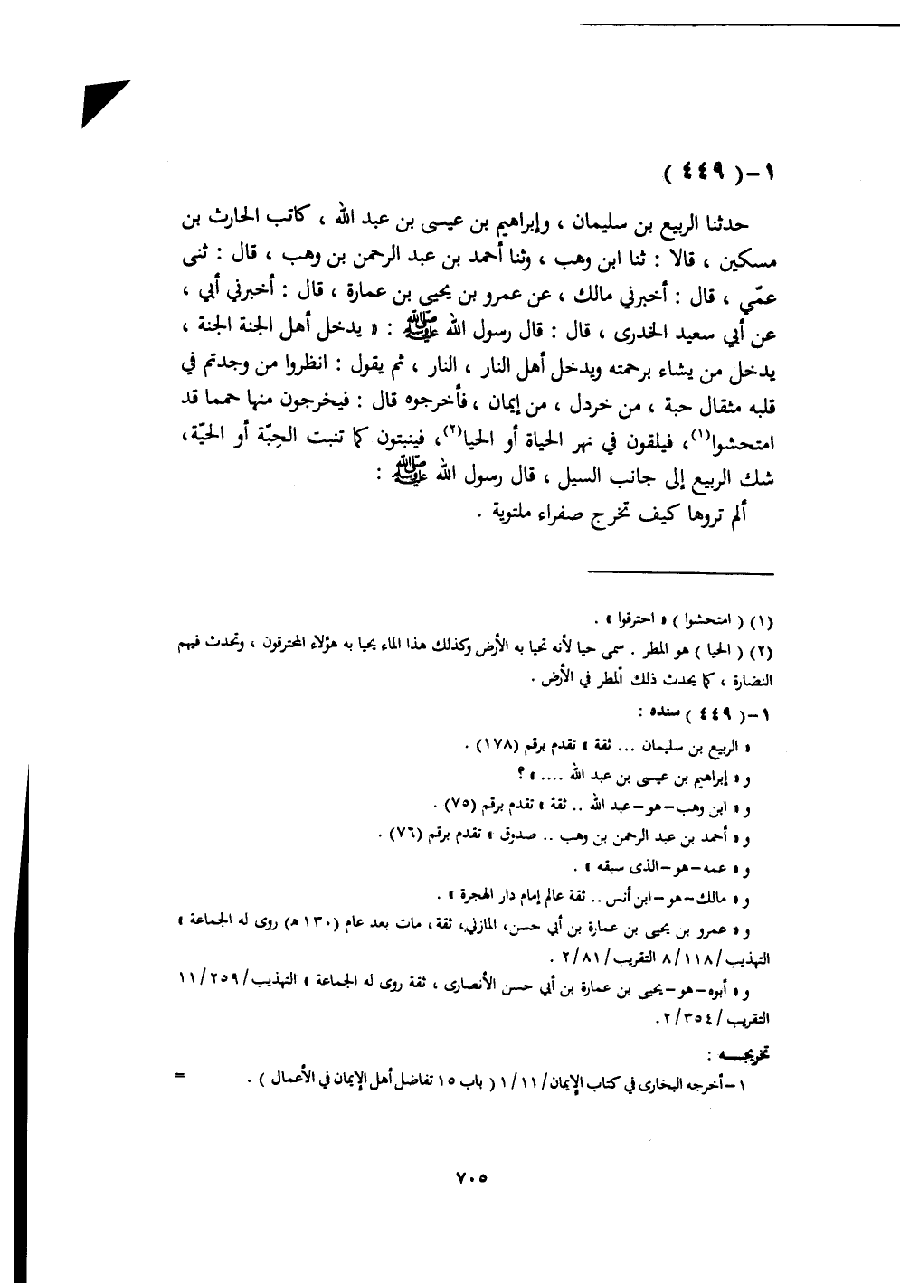 حَدَّثَنَا الرَّبِيعُ بْنُ سُلَيْمَانَ، وَإِبْرَاهِيمُ بْنُ عِيسَى بْنِ عَبْدِ اللَّهِ، كَاتِبُ الْحَارِثِ بْنِ مِسْكِينٍ، قَالَا: ثَنَا ابْنُ وَهْبٍ، وَثَنَا أَحْمَدُ بْنُ عَبْدِ الرَّحْمَنِ بْنِ وَهْبٍ، قَالَ: ثَنِي عَمِّي، قَالَ: أَخْبَرَنِي مَالِكٌ، عَنْ عَمْرِو بْنِ يَحْيَى بْنِ عُمَارَةَ، قَالَ: أَخْبَرَنِي أَبِي، عَنْ أَبِي سَعِيدٍ الْخُدْرِيِّ، قَالَ: قَالَ رَسُولُ اللَّهِ صَلَّى اللهُ عَلَيْهِ وَسَلَّمَ: " §يَدْخُلُ أَهْلُ الْجَنَّةِ الْجَنَّةَ، يُدْخِلُ مَنْ يَشَاءُ بِرَحْمَتِهِ وَيَدْخُلُ أَهْلُ النَّارِ النَّارَ، ثُمَّ يَقُولُ: انْظُرُوا مَنْ وَجَدْتُمْ فِي قَلْبِهِ مِثْقَالَ حَبَّةٍ مِنْ خَرْدَلٍ، مِنْ إِيمَانٍ، فَأَخْرِجُوهُ قَالَ: فَيُخْرِجُونَ مِنْهَا حُمَمًا قَدِ امْتُحِشُوا، فَيُلْقَوْنَ فِي نَهَرِ الْحَيَاةِ أَوِ الْحَيَا، فَيَنْبُتُونَ كَمَا تَنْبُتُ الْحَبَّةُ أَوِ الْحَيَّةُ «، شَكَّ الرَّبِيعُ» إِلَى جَانِبِ السَّيْلِ "، قَالَ رَسُولُ اللَّهِ صَلَّى اللهُ عَلَيْهِ وَسَلَّمَ: «أَلَمْ تَرَوْهَا كَيْفَ تَخْرُجُ صَفْرَاءَ مُلْتَوِيَةً» -[706]- وَقَالَ إِبْرَاهِيمُ بْنُ عِيسَى: «يُدْخِلُ اللَّهُ أَهْلَ الْجَنَّةِ الْجَنَّةَ» ، وَقَالَ: «الْحِبَّةُ إِلَى جَانِبِ السَّيْلِ» ، قَالَ أَحْمَدُ: الْحِبَّةُ وَلَمْ يَشُكَّ، وَقَالَ ثَنَا مَالِكٌ قَالَ أَبُو بَكْرٍ: هَذَا الْخَبَرُ مُخْتَصَرٌ، حُذِفَ مِنْهُ أَوَّلُ الْقِصَّةِ فِي الشَّفَاعَةِ، لِمَنْ أُدْخِلَ النَّارَ، مِنْ أَهْلِ التَّوْحِيدِ، وَذَكَرَ آخِرَ الْقِصَّةِ، وَالدَّلِيلُ عَلَى صِحَّةِ مَا ذَكَرْتُ أَنَّ الْخَبَرَ مُخْتَصَرٌ، خَبَرُ زَيْدِ بْنِ أَسْلَمَ، عَنْ عَطَاءِ بْنِ يَسَارٍ، عَنْ أَبِي سَعِيدٍ الْخُدْرِيِّ، عَنِ النَّبِيِّ صَلَّى اللهُ عَلَيْهِ وَسَلَّمَ قَالَ: " فَيَقُولُ اللَّهُ: انْظُرُوا مَنْ كَانَ فِي قَلْبِهِ زِنَةُ دِينَارٍ مِنْ إِيمَانٍ، أَخْرِجُوهُ " ثُمَّ ذَكَرَ زِنَةَ قِيرَاطٍ، ثُمَّ ذَكَرَ زِنَةَ مِثْقَالِ حَبَّةِ خَرْدَلٍ، قَدْ خَرَّجْتُ هَذَا الْخَبَرَ، فِي غَيْرِ هَذَا الْبَابِ بِتَمَامِهِ