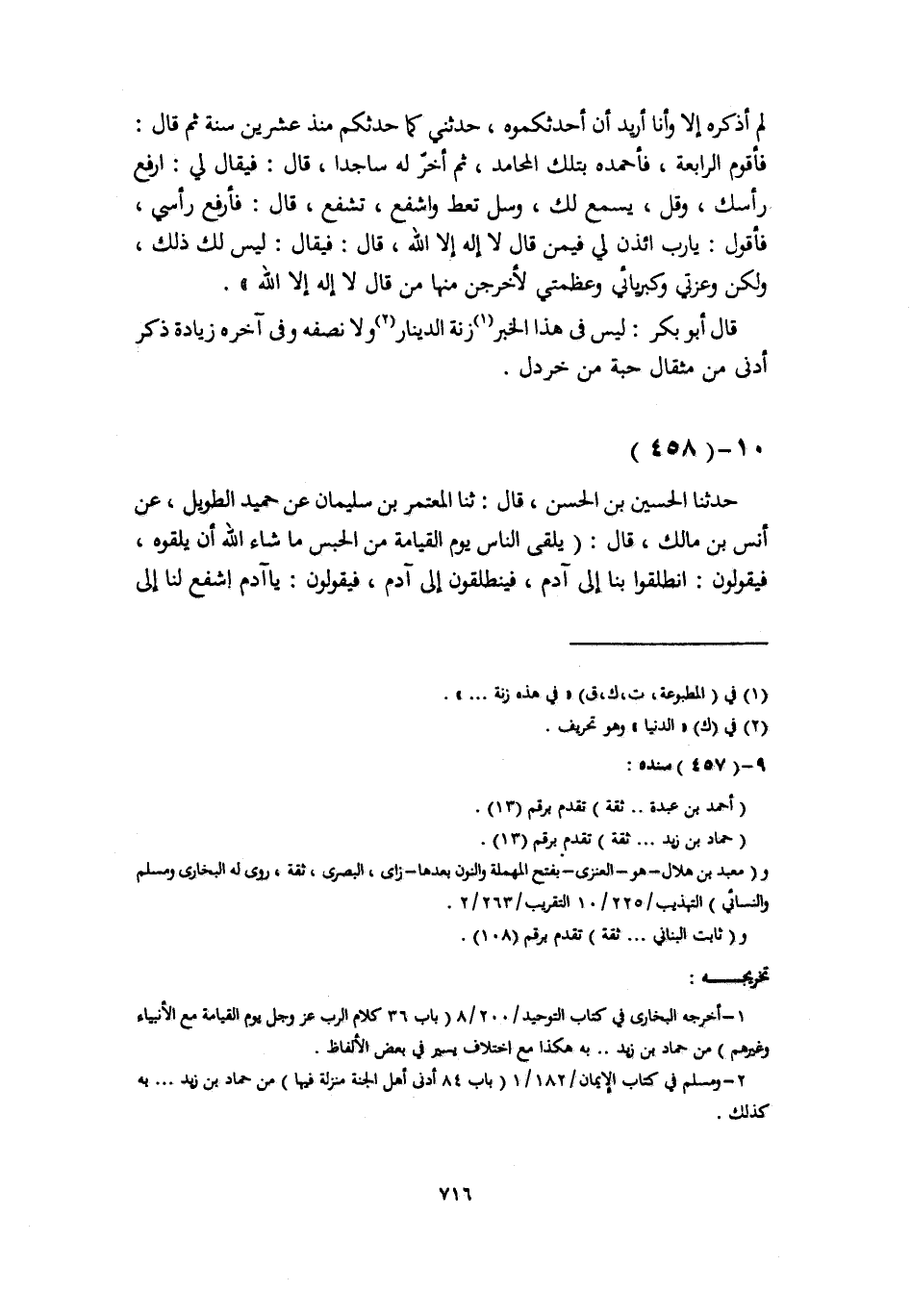 حَدَّثَنَا الْحُسَيْنُ بْنُ الْحَسَنِ، قَالَ: ثَنَا الْمُعْتَمِرُ بْنُ سُلَيْمَانَ، عَنْ حُمَيْدٍ الطَّوِيلِ، عَنْ أَنَسِ بْنِ مَالِكٍ، قَالَ: يَلْقَى النَّاسُ يَوْمَ الْقِيَامَةِ مِنَ الْحَبْسِ مَا شَاءَ اللَّهُ أَنْ يَلْقَوْهُ، فَيَقُولُونَ: انْطَلِقُوا بِنَا إِلَى آدَمَ، فَيَنْطَلِقُونَ إِلَى آدَمَ فَيَقُولُونَ: يَا آدَمُ اشْفَعْ لَنَا إِلَى -[717]- رَبِّكَ، فَيَقُولُ: لَسْتُ هُنَاكَ، وَلَكِنِ انْطَلِقُوا إِلَى خَلِيلِ اللَّهِ إِبْرَاهِيمَ، فَيَنْطَلِقُونَ إِلَى إِبْرَاهِيمَ فَيَقُولُونَ: يَا إِبْرَاهِيمُ اشْفَعْ لَنَا إِلَى رَبِّكَ، فَيَقُولُ: لَسْتُ هُنَاكَ، وَلَكِنِ انْطَلِقُوا إِلَى مَنِ اصْطَفَاهُ اللَّهُ بِرِسَالَاتِهِ، فَيَنْطَلِقُونَ إِلَى مُوسَى فَيَقُولُونَ: يَا مُوسَىُ اشْفَعْ لَنَا إِلَى رَبِّكَ، فَيَقُولُ: لَسْتُ هُنَاكَ، وَلَكِنِ انْطَلِقُوا إِلَى مَنْ جَاءَ الْيَوْمَ مَغْفُورًا لَهُ، لَيْسَ عَلَيْهِ ذَنْبٌ، فَيَنْطَلِقُونَ إِلَى مُحَمَّدٍ صَلَّى اللهُ عَلَيْهِ وَسَلَّمَ، فَيَقُولُونَ: يَا مُحَمَّدُ اشْفَعْ لَنَا إِلَى رَبِّكَ فَيَقُولُ: أَنَا لَهَا، وَأَنَا صَاحِبُهَا، قَالَ: فَأَنْطَلِقُ حَتَّى أَسْتَفْتِحَ بَابَ الْجَنَّةِ، قَالَ: فَيُفْتَحُ، فَأَدْخُلُ، وَرَبِّي عَزَّ وَجَلَّ عَلَى عَرْشِهِ فَأَخَرُّ سَاجِدًا، وَأَحْمَدُهُ بِمَحَامِدَ، لَمْ يَحْمَدْهُ بِهَا أَحَدٌ قَبْلِي، وَأَحْسِبُهُ قَالَ: وَلَا أَحَدٌ بَعْدِي، فَيُقَالُ: «يَا مُحَمَّدُ ارْفَعْ رَأْسَكَ وَقُلْ، يُسْمَعْ، وَسَلْ، تُعْطَهْ، وَاشْفَعْ تُشَفَّعْ» فَأَقُولُ: يَا رَبِّ، يَا رَبِّ، فَيَقُولُ: «§أَخْرِجْ مَنْ كَانَ فِي قَلْبِهِ مِثْقَالُ شَعِيرَةٍ مِنَ الْإِيمَانِ» ، قَالَ: فَأَخَرُّ سَاجِدًا، وَأَحْمَدُهُ بِمَحَامِدَ، لَمْ يَحْمَدْهُ بِهَا أَحَدٌ قَبْلِي وَأَحْسِبُهُ قَالَ: وَلَا أَحَدٌ بَعْدِي، فَيُقَالُ: «يَا مُحَمَّدُ ارْفَعْ رَأْسَكَ، وَقُلْ، يُسْمَعْ، وَسَلْ، تُعْطَهْ، وَاشْفَعْ تُشَفَّعْ» ، فَأَقُولُ: يَا رَبِّ يَا رَبِّ، فَيَقُولُ: " أَخْرِجْ مِنَ النَّارِ مَنْ كَانَ فِي قَلْبِهِ مِثْقَالُ شَعِيرَةٍ مِنْ إِيمَانٍ قَالَ: فَأَخِرُّ لَهُ سَاجِدًا، وَأَحْمَدُهُ بِمَحَامِدَ لَمْ يَحْمَدْهُ بِهَا أَحَدٌ قَبْلِي، وَأَحْسَبُهُ قَالَ: وَلَا أَحَدٌ بَعْدِي، فَيُقَالُ يَا مُحَمَّدُ ارْفَعْ رَأْسَكَ، وَقُلْ يُسْمَعْ، وَسَلْ تُعْطَهْ، وَاشْفَعْ تُشَفَّعْ، فَأَقُولُ يَا رَبِّ، فَيَقُولُ: أًخْرِجْ مَنْ كَانَ فِي قَلْبِةِ أَدْنَى شَيْءٍ «، فَيَخْرُجُ نَاسٌ مِنَ النَّارِ، يُقَالُ لَهُمُ الْجَهَنَّمِيُّونَ، وَإِنَّهُ لَفِي الْجَنَّةِ» فَقَالَ لَهُ رَجُلٌ: يَا أَبَا حَمْزَةَ أَسَمِعْتَ هَذَا مِنْ رَسُولِ اللَّهِ صَلَّى اللهُ عَلَيْهِ وَسَلَّمَ، قَالَ: فَتَغَيَّرَ وَجْهُهُ، وَاشْتَدَّ عَلَيْهِ وَقَالَ: لَيْسَ كُلُّ مَا نُحَدِّثُ سَمِعْنَاهُ مِنْ رَسُولِ اللَّهِ صَلَّى اللهُ عَلَيْهِ وَسَلَّمَ، وَلَكِنْ لَمْ يَكُنْ يُكَذِّبُ بَعْضُنَا بَعْضًا، قَالَ أَبُو بَكْرٍ: لَيْسَ فِي الْخَبَرِ ذِكْرُ عِيسَى عَلَيْهِ السَّلَامُ -[718]- قَالَ أَبُو بَكْرٍ: لَعَلَّهُ يَخْطِرُ بِبَالِ مَنْ يَسْمَعُ هَذِهِ الْأَخْبَارَ فَيَتَوَهَّمُ أَنَّ هَذِهِ اللَّفْظَةَ، لَيْسَ كُلُّ مَا نُحَدِّثُ سَمِعْنَاهُ مِنْ رَسُولِ اللَّهِ صَلَّى اللهُ عَلَيْهِ وَسَلَّمَ، فِي عَقِبِ هَذَا الْخَبَرِ، خِلَافَ خَبَرِ مَعْبَدِ بْنِ هِلَالٍ الَّذِي قَالَ فِيهِ: حَدَّثَنَا مُحَمَّدٌ صَلَّى اللهُ عَلَيْهِ وَسَلَّمَ، وَخِلَافَ خَبَرِ عَمْرِو بْنِ أَبِي عَمْرٍو، عَنْ أَنَسٍ قَالَ: سَمِعْتُ رَسُولَ اللَّهِ صَلَّى اللهُ عَلَيْهِ وَسَلَّمَ، وَلَيْسَ كَذَلِكَ هُوَ عِنْدَنَا بِحَمْدِ اللَّهِ وَنِعْمَتِهِ؛ لِأَنَّ فِي خَبَرِ عَمْرِو بْنِ أَب
