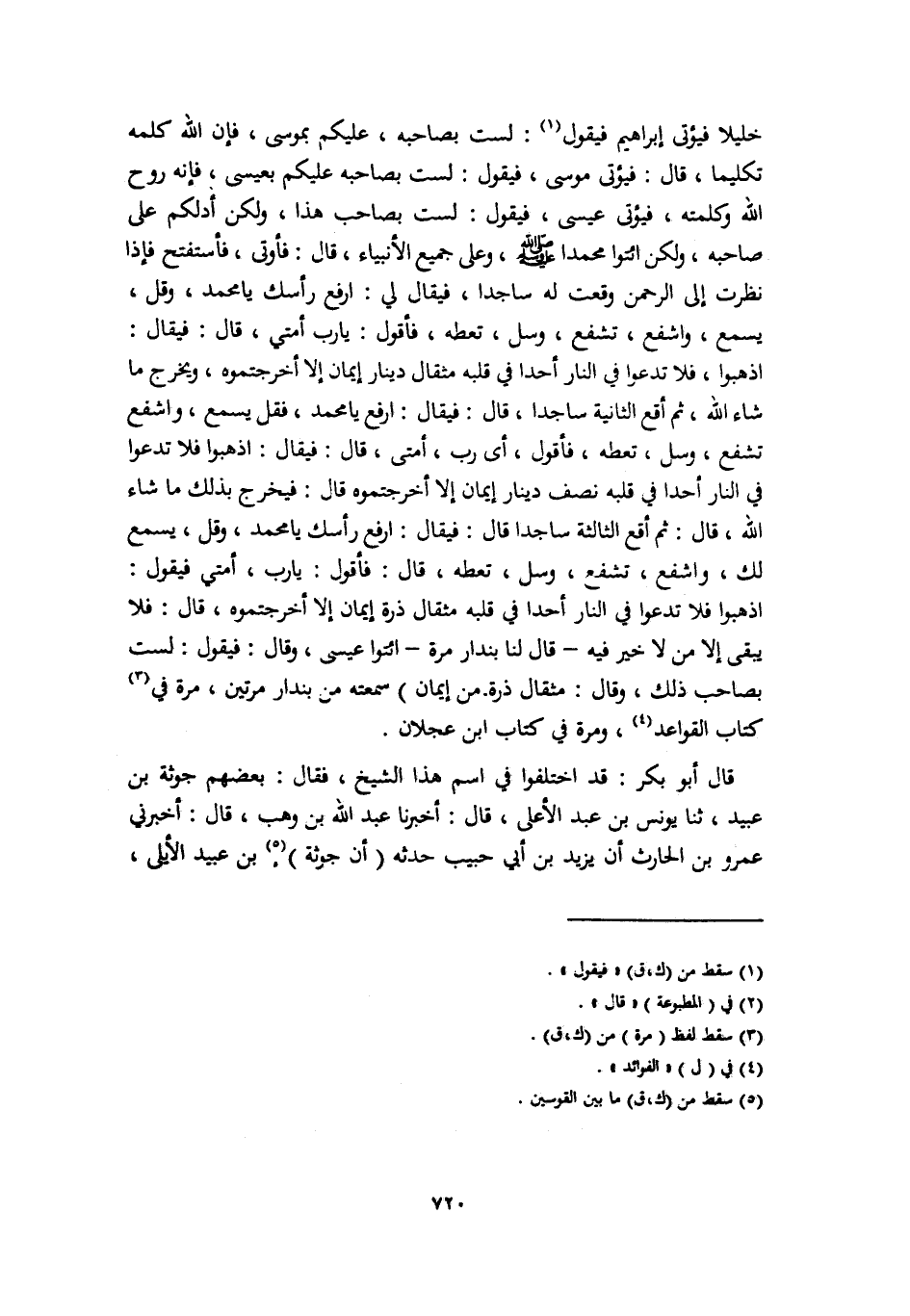 ثَنَا يُونُسُ بْنُ عَبْدِ الْأَعْلَى، قَالَ: أَخْبَرَنَا عَبْدُ اللَّهِ بْنُ وَهْبٍ، قَالَ: أَخْبَرَنِي عَمْرُو بْنُ الْحَارِثِ أَنَّ يَزِيدَ بْنِ أَبِي حَبِيبٍ حَدَّثَهُ أَنَّ جُوثَةَ بْنَ عُبَيْدٍ الْأَيْلِيَّ -[721]-، أَنَّهُ سَمِعَ أَنَسَ بْنَ مَالِكٍ يَقُولُ: إِنَّ اللَّهَ تَبَارَكَ وَتَعَالَى إِذَا قَضَى بَيْنَ خَلْقِهِ، فَأَدْخَلَ أَهْلَ الْجَنَّةِ الْجَنَّةَ وَأَدْخَلَ أَهْلَ النَّارِ النَّارَ، سَجَدَ مُحَمَّدٌ صَلَّى اللهُ عَلَيْهِ وَسَلَّمَ، فَأَطَالَ السُّجُودَ، فَيُنَادَى ارْفَعْ رَأْسَكَ يَا مُحَمَّدُ، اشْفَعْ، تُشَفَّعْ، وَسَلْ، تُعْطَهْ فَيَرْفَعُ رَأْسَهُ، فَيَقُولُ: يَا رَبُّ، أُمَّتِي، فَيَقُولُ اللَّهُ تَعَالَى عَزَّ وَجَلَّ لِلْمَلَائِكَةِ: §أَخْرِجُوا لِمُحَمَّدٍ صَلَّى اللهُ عَلَيْهِ وَسَلَّمَ مِنْ أُمَّتِهِ مَنْ كَانَ فِي قَلْبِهِ مِثْقَالُ قِيرَاطٍ مِنْ إِيمَانٍ فَيُخْرِجُونَ، ثُمَّ يَسْجُدُ الثَّانِيَةَ أَطْوَلَ مِنْ سَجْدَتِهِ الْأُولَى، قَالَ: فَيُقَالُ: ارْفَعْ رَأْسَكَ اشْفَعْ تُشَفَّعْ، وَسَلْ تُعْطَهْ، فَأَقُولُ: يَا رَبُّ أُمَّتِي فَيَقُولُ اللَّهُ عَزَّ وَجَلَّ لِلْمَلَائِكَةِ: أَخْرِجُوا مِنْ أُمَّتِهِ مَنْ كَانَ فِي قَلْبِهِ مِثْقَالُ شَعِيرَةٍ مِنْ إِيمَانٍ، ثُمَّ يَسْجُدُ الثَّالِثَةَ أَطْوَلَ مِنْ سَجْدَتِهِ، فَيُنَادَى ارْفَعْ رَأْسَكَ، اشْفَعْ، تُشَفَّعْ، وَسَلْ، تُعْطَهْ فَيَقُولُ: يَا رَبُّ، أُمَّتِي، فَيَقُولُ اللَّهُ لِلْمَلَائِكَةِ: أَخْرِجُوا لِمُحَمَّدٍ صَلَّى اللهُ عَلَيْهِ وَسَلَّمَ مَنْ كَانَ فِي قَلْبِهِ مِثْقَالُ حَبَّةِ خَرْدَلٍ مِنْ إِيمَانٍ، فَيُعْرَضُونَ عَلَيْهِ، فَيُخْرِجُونَهُمْ، قَدِ اسْوَدُّوا وَعَادُوا كَالنِّصَالِ الْمُحْرَقَةِ، فَيَدْخُلُونَ الْجَنَّةَ فَيُنَادِي بِهِمْ أَهْلُ الْجَنَّةِ، فَيَقُولُونَ: مَنْ هَؤُلَاءِ الَّذِينَ آذَانَا رِيحُهُمْ؟ فَتَقُولُ الْمَلَائِكَةُ: هَؤُلَاءِ الْجَهَنَّمِيُّونَ -[722]-، وَقَدْ أُخْرِجُوا بِشَفَاعَةِ مُحَمَّدٍ صَلَّى اللهُ عَلَيْهِ وَسَلَّمَ، فَيُذْهَبُ بِهِمْ إِلَى نَهَرِ الْحَيَوَانِ فَيَغْسِلُونَ وَيَتَوَضَّئُونَ، فَيَعُودُونَ أُنَاسًا مِنَ النَّاسِ غَيْرَ أَنَّهُمْ يُعْرَفُونَ فَقُلْتُ: يَا أَبَا حَمْزَةَ، وَمَا الْحَيَوَانُ؟ قَالَ: نَهَرٌ مِنْ أَنْهَارِ الْجَنَّةِ، هُوَ مِنْ أَدْنَاهَا قَالَ أَبُو بَكْرٍ: هَذِهِ اللَّفْظَةُ قَدِ اسْوَدُّوا وَعَادُوا كَالنِّصَالِ مِنَ الْجِنْسِ الَّذِي أَقُولُ إِنَّ الْعَوْدَ قَدْ يَكُونُ بَدْءًا، لِأَنَّ أَهْلَ النَّارِ لَمْ يَكُونُوا سُودًا كَالنِّصَالِ، قَبْلَ أَنْ يَدْخُلُوا النَّارَ، وَإِنَّمَا اسْوَدُّوا بَعْدَ مَا احْتَرَقُوا فِي النَّارِ فَمَعْنَى قَوْلِهِ: وَعَادُوا كَالنِّصَالِ الْمُحَرَّقَةِ، أَيْ صَارُوا كَالنِّصَالِ الْمُحَرَّقَةِ، فَأَوْقَعَ اسْمَ الْعَوْدِ، وَإِنَّمَا مَعْنَاهُ صَارُوا قَالَ أَبُو بَكْرٍ: هَذَا الشَّيْخُ هُوَ جُوثَةُ بْنُ عُبَيْدٍ، كَمَا قَالَهُ عَمْرُو بْنُ الْحَارِثِ، عَنْ يَزِيدَ بْنِ أَبِي حَبِيبٍ