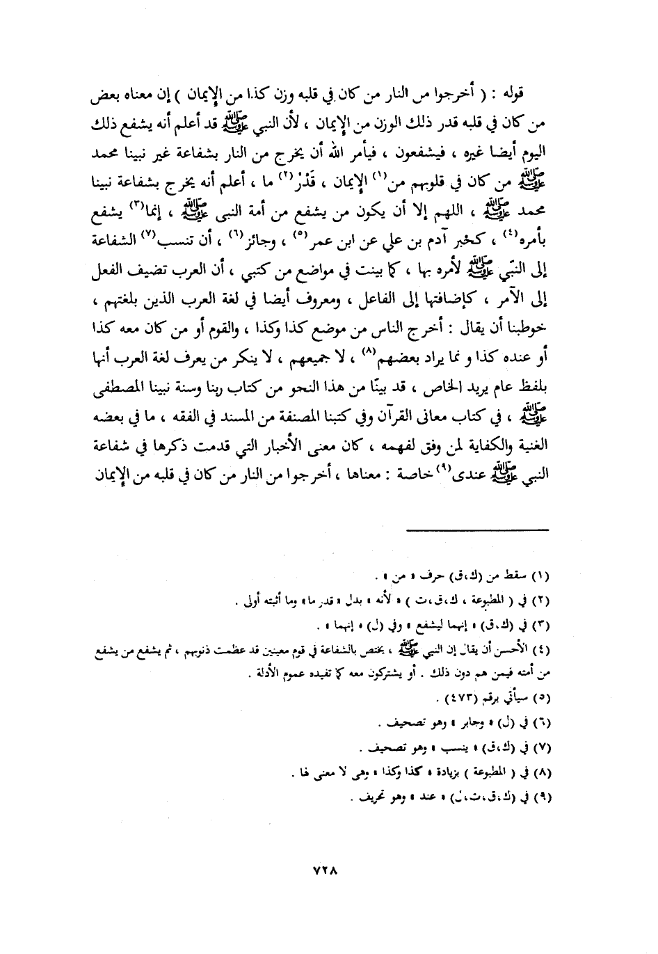 قَوْلُهُ: أَخْرِجُوا مِنَ النَّارِ مَنْ كَانَ فِي قَلْبِهِ وَزْنُ كَذَا مِنَ الْإِيمَانِ أَنَّ مَعْنَاهُ بَعْضُ مَنْ كَانَ فِي قَلْبِهِ قَدْرُ ذَلِكَ الْوَزْنِ مِنَ الْإِيمَانِ؛ لِأَنَّ النَّبِيَّ صَلَّى اللهُ عَلَيْهِ وَسَلَّمَ قَدْ أَعْلَمَ أَنَّهُ يَشْفَعُ ذَلِكَ الْيَوْمَ أَيْضًا غَيْرُهُ، فَيَشْفَعُونَ، فَيَأْمُرُ اللَّهُ أَنْ يُخْرَجَ مِنَ النَّارِ بِشَفَاعَةِ غَيْرِ نَبِيِّنَا مُحَمَّدٍ صَلَّى اللهُ عَلَيْهِ وَسَلَّمَ مَنْ كَانَ فِي قُلُوبِهِمْ مِنَ الْإِيمَانِ، قَدْرُ مَا أَعْلَمَ أَنَّهُ يَخْرُجُ بِشَفَاعَةِ نَبِيِّنَا مُحَمَّدٍ صَلَّى اللهُ عَلَيْهِ وَسَلَّمَ، اللَّهُمَّ إِلَّا أَنْ يَكُونَ مَنْ يَشْفَعُ مِنْ أُمَّةِ النَّبِيِّ صَلَّى اللهُ عَلَيْهِ وَسَلَّمَ، إِنَّمَا يَشْفَعُ بِأَمْرِهِ، كَخَبَرِ آدَمَ بْنِ عَلِيٍّ، عَنِ ابْنِ عُمَرَ، وَجَائِزٌ أَنْ تُنْسَبَ الشَّفَاعَةُ إِلَى النَّبِيِّ صَلَّى اللهُ عَلَيْهِ وَسَلَّمَ لِأَمْرِهِ بِهَا، كَمَا بَيَّنْتُ فِي مَوَاضِعَ مِنْ كُتُبِي، أَنَّ الْعَرَبَ تُضِيفُ الْفِعْلَ إِلَى الْآمِرِ كَإِضَافَتِهَا إِلَى الْفَاعِلِ، ومَعْرُوفٌ أَيْضًا فِي لُغَةِ الْعَرَبِ الَّذِينَ بَلَغَتْهُمْ خُوطِبْنَا أَنْ يُقَالَ: أَخَرَجَ النَّاسُ مِنْ مَوْضِعِ كَذَا وَكَذَا، وَالْقَوْمُ أَوْ مَنْ كَانَ مَعَهُ كَذَا أَوْ عِنْدَهُ كَذَا وَإِنَّمَا يُرَادُ بَعْضُهُمْ، لَا جَمِيعُهُمْ، لَا يُنْكِرُ مَنْ يَعْرِفُ لُغَةَ الْعَرَبِ أَنَّهَا بِلَفْظٍ عَامٍّ يُرِيدُ الْخَاصَّ، قَدْ بَيَّنَّا مِنْ هَذَا النَّحْوِ مِنْ كِتَابِ رَبِّنَا وَسُنَّةِ نَبِيِّنَا الْمُصْطَفَى صَلَّى اللهُ عَلَيْهِ وَسَلَّمَ، فِي كِتَابِ مَعَانِي الْقُرْآنِ وَفِي كُتُبِنَا الْمُصَنَّفَةِ مِنَ الْمُسْنَدِ فِي الْفِقْهِ، مَا فِي بَعْضِهِ الْغُنْيَةُ وَالْكِفَايَةُ لِمَنْ وُفِّقَ لِفَهْمِهِ، كَانَ مَعْنَى الْأَخْبَارِ الَّتِي قَدَّمْتُ ذِكْرَهَا فِي شَفَاعَةِ النَّبِيِّ صَلَّى اللهُ عَلَيْهِ وَسَلَّمَ عِنْدِي خَاصَّةً مَعْنَاهَا أَخْرِجُوا مِنَ النَّارِ مَنْ كَانَ فِي قَلْبِهِ مِنَ الْإِيمَانِ