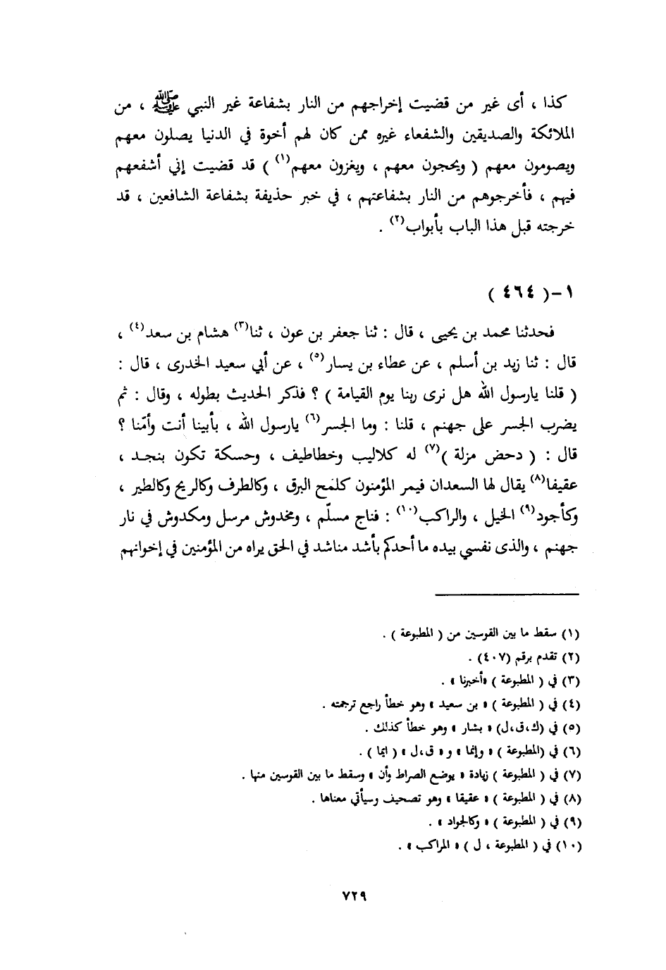 كَذَا، أَيْ غَيْرَ مَنْ قَضَيْتُ إِخْرَاجَهُمْ مِنَ النَّارِ بِشَفَاعَةِ غَيْرِ النَّبِيِّ صَلَّى اللهُ عَلَيْهِ وَسَلَّمَ، مِنَ الْمَلَائِكَةِ وَالصِّدِّيقِينَ وَالشُّفَعَاءِ غَيْرَهُ مِمَّنْ كَانَ لَهُمْ أُخُوَّةٌ فِي الدُّنْيَا يُصَلُّونَ مَعَهُمْ وَيَصُومُونَ مَعَهُمْ وَيَحُجُّونَ مَعَهُمْ، وَيَغْزُونَ مَعَهُمْ قَدْ قَضَيْتُ أَنِّي أُشَفِّعُهُمْ فِيهِمْ، فَأَخْرِجُوهُمْ مِنَ النَّارِ بِشَفَاعَتِهِمْ، فِي خَبَرِ حُذَيْفَةَ بِشَفَاعَةِ الشَّافِعِينَ، قَدْ خَرَّجْتُهُ قَبْلَ هَذَا الْبَابِ بِأَبْوَابٍ