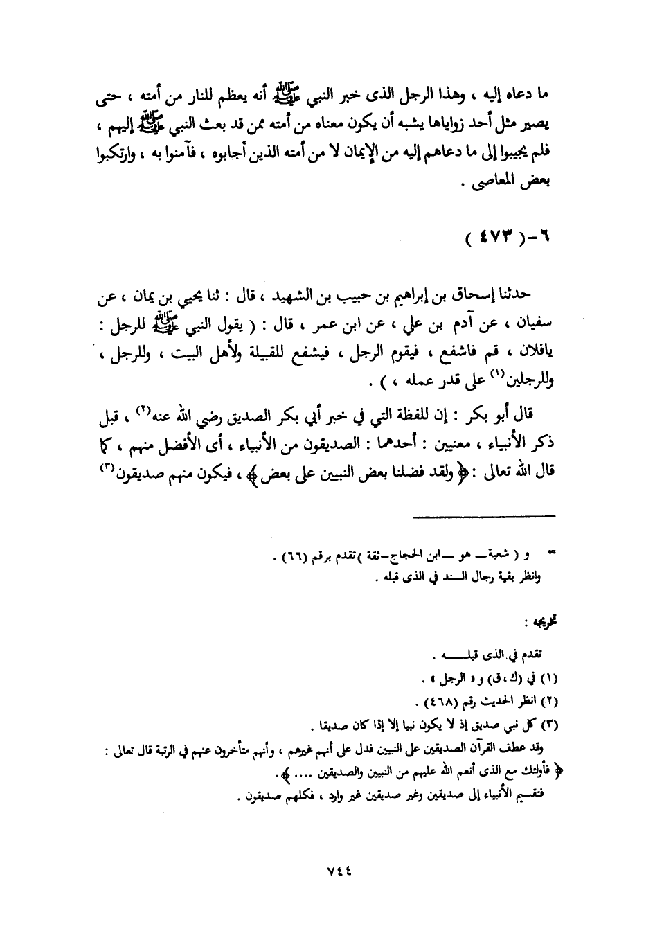 حَدَّثَنَا إِسْحَاقُ بْنُ إِبْرَاهِيمَ بْنِ حَبِيبِ بْنِ الشَّهِيدِ، قَالَ: ثَنَا يَحْيَى بْنُ يَمَانٍ، عَنْ سُفْيَانَ، عَنْ آدَمَ بْنِ عَلِيٍّ، عَنِ ابْنِ عُمَرَ، قَالَ: " يَقُولُ النَّبِيُّ صَلَّى اللهُ عَلَيْهِ وَسَلَّمَ لِلرَّجُلِ: يَا فُلَانُ، قُمْ فَاشْفَعْ، §فَيَقُومُ الرَّجُلُ، فَيَشْفَعُ لِلْقَبِيلَةِ وَلِأَهْلِ الْبَيْتِ، وَلِلرَّجُلِ، وَلِلرَّجُلَيْنِ عَلَى قَدْرِ عَمَلِهِ " قَالَ أَبُو بَكْرٍ: إِنَّ لِلَّفْظَةِ الَّتِي فِي خَبَرِ أَبِي بَكْرٍ الصِّدِّيقٍ رَضِيَ اللَّهُ عَنْهُ، قَبْلَ ذِكْرِ الْأَنْبِيَاءِ، مَعْنَيَيْنِ: أَحَدُهُمَا: الصِّدِّيقُونَ مِنَ الْأَنْبِيَاءِ، أَيِ الْأَفْضَلُ مِنْهُمْ، كَمَا قَالَ اللَّهُ تَعَالَى: {وَلَقَدْ فَضَّلْنَا بَعْضَ النَّبِيِّينَ عَلَى بَعْضٍ} [الإسراء: 55] ، فَيَكُونُ مِنْهُمْ صِدِّيقُونَ -[745]- بَعْدَ نَبِيِّنَا الْمُصْطَفَى صَلَّى اللهُ عَلَيْهِ وَسَلَّمَ، ثُمَّ يُقَالُ: ادْعُ الْأَنْبِيَاءَ أَيْ غَيْرَ الصِّدِّيقِينَ الَّذِينَ قَدْ شُفِّعُوا قَبْلُ، وَالْمَعْنَى الثَّانِي: أَنَّ الصِّدِّيقِينَ مِنْ هَذِهِ الْأُمَّةِ مَنْ يَأْمُرُهُمُ النَّبِيُّ صَلَّى اللهُ عَلَيْهِ وَسَلَّمَ بِأَنْ يَشْفَعُوا، فَتَكُونُ هَذِهِ الشَّفَاعَةُ الَّتِي يَشْفَعُهَا الصِّدِّيقُونَ مِنْ أُمَّةِ النَّبِيِّ صَلَّى اللهُ عَلَيْهِ وَسَلَّمَ بِأَمْرِهِ، شَفَاعَةً لِلنَّبِيِّ صَلَّى اللهُ عَلَيْهِ وَسَلَّمَ مُضَافَةٌ إِلَيْهِ؛ لِأَنَّهُ الْآمِرُ، كَمَا قَدْ أَعْلَمْتُ فِي مَوَاضِعَ مِنْ كُتُبِي، أَنَّ الْفِعْلَ يُضَافُ إِلَى الْآمِرِ، كَإِضَافَتِهِ إِلَى الْفَاعِلِ، فَتَكُونُ هَذِهِ الشَّفَاعَةُ مُضَافَةً إِلَى النَّبِيِّ صَلَّى اللهُ عَلَيْهِ وَسَلَّمَ، لِأَمْرِهِ بِهَا، وَمُضَافَةً إِلَى الْمَأْمُورِ بِهَا، فَيَشْفَعُ؛ لِأَنَّهُ الشَّافِعُ بِأَمْرِ النَّبِيِّ صَلَّى اللهُ عَلَيْهِ وَسَلَّمَ