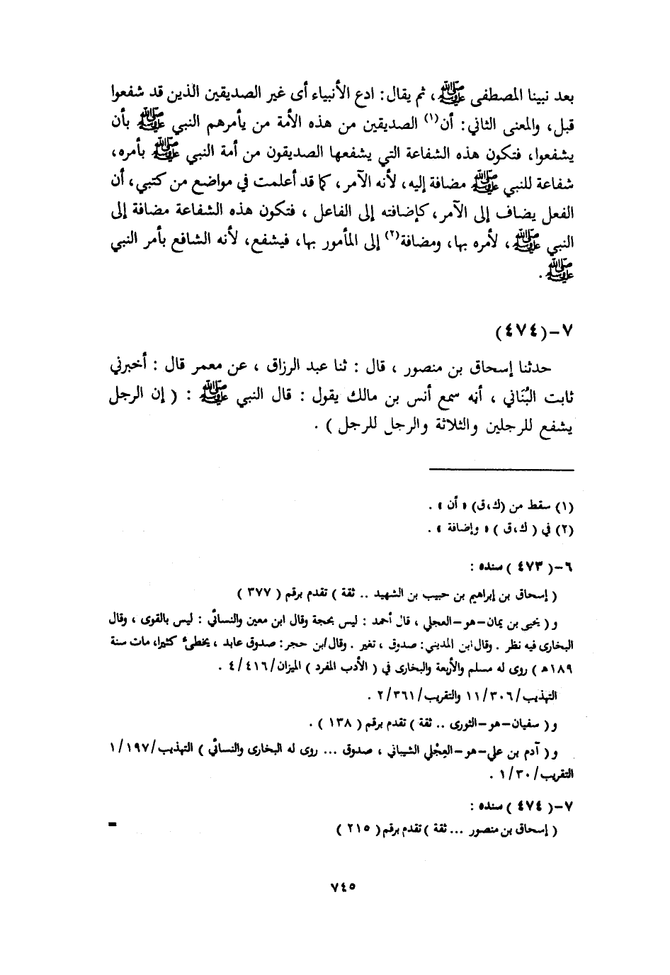 حَدَّثَنَا إِسْحَاقُ بْنُ مَنْصُورٍ، قَالَ: ثَنَا عَبْدُ الرَّزَّاقِ، عَنْ مَعْمَرٍ، قَالَ: أَخْبَرَنِي ثَابِتٌ الْبُنَانِيُّ، أَنَّهُ سَمِعَ أَنَسَ بْنَ مَالِكٍ، يَقُولُ: قَالَ النَّبِيُّ صَلَّى اللهُ عَلَيْهِ وَسَلَّمَ: «§إِنَّ الرَّجُلَ يَشْفَعُ لِلرَّجُلَيْنِ وَالثَّلَاثَةِ وَالرَّجُلُ لِلرَّجُلِ»